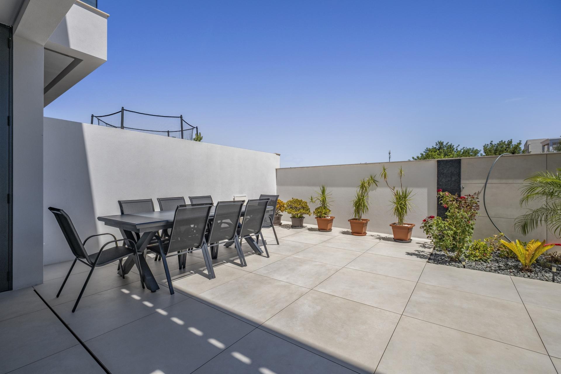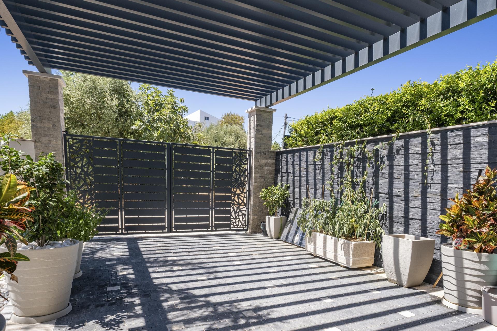 The home spans two levels and features a bright open-plan living and dining area with sliding doors that lead to a large terrace and garden. The fully equipped kitchen includes premium appliances, integrated cabinetry, and seamless design, while a separate laundry room adds practicality. There are four spacious bedrooms, each with fitted wardrobes and private balconies. The master suite boasts a walk-in closet and an en-suite bathroom with modern fixtures. A ground-floor bedroom and guest bathroom offer flexibility for family, guests, or office use.