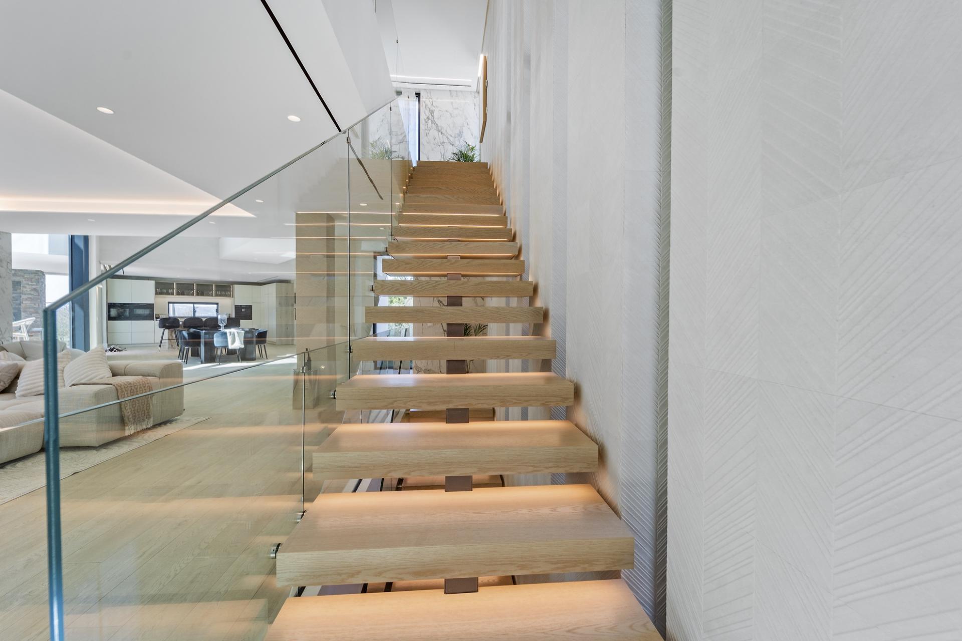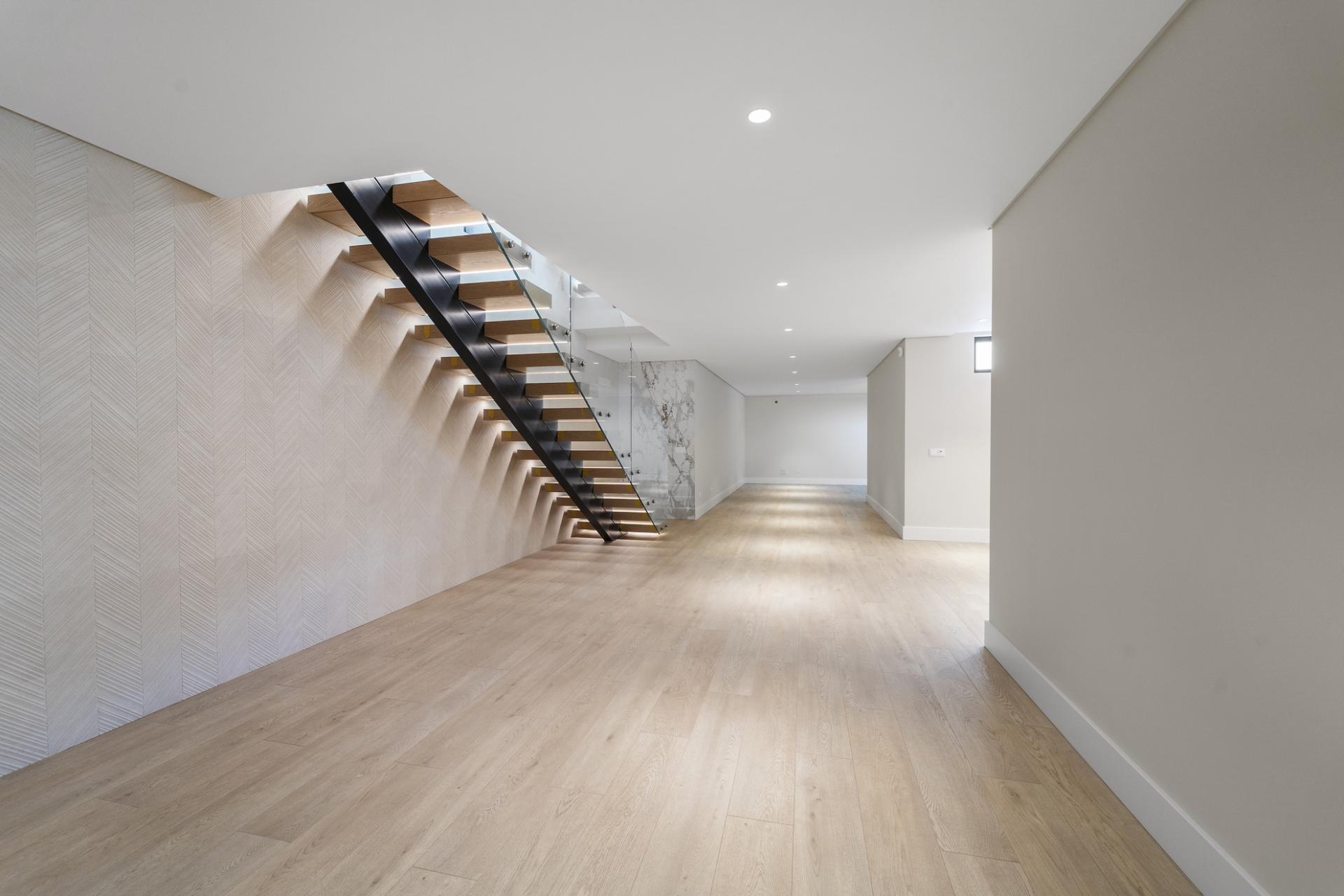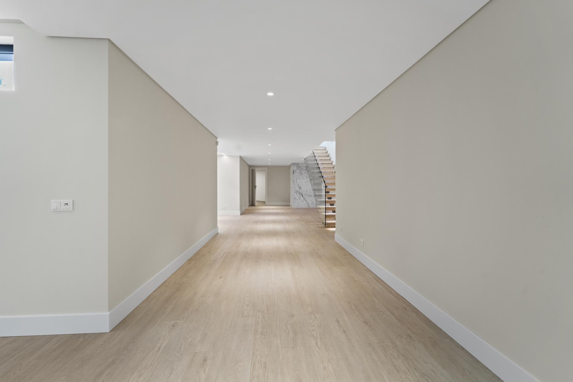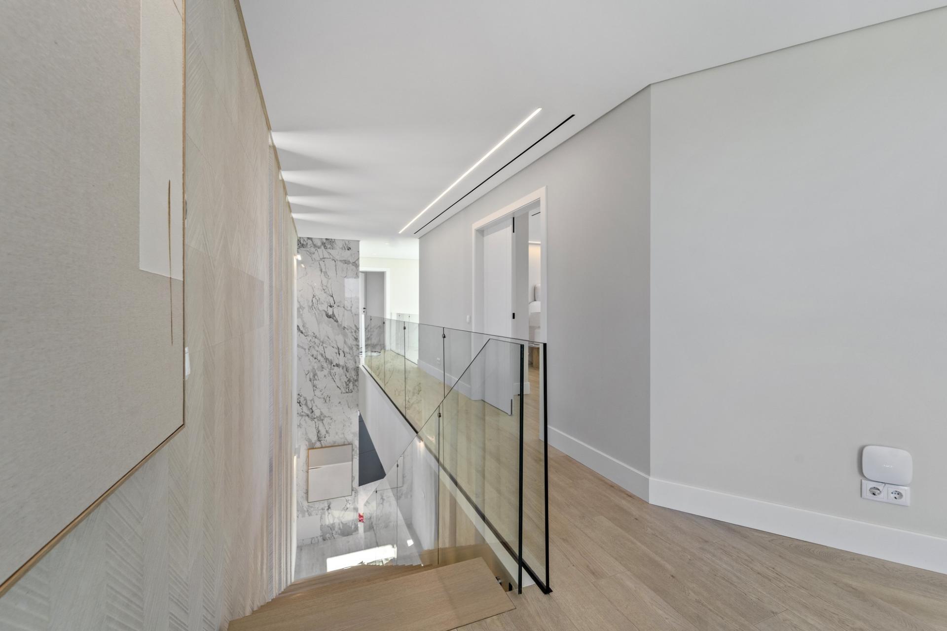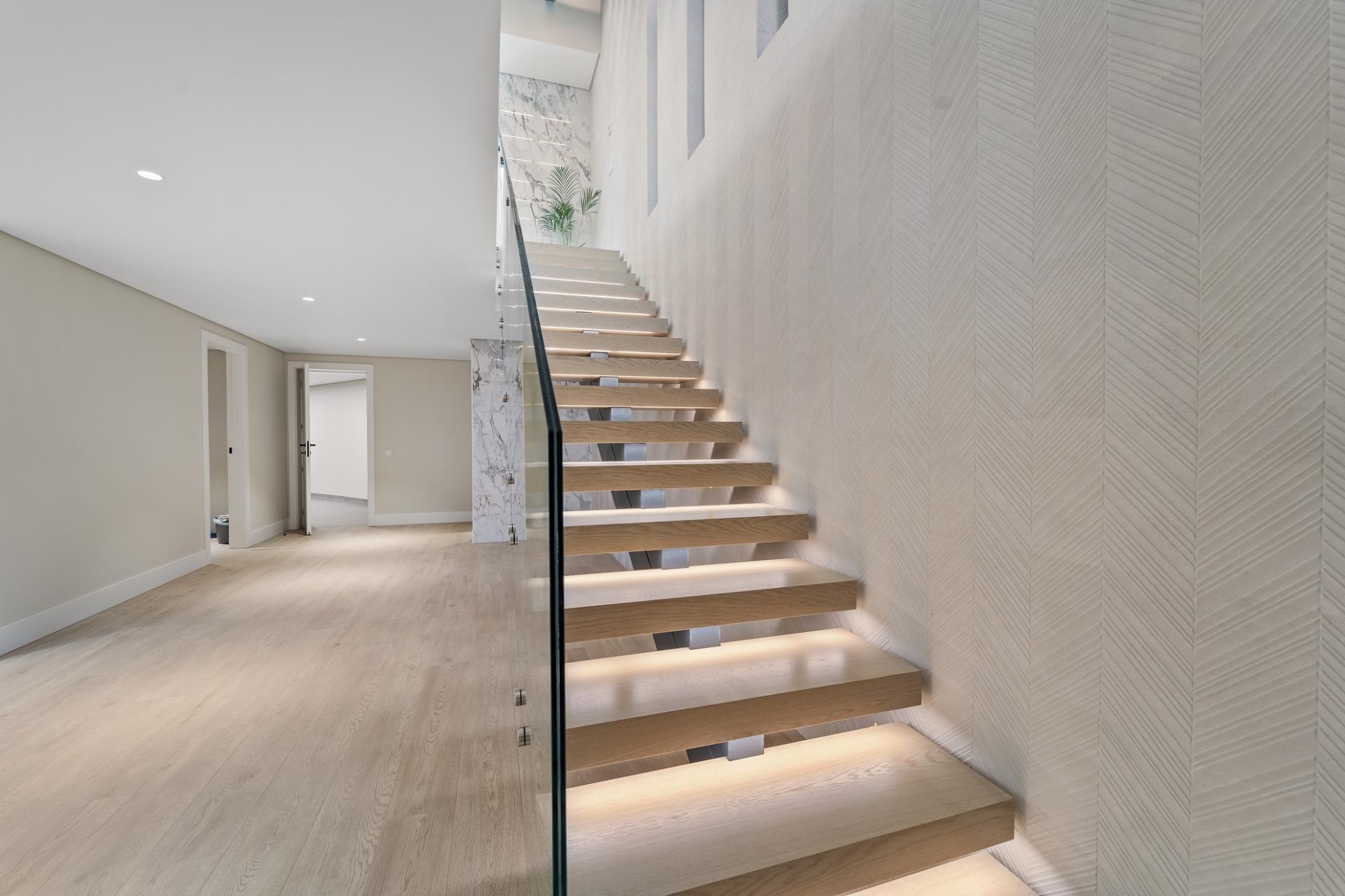 Desenvolvida em três pisos, a moradia apresenta um átrio de entrada em dupla altura e uma escada suspensa como elemento central. As amplas portas de vidro do chão ao tecto enquadram a sala em open space e a cozinha de design, equipada com ilha central e balcão para pequeno-almoço. Todos os espaços são acabados com elevado padrão de qualidade, combinando materiais nobres com elegância funcional.