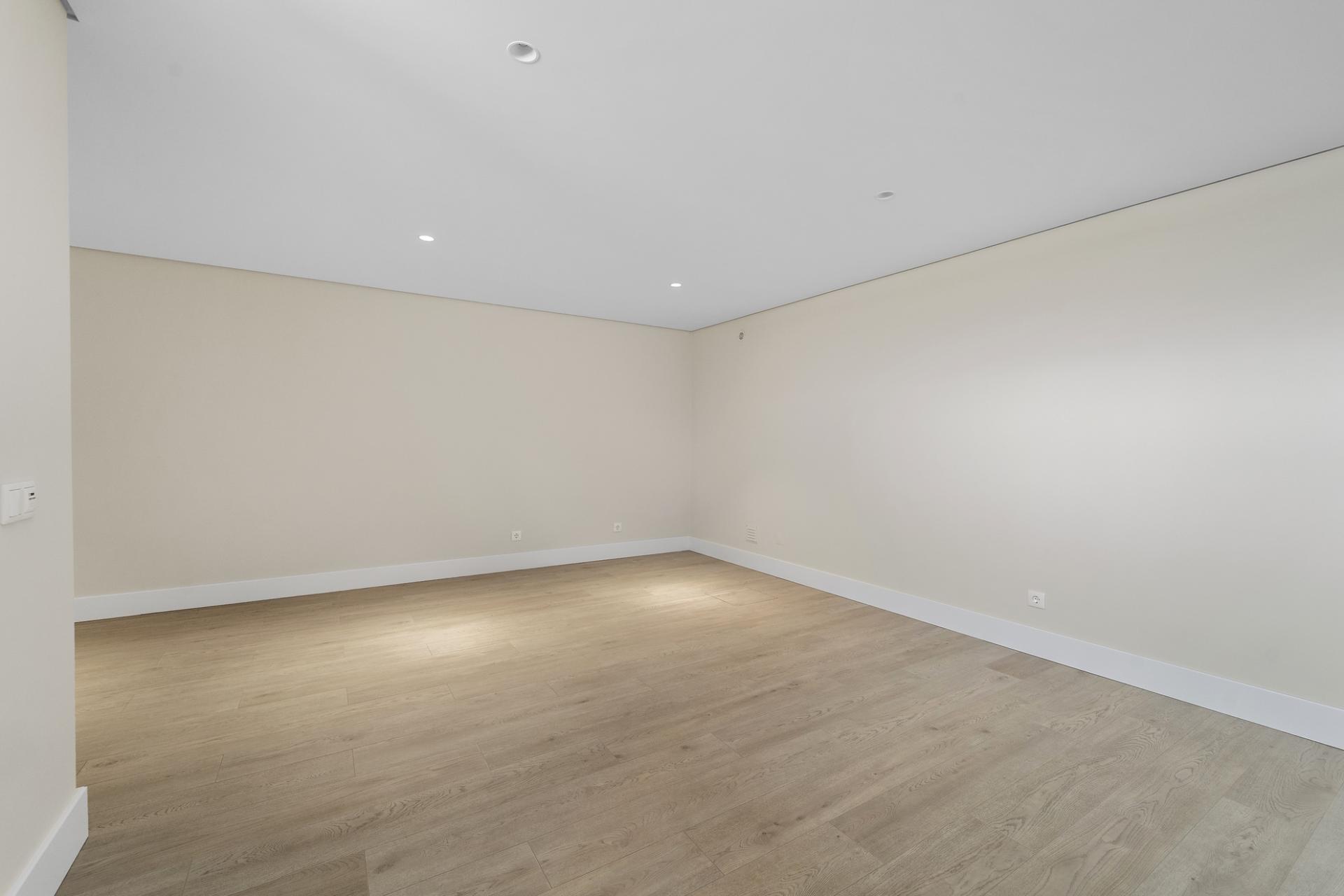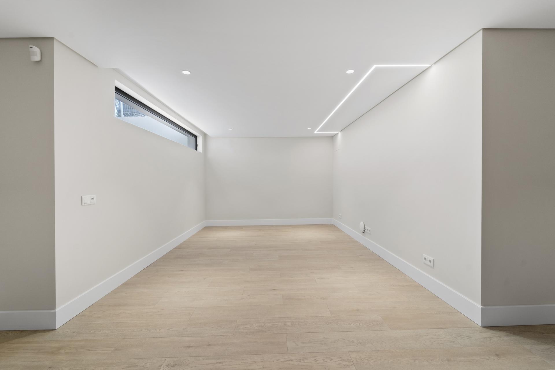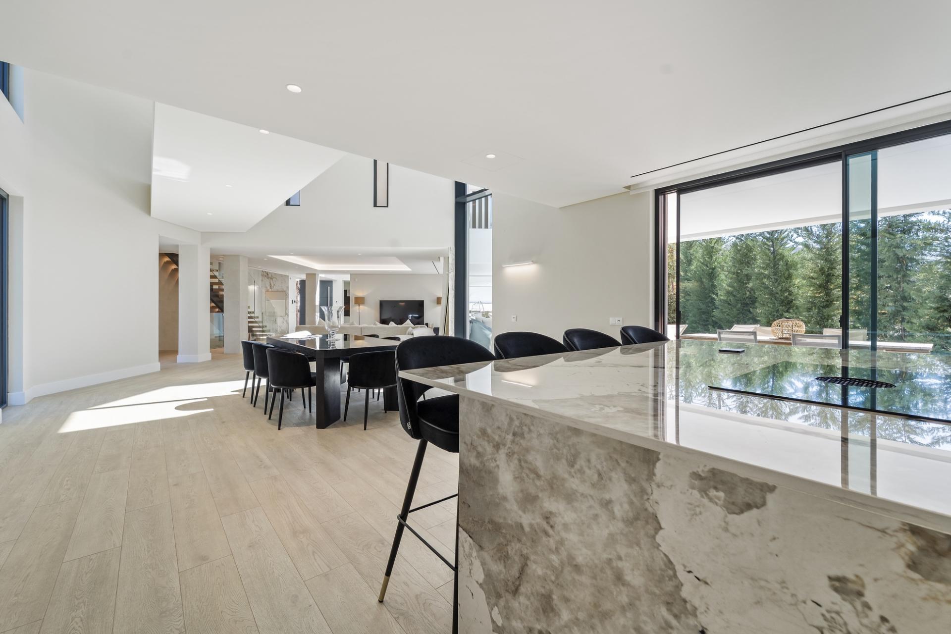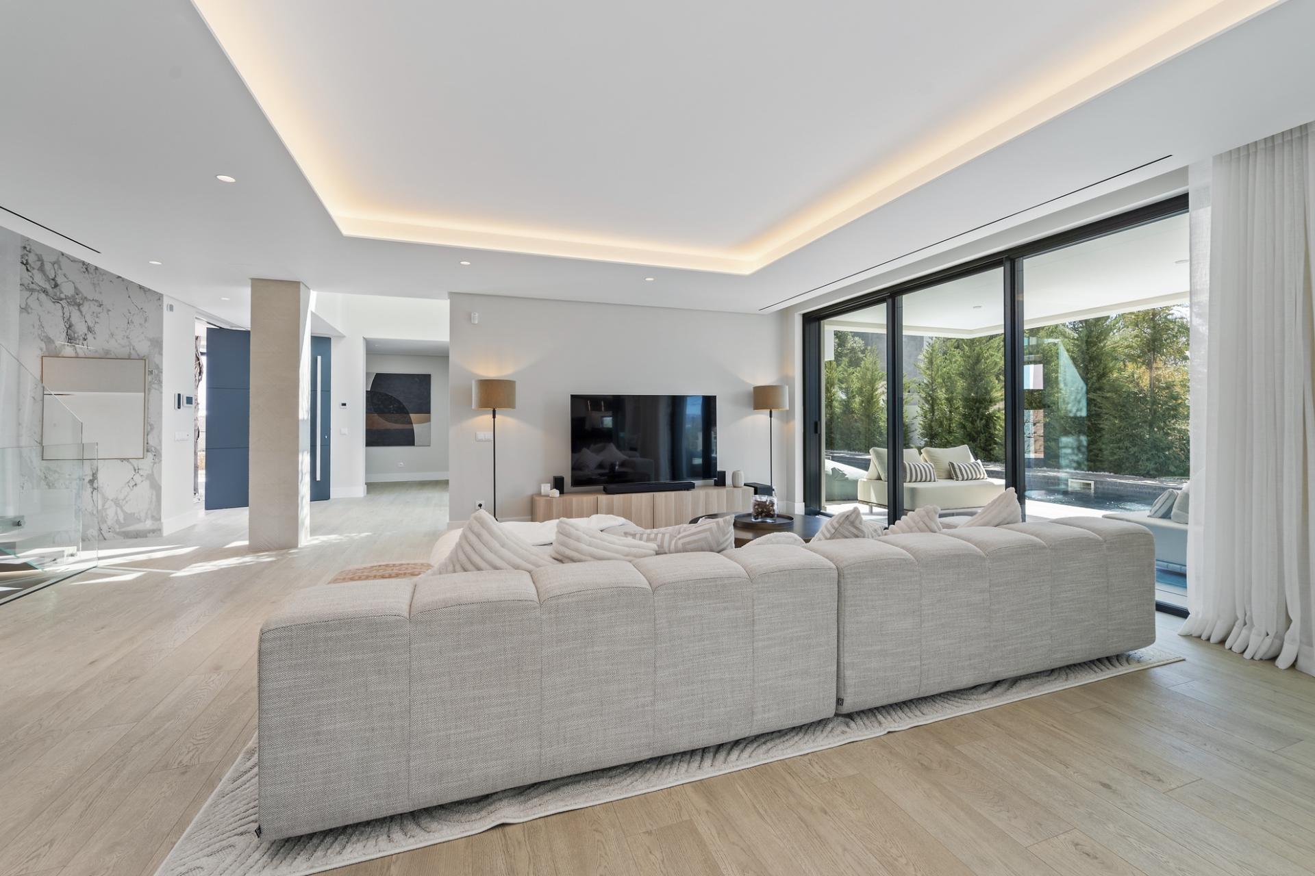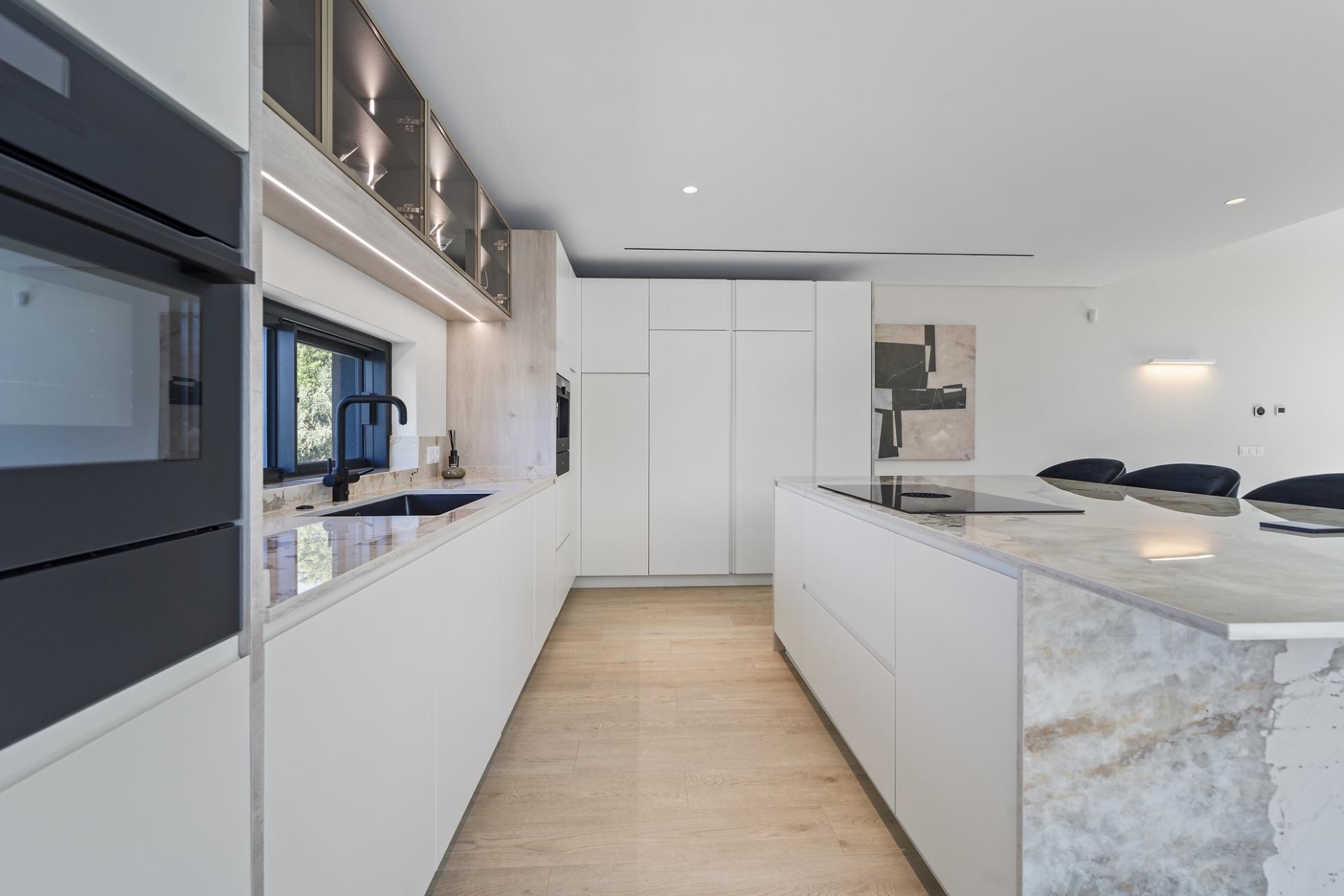 Desenvolvida em três pisos, a moradia apresenta um átrio de entrada em dupla altura e uma escada suspensa como elemento central. As amplas portas de vidro do chão ao tecto enquadram a sala em open space e a cozinha de design, equipada com ilha central e balcão para pequeno-almoço. Todos os espaços são acabados com elevado padrão de qualidade, combinando materiais nobres com elegância funcional.