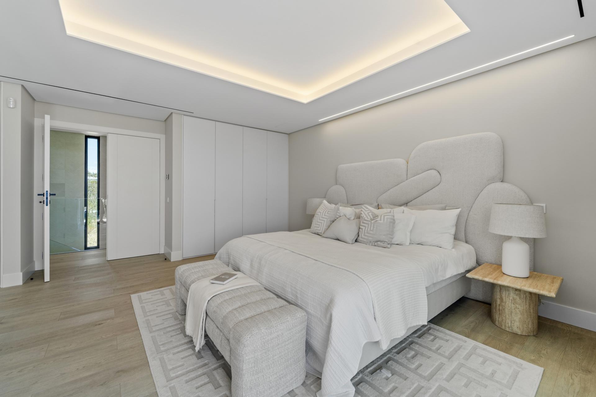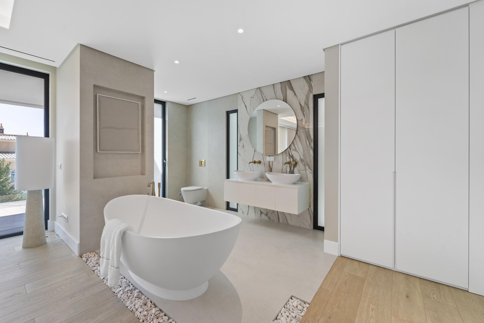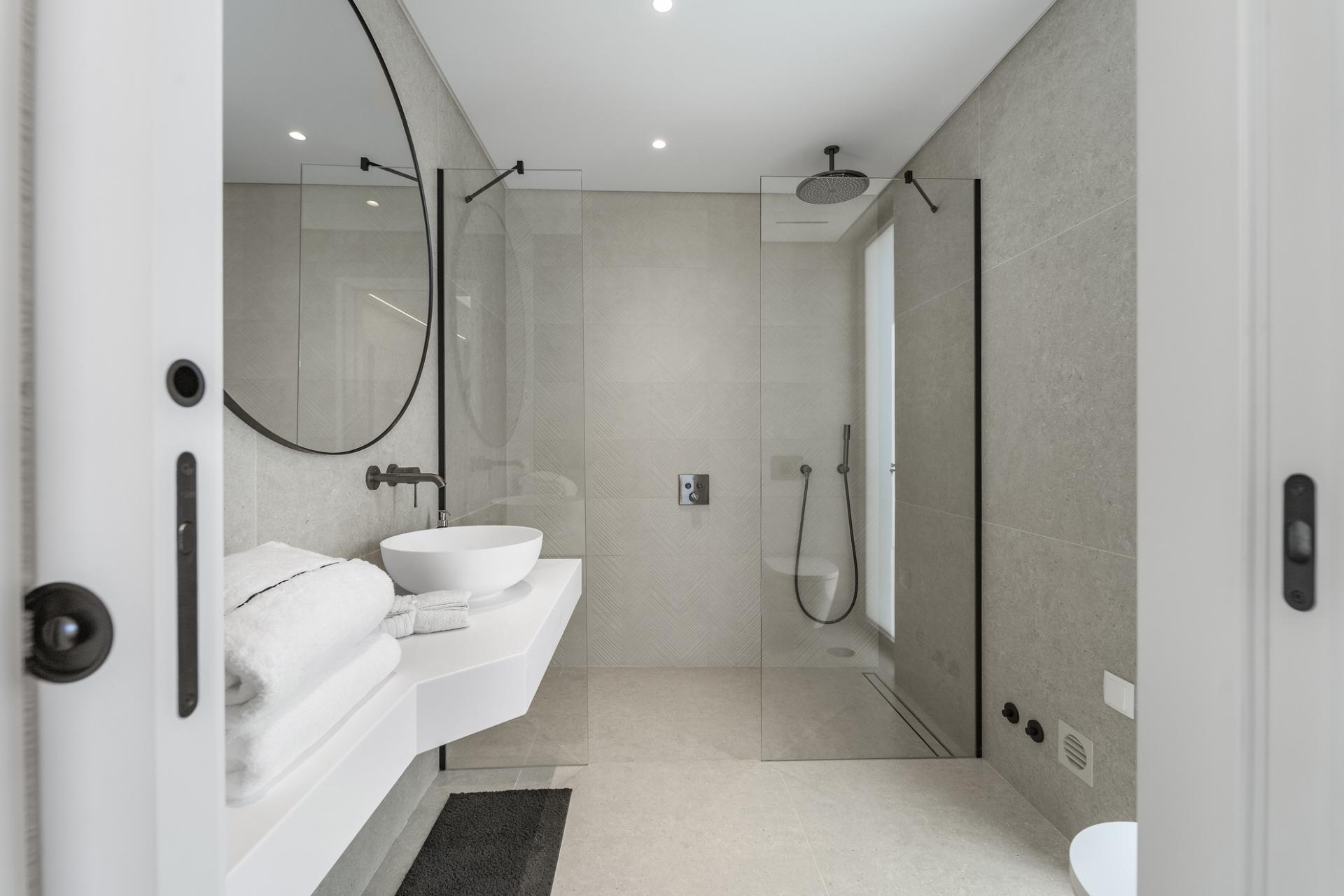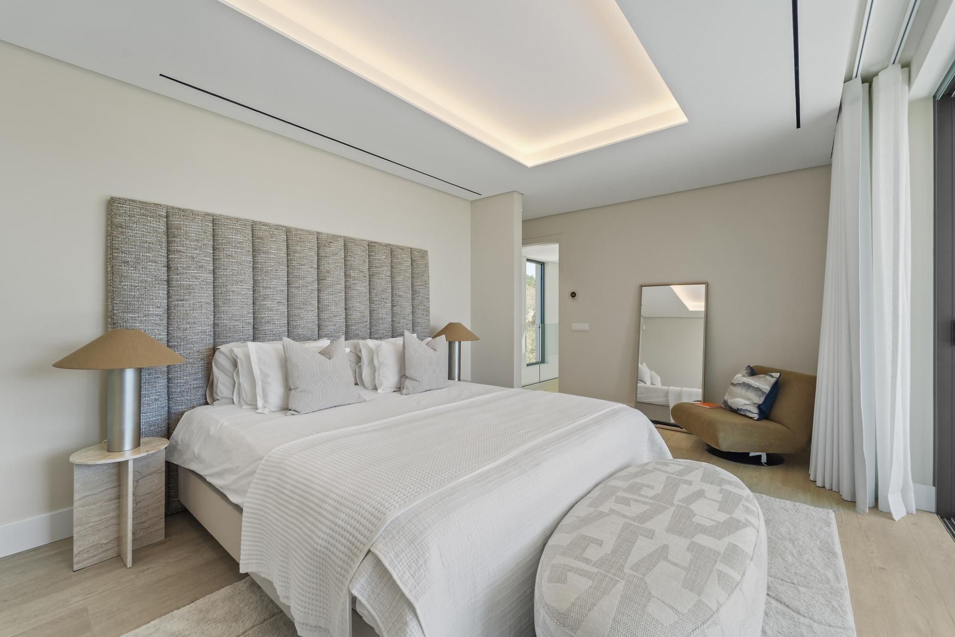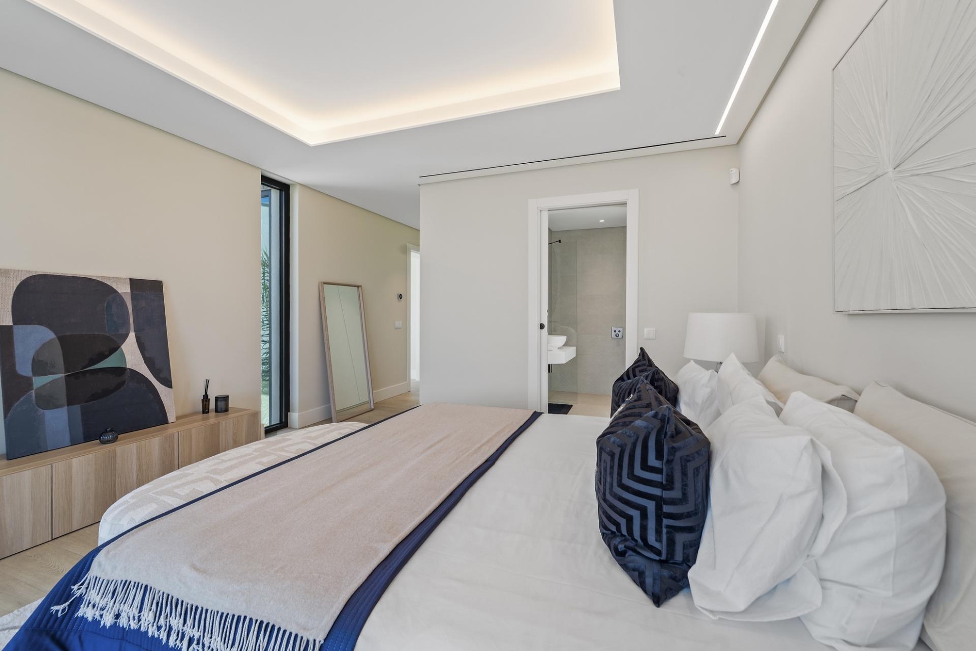 Os quatro quartos são todos em suite, incluindo uma impressionante master suite no piso superior. Esta dispõe de um terraço privativo, closet com ilha central e casa de banho ao estilo spa. No piso inferior, a moradia oferece uma ampla garagem, WC de apoio, lavandaria e áreas adicionais – perfeitas para criar uma sala de cinema, ginásio, spa ou garrafeira.
