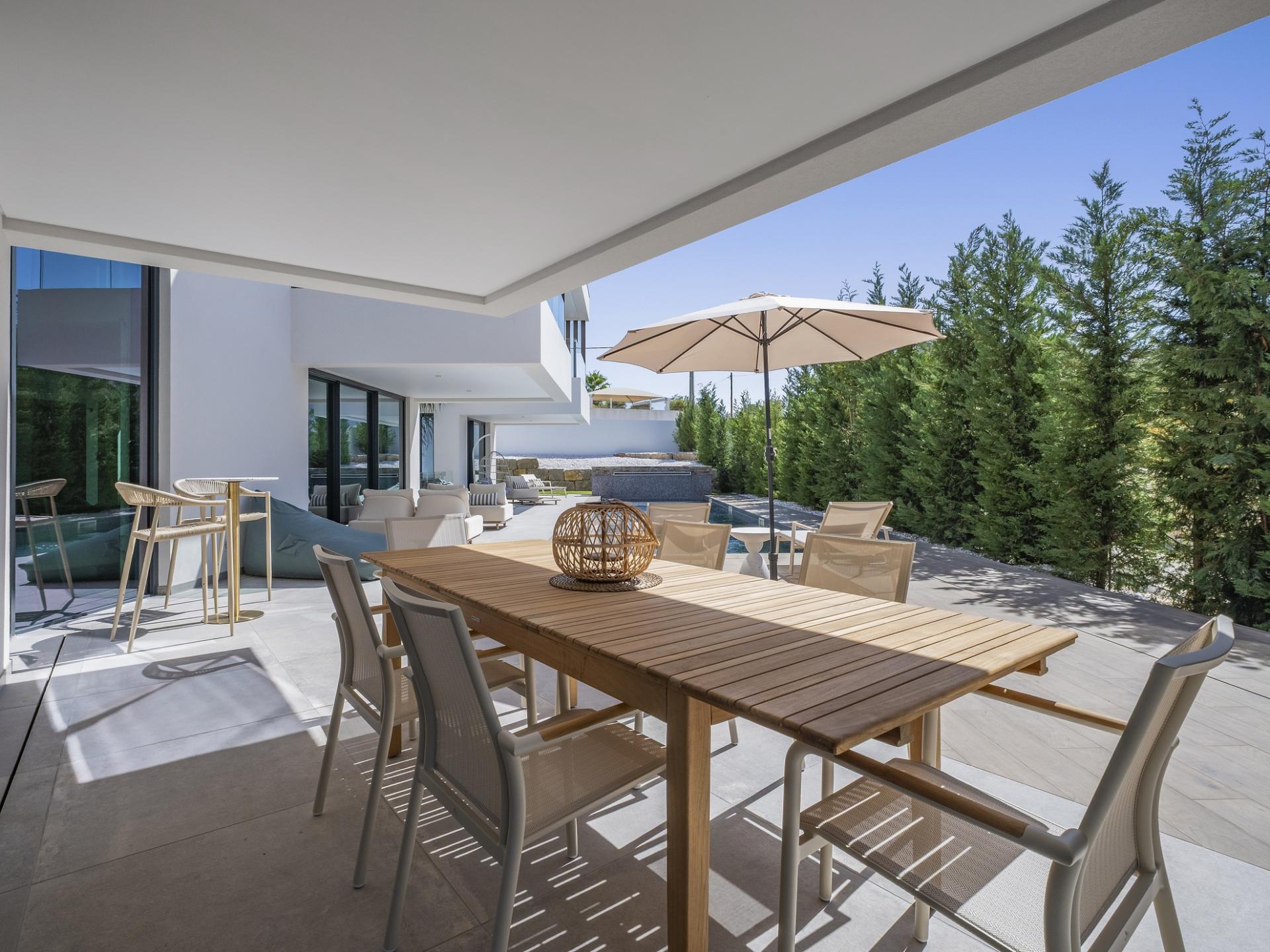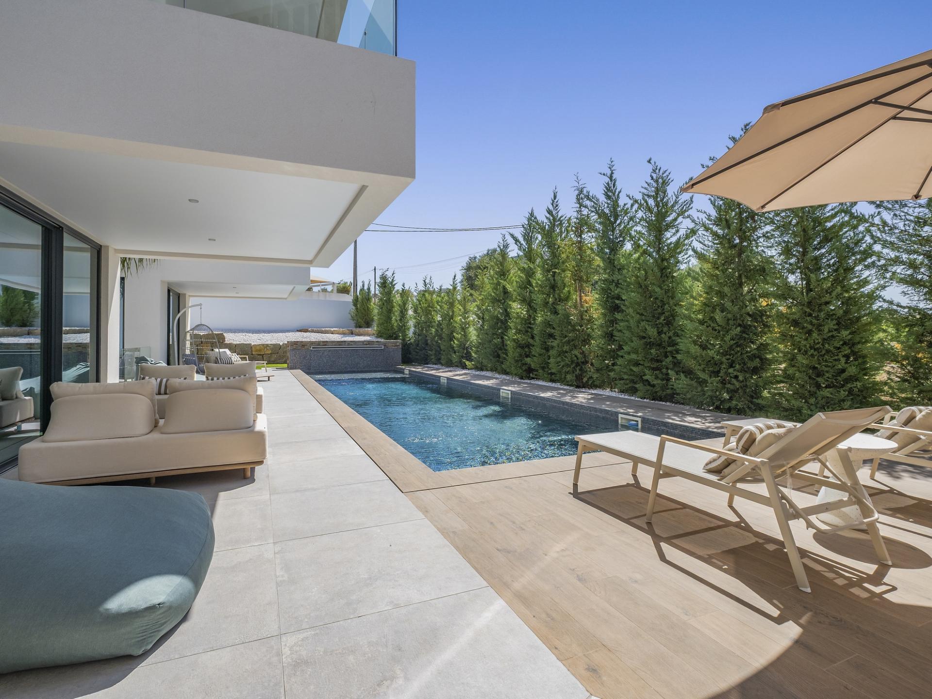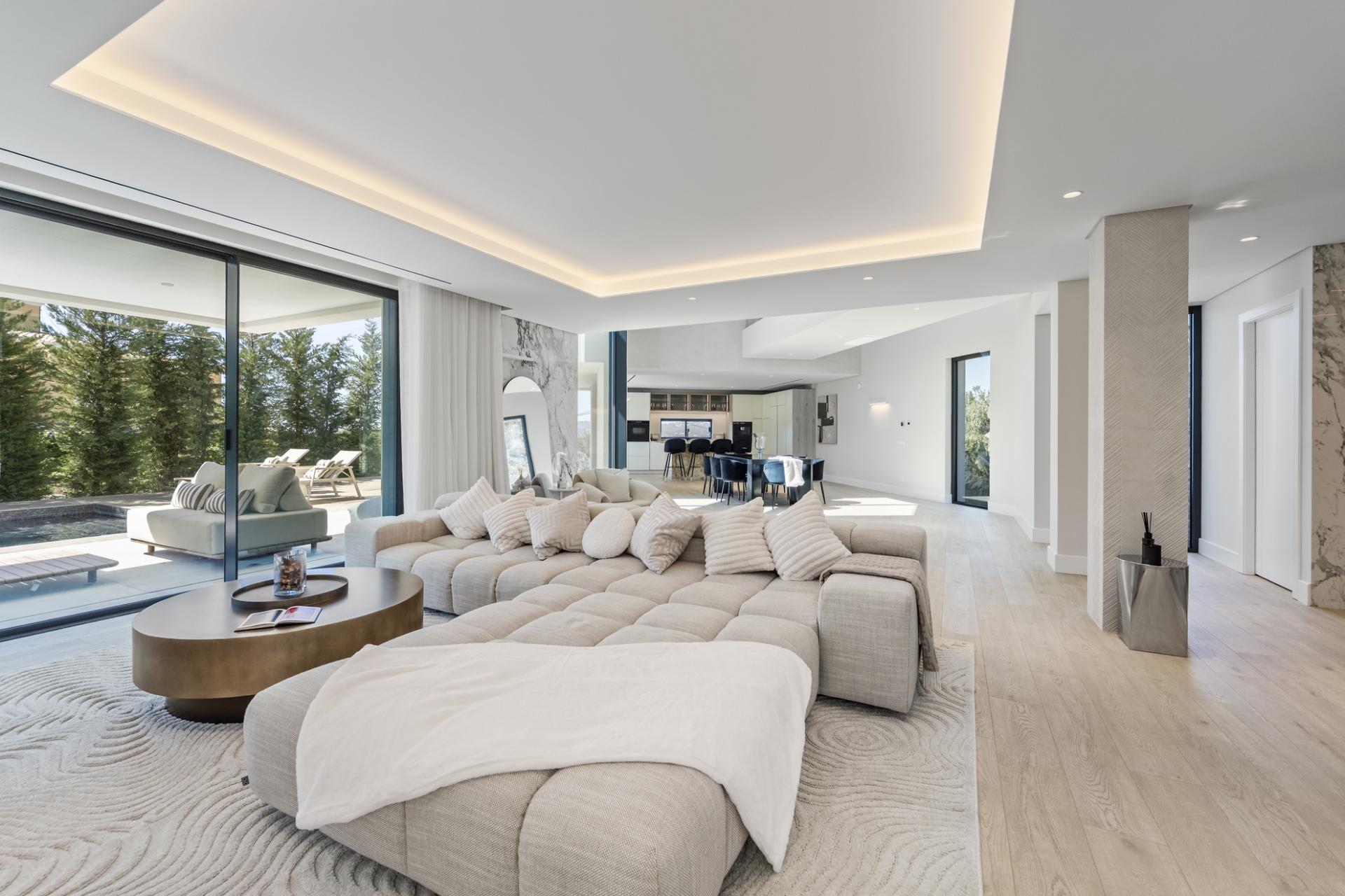 Auf drei Ebenen konzipiert, verfügt die Villa über einen doppelt hohen Eingangsbereich und eine freischwebende Treppe im Zentrum. Großflächige Glasfronten vom Boden bis zur Decke rahmen das offene Wohnzimmer und die Designerküche, die mit einer zentralen Kochinsel und Frühstücksbar ausgestattet ist. Alle Bereiche sind mit hochwertigen Materialien und funktionaler Eleganz gestaltet.