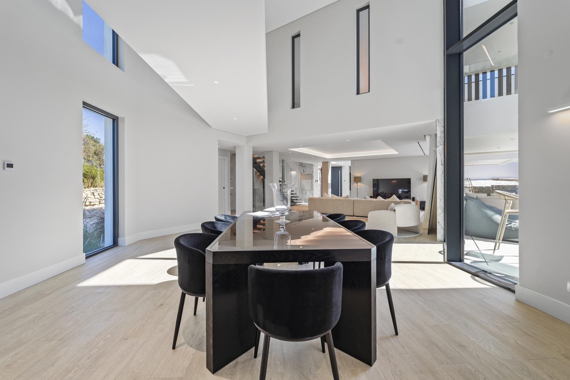 Répartie sur trois niveaux, la villa s’ouvre sur un hall d’entrée en double hauteur, sublimé par un escalier flottant. De larges baies vitrées du sol au plafond inondent le séjour de lumière et mettent en valeur la cuisine design, équipée d’un îlot central et d’un bar pour le petit-déjeuner. Les finitions haut de gamme marient élégance contemporaine et qualité des matériaux.
