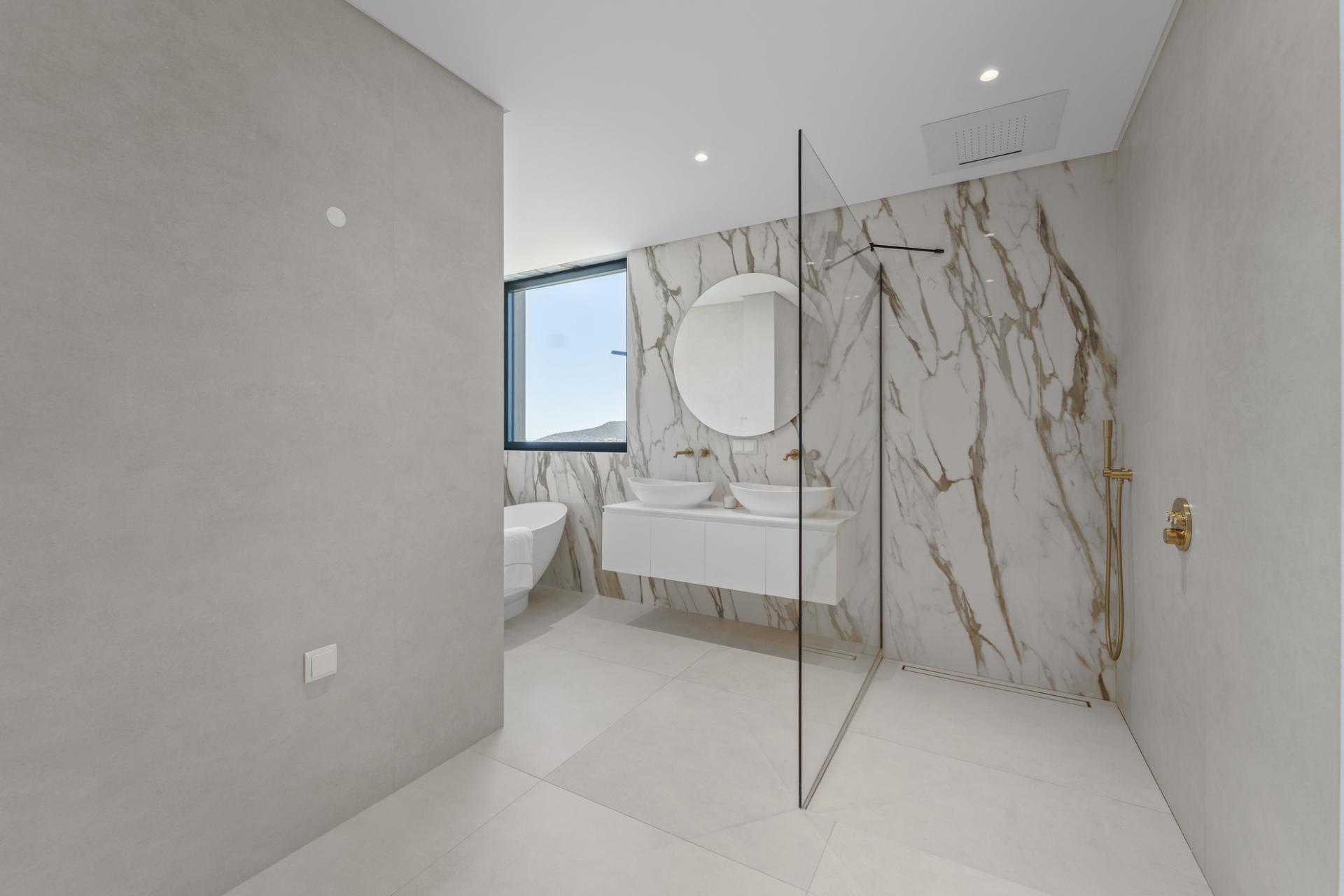 The four spacious bedrooms are all en-suite, including a standout principal suite on the upper level. This suite features a private terrace, walk-in wardrobe with a central island, spa-style bathroom. On the lower level, the property offers a large garage, guest WC, utility room, and plenty of additional space—perfect for a home cinema, gym, spa, or wine cellar.