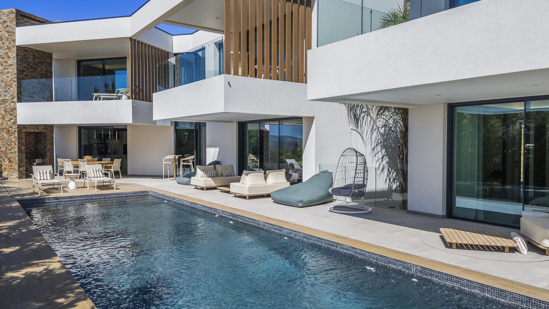 Designed across three levels, the villa features a double-height entrance and a floating staircase at its core. Expansive floor-to-ceiling glass doors frame the open-plan lounge and designer kitchen, which comes complete with a central island and breakfast bar. All areas are finished to a high standard, combining quality materials with functional elegance.