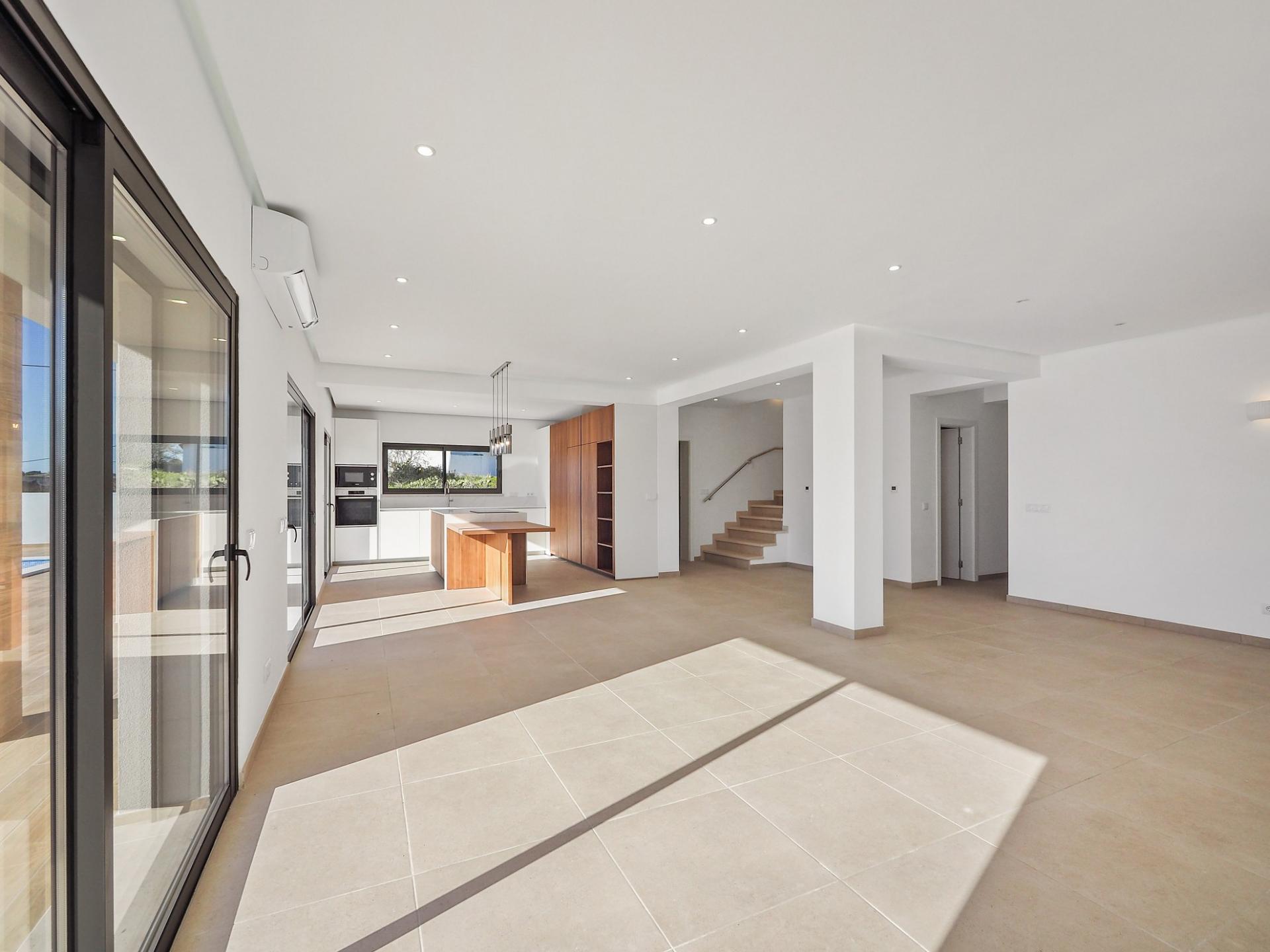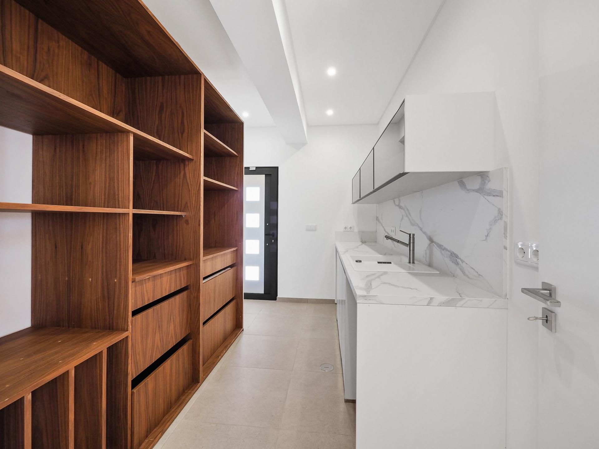 A welcoming hallway leads to an impressive open-plan kitchen, dining, and living area (57 m²), enhanced by large windows and patio doors that seamlessly connect to the pool and beautifully landscaped gardens.