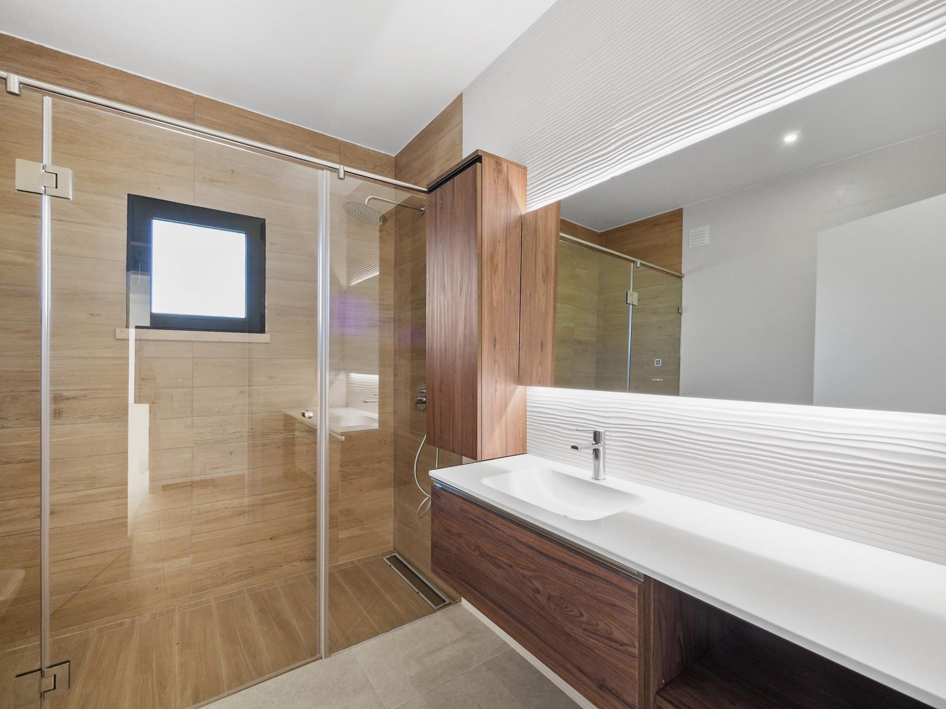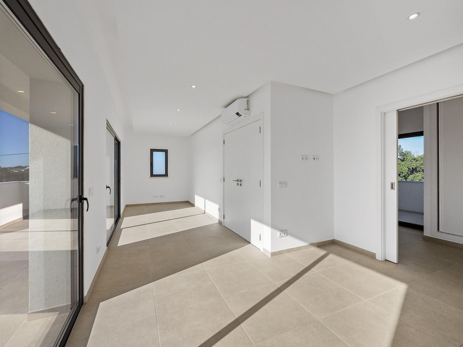 The ground floor hosts three ensuite bedrooms, each with direct access to the terrace. Upstairs, the master suite offers a true sanctuary, featuring a private terrace with distant sea views, a walk-in wardrobe, a reception area, and a spacious ensuite bathroom. A vast roof terrace, ideal for a jacuzzi and a relaxation lounge, crowns the property, providing a panoramic backdrop of the serene surroundings.