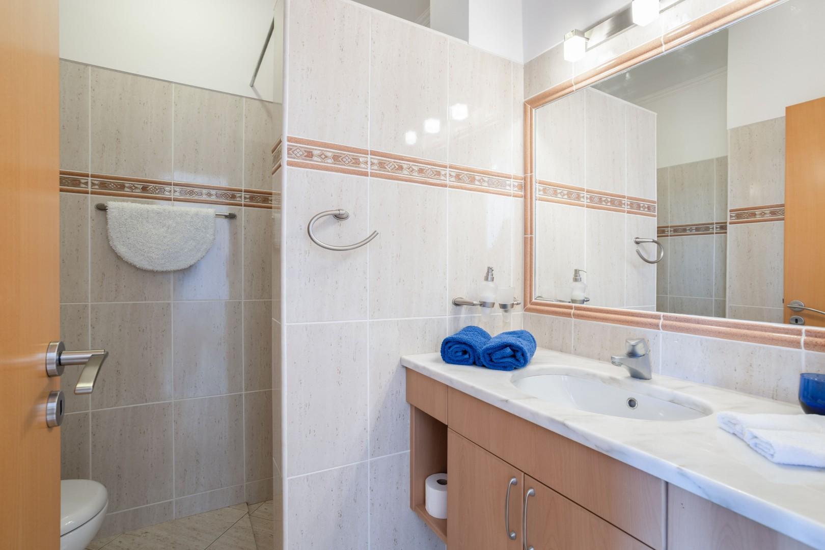 The 360 m² villa spans two levels, featuring spacious and sunlit interiors. The ground floor includes an impressive double-height entrance, a living room with floor-to-ceiling windows, a TV room, a formal dining area, and a fully equipped kitchen. One en-suite guest bedroom is conveniently located on this level, along with a utility and laundry room. Upstairs, you’ll find three further en-suite bedrooms, each opening onto a shared terrace with breathtaking sea and countryside views.