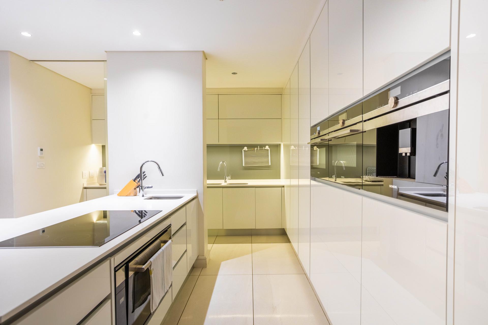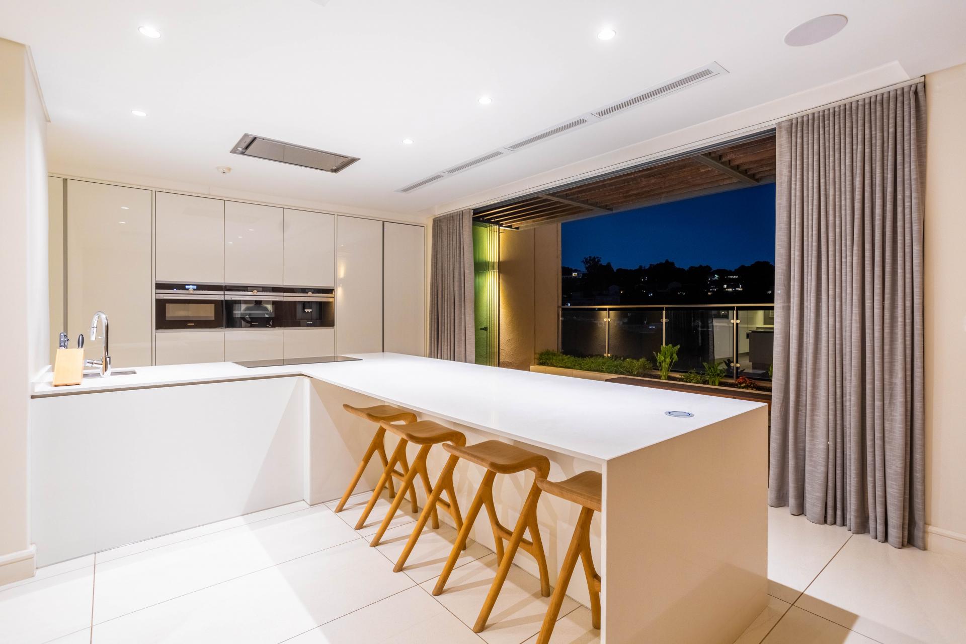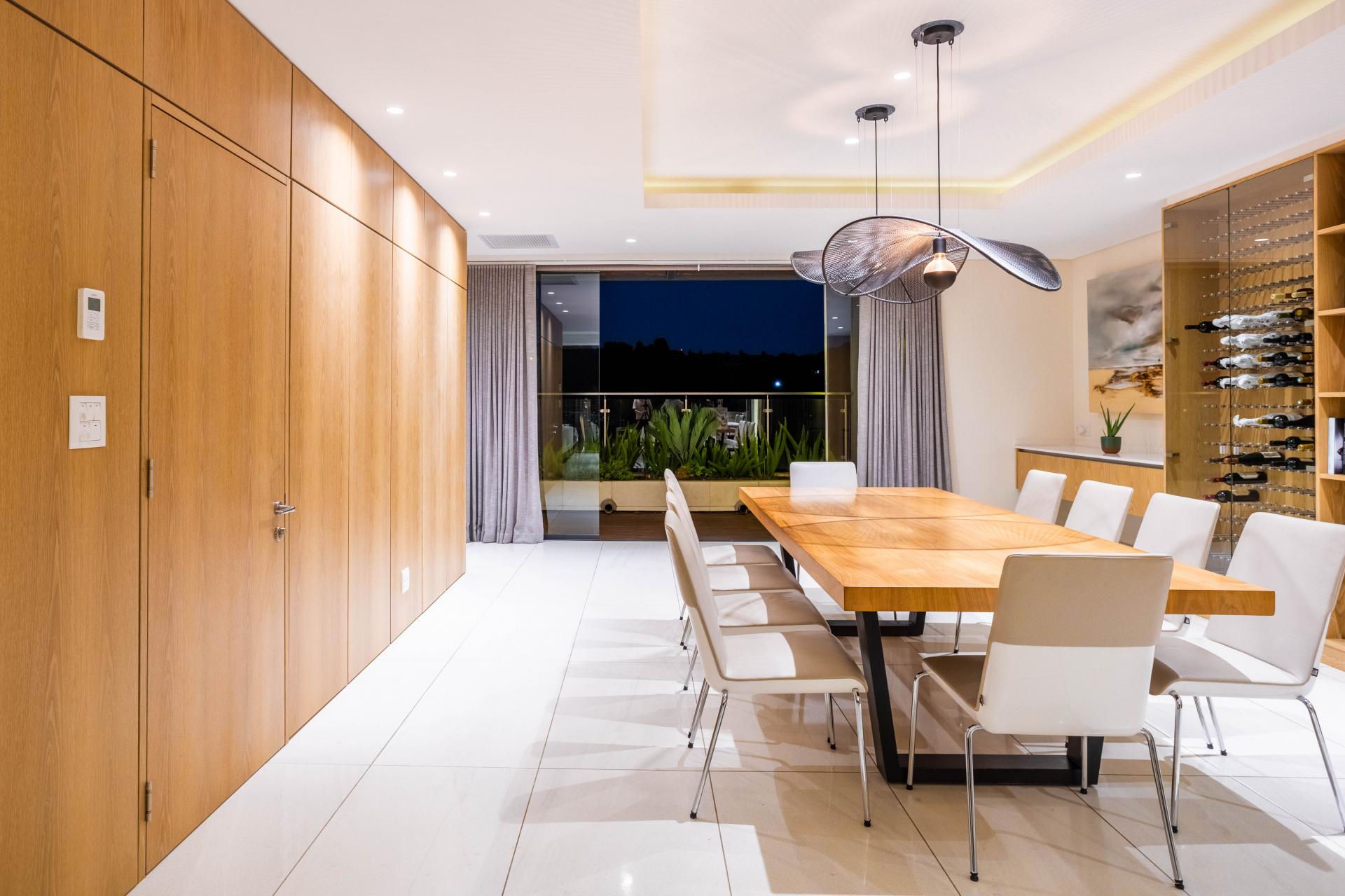 Step inside, and you'll find yourself enveloped in a world of comfort and sophistication. Spanning 2 levels, the lower housing your accommodation and private lounge, with the upper housing your living areas and terrace. Centralized heating and cooling systems ensure that every corner of your home is a sanctuary of comfort, while double-volume ceilings adorned with skylights bathe the space in natural light, creating an atmosphere of warmth and serenity. The kitchen, a masterpiece of design and functionality, boasts designer finishes and state-of-the-art appliances, inviting you to unleash your inner chef. And as day turns to night, retreat to the dining room, where a custom-made chandelier casts a soft glow over intimate gatherings, while a bespoke wine rack showcases your most prized vintages. Each living area boasts its own balcony to further explore the expanding views surrounding this illustrious abode.