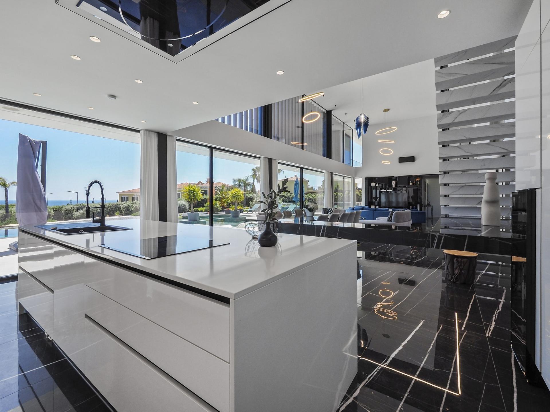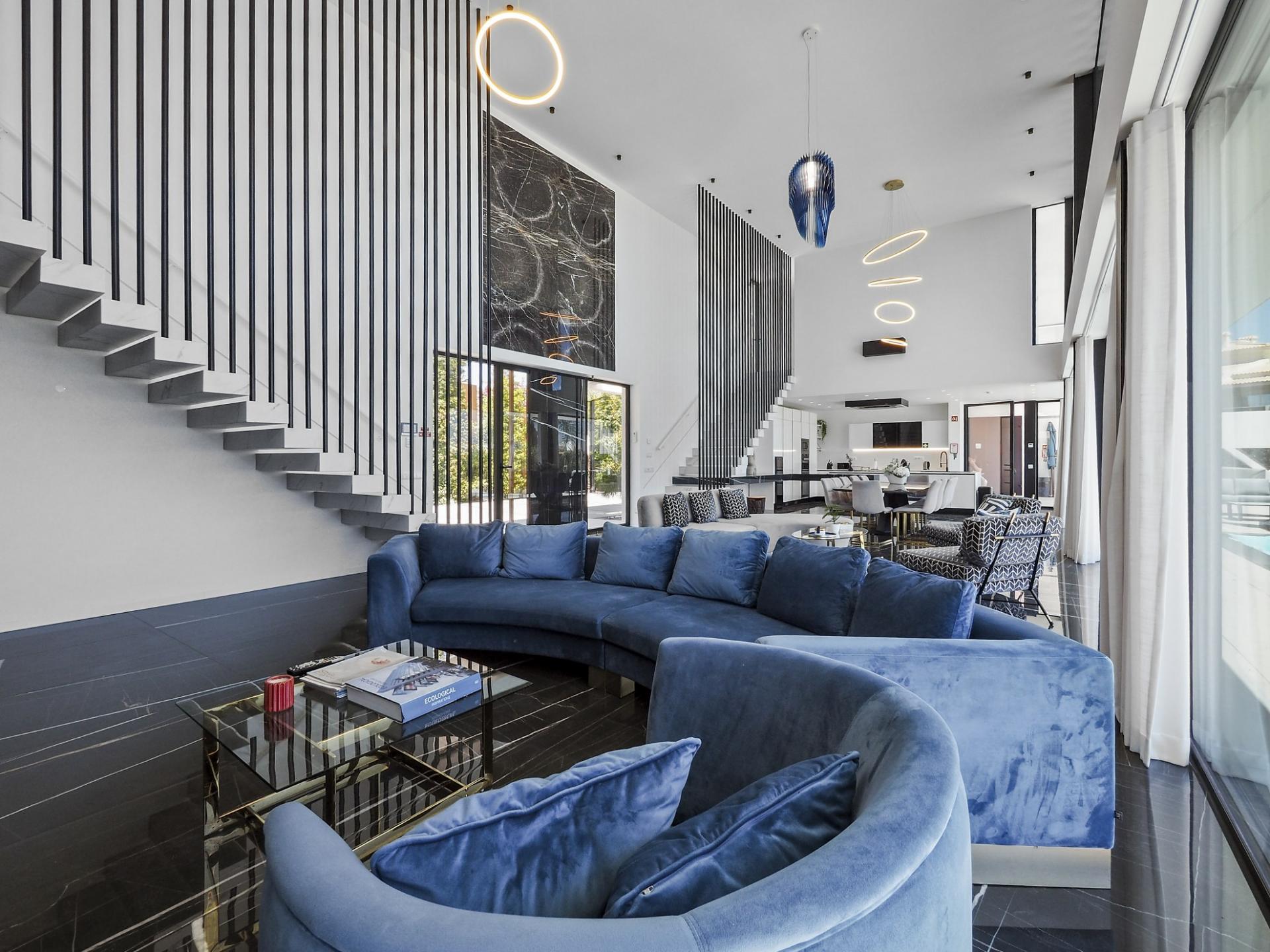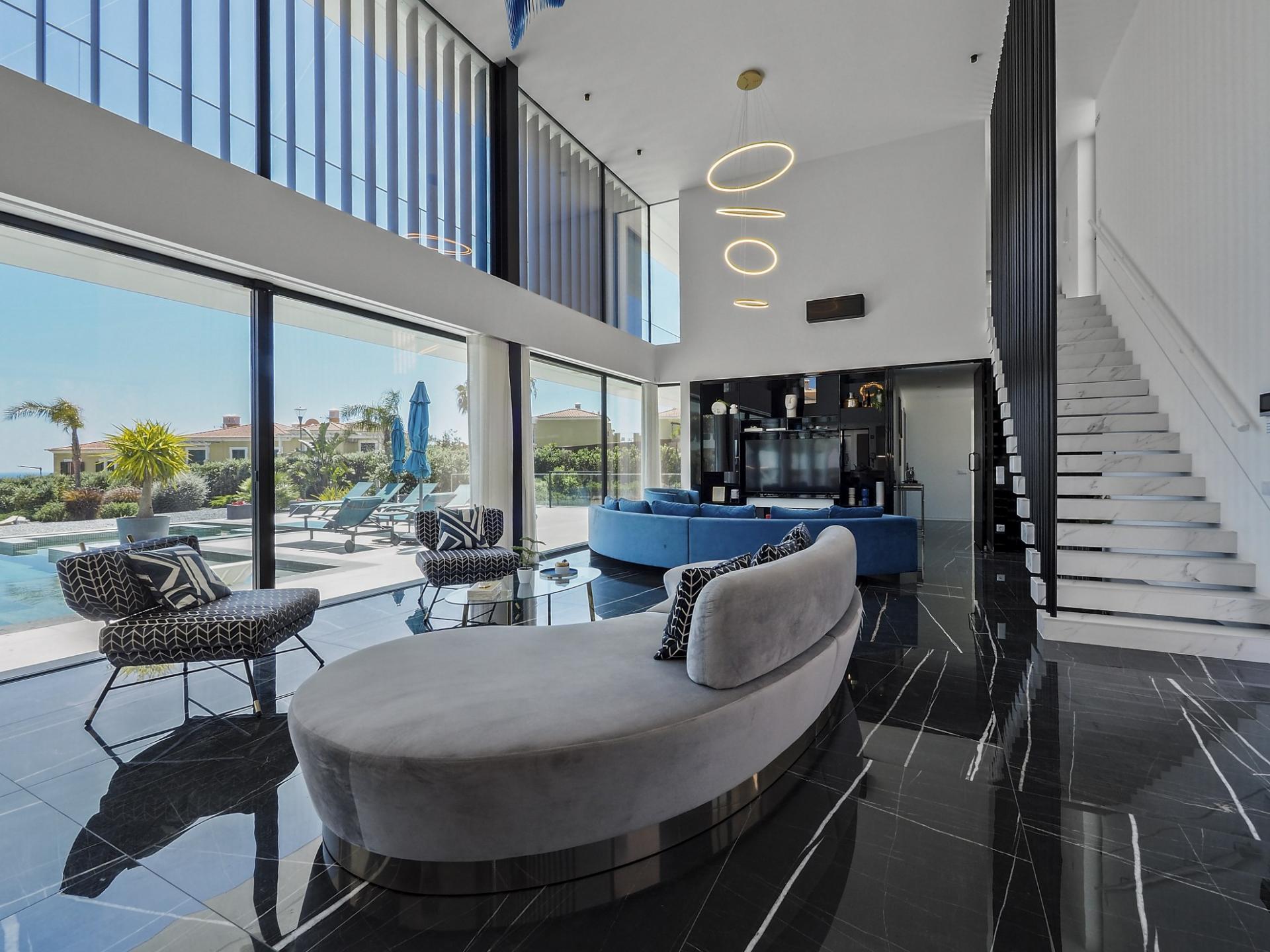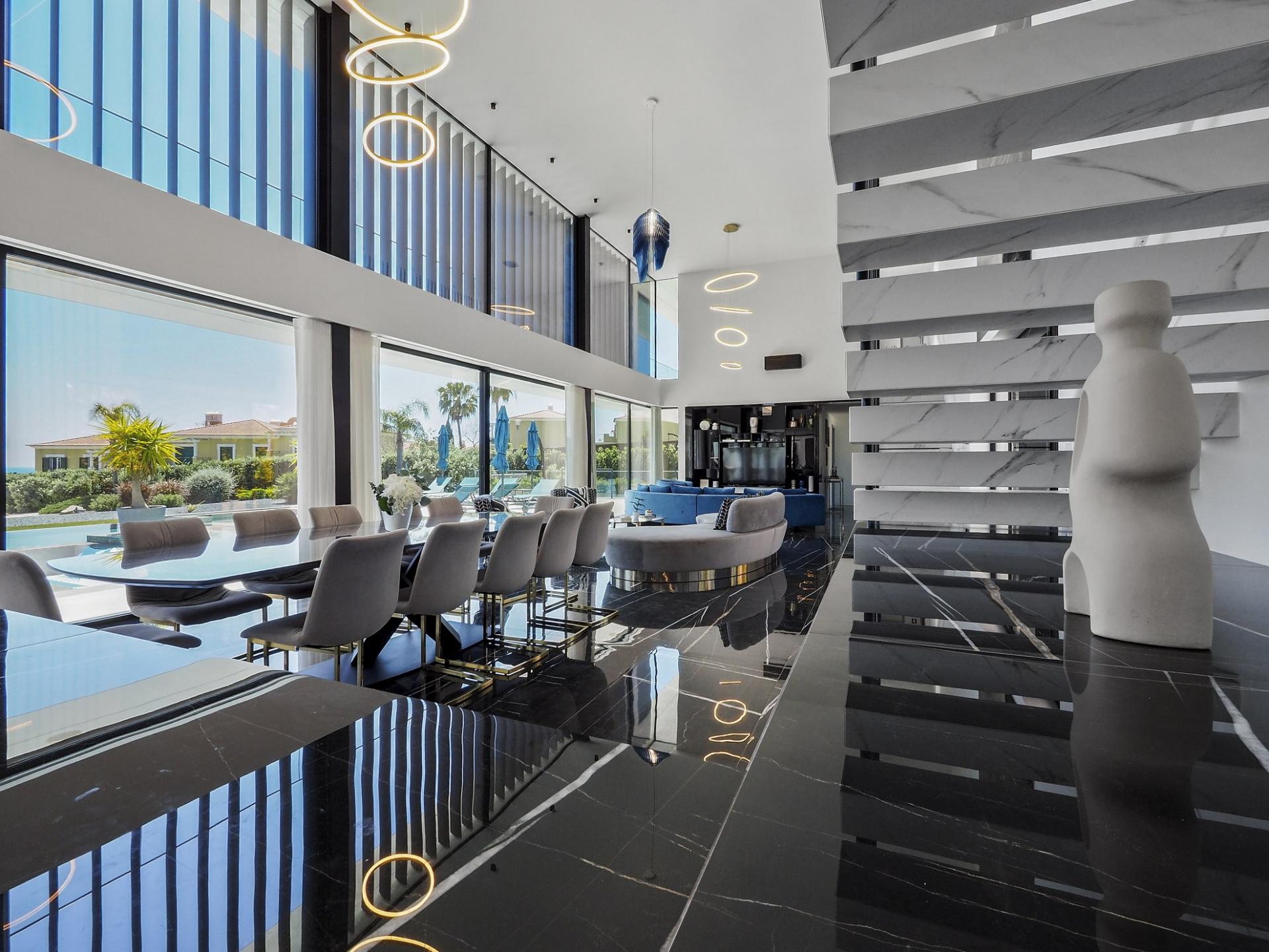 Designed with open-plan living in mind, the layout showcases soaring double-height ceilings, full-height glass sliding doors, and uninterrupted sea views throughout. The heart of the home is a dramatic lounge and dining area, framed by a sculptural double staircase and flowing naturally onto generous terraces. The fully equipped kitchen connects effortlessly with the outdoor entertaining zone which is both covered and uncovered. The ground floor includes a spacious en-suite bedroom—ideal for guests or single-level living. Upstairs, four additional en-suite bedrooms each offer private balconies and stunning ocean views. Outdoors, a heated saltwater pool stretches across multiple levels, complemented by a summer kitchen, BBQ, sound system, covered dining space, and firepit lounge. The rooftop terrace crowns the home, featuring a hot tub and panoramic views over the Atlantic—an idyllic setting for sunset gatherings or private retreats.
