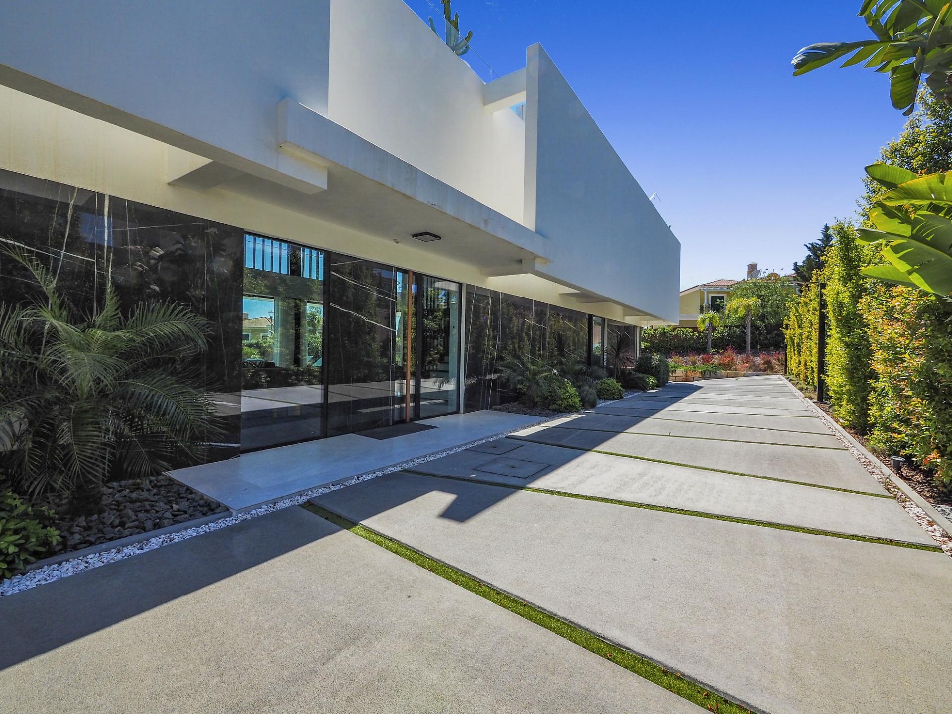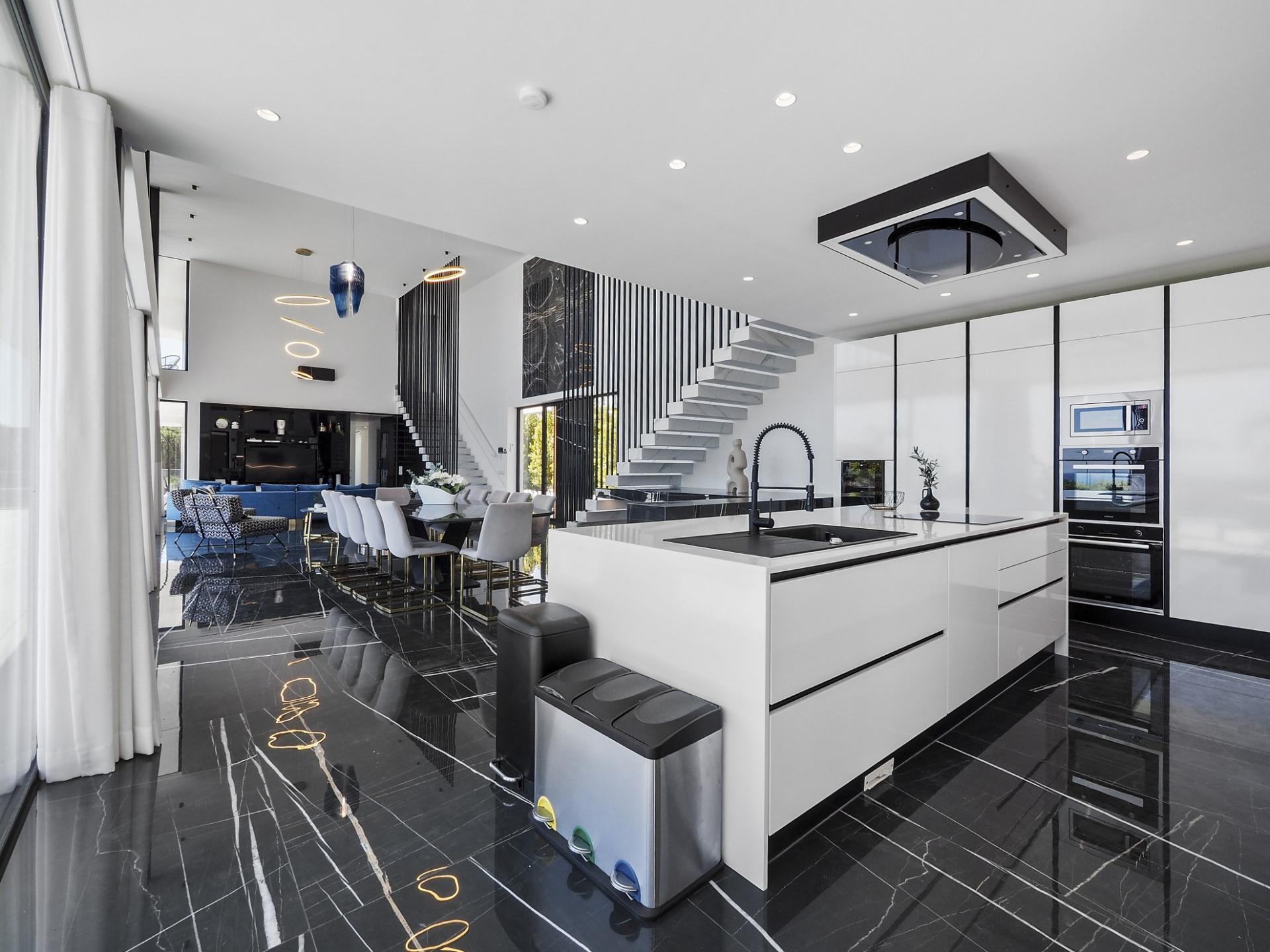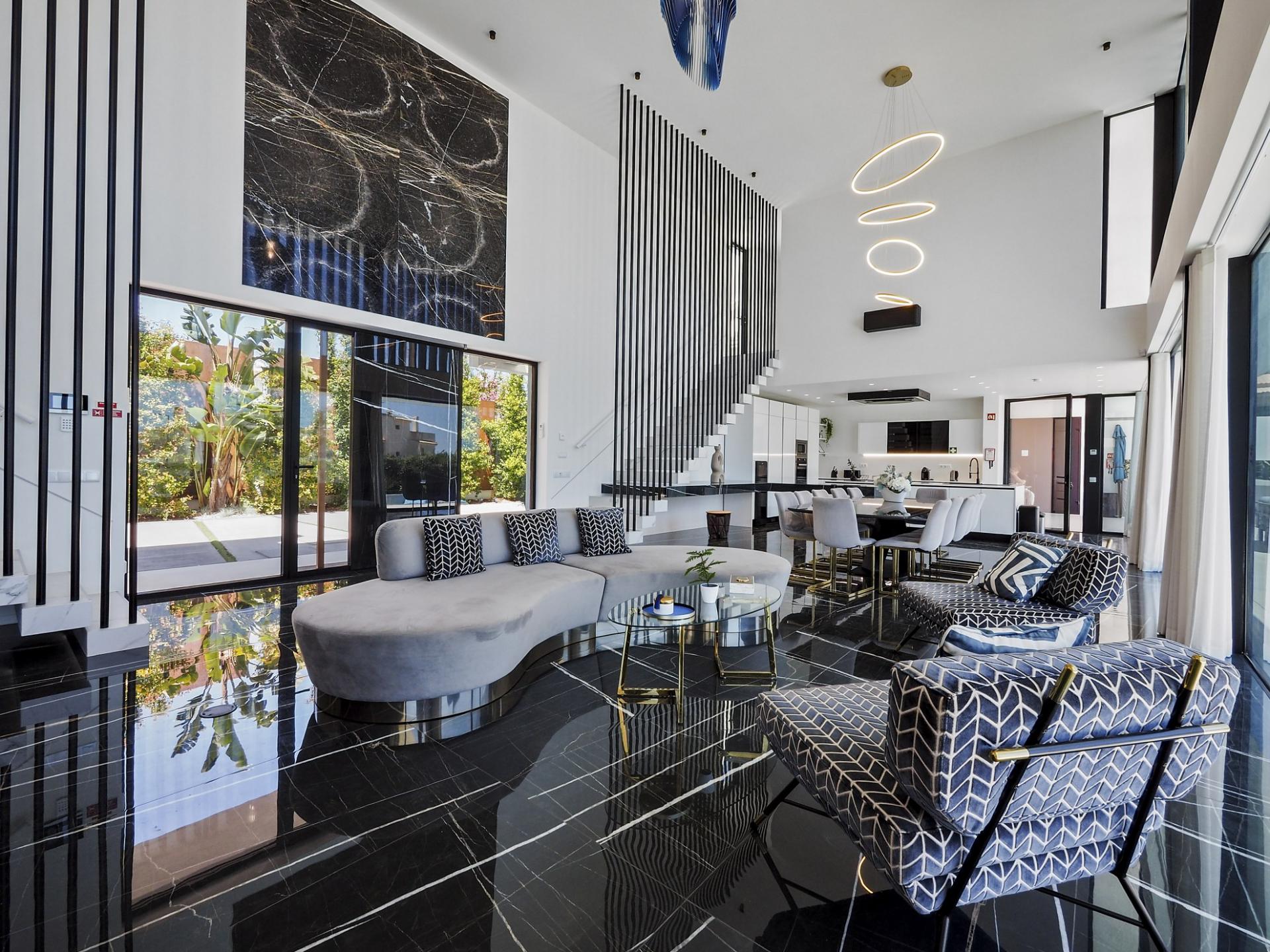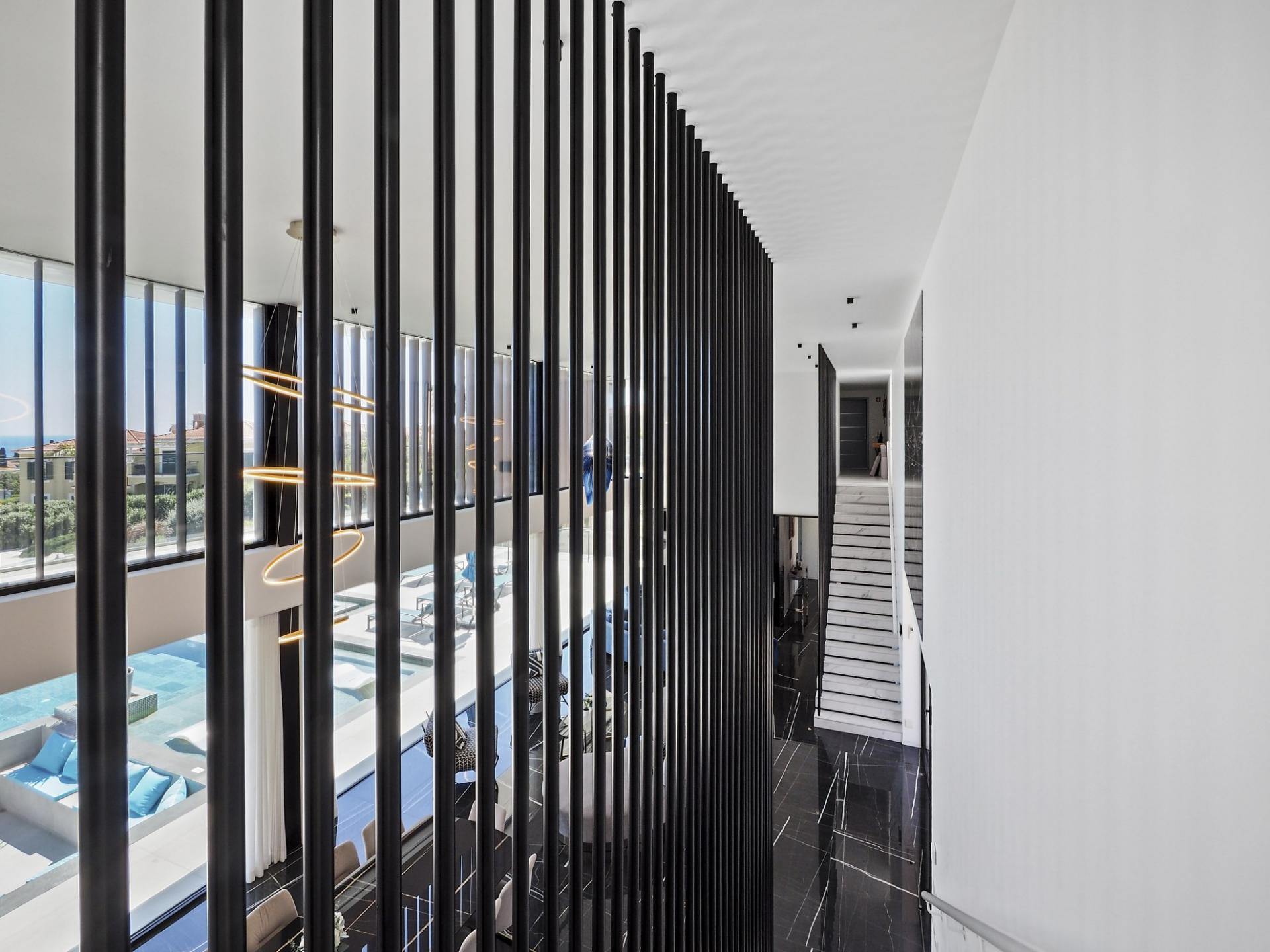 Designed with open-plan living in mind, the layout showcases soaring double-height ceilings, full-height glass sliding doors, and uninterrupted sea views throughout. The heart of the home is a dramatic lounge and dining area, framed by a sculptural double staircase and flowing naturally onto generous terraces. The fully equipped kitchen connects effortlessly with the outdoor entertaining zone which is both covered and uncovered. The ground floor includes a spacious en-suite bedroom—ideal for guests or single-level living. Upstairs, four additional en-suite bedrooms each offer private balconies and stunning ocean views. Outdoors, a heated saltwater pool stretches across multiple levels, complemented by a summer kitchen, BBQ, sound system, covered dining space, and firepit lounge. The rooftop terrace crowns the home, featuring a hot tub and panoramic views over the Atlantic—an idyllic setting for sunset gatherings or private retreats.