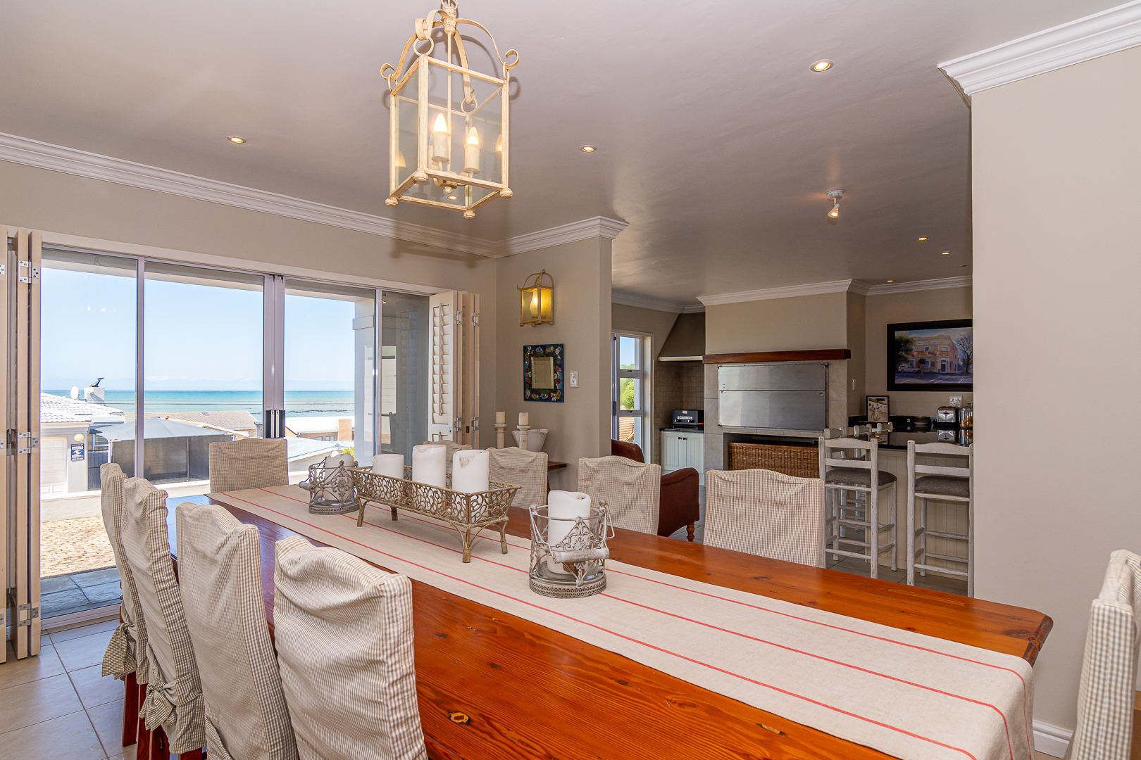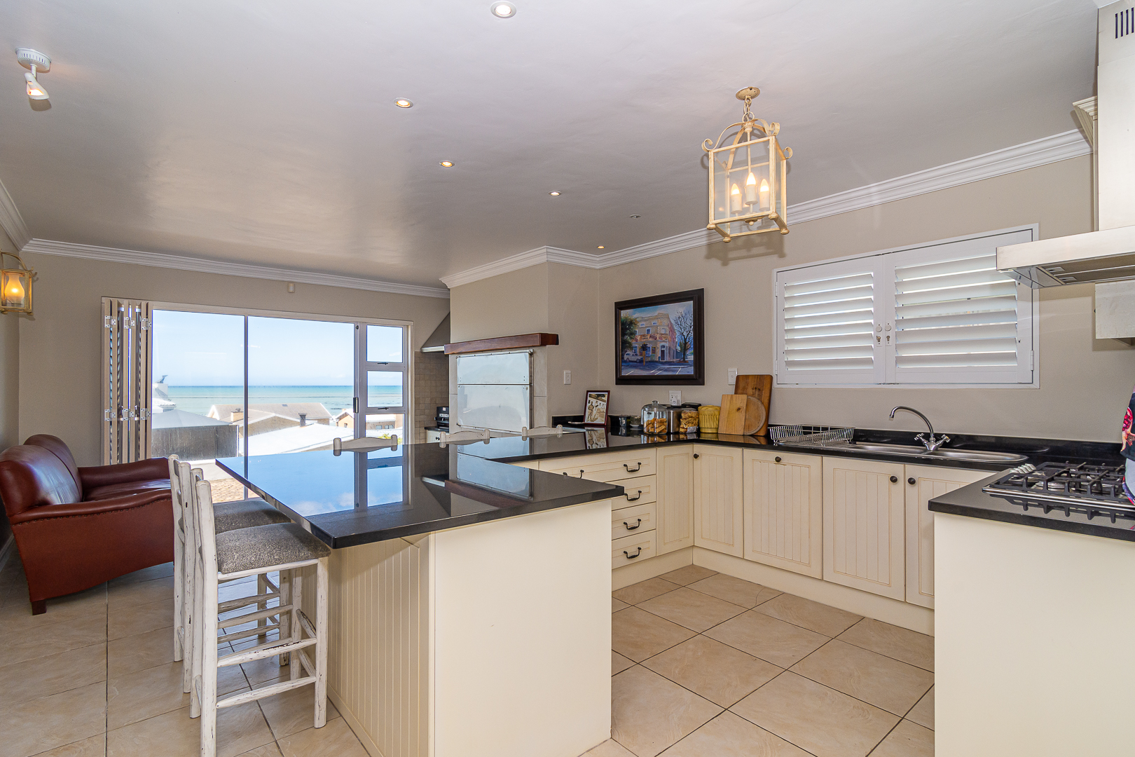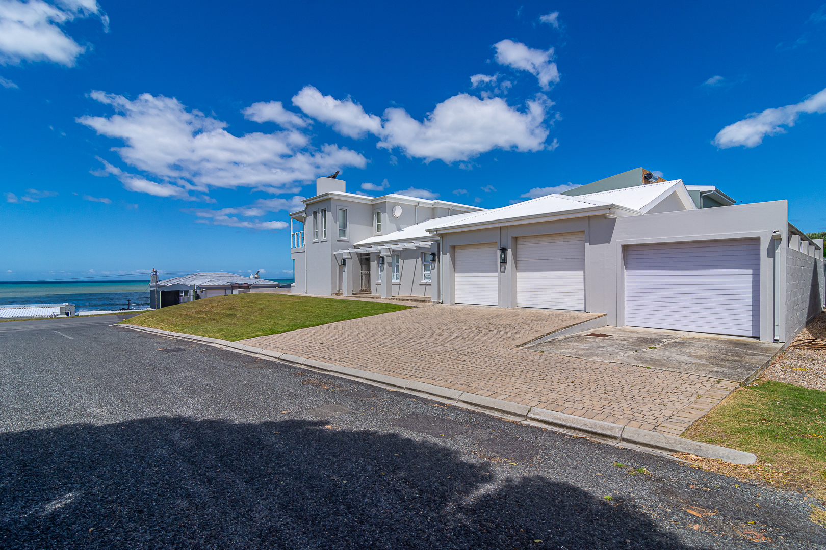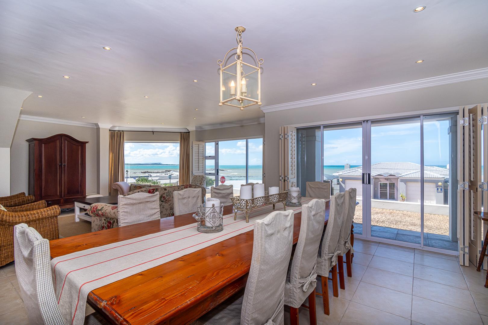 Ground level comprises an open plan living/kitchen/dining/braai area with stainless steel built-in braai. A modern kitchen with ample storage space and granite tops. Four bedrooms with hardwood floors, (one with en-suite) and two bathrooms. The upstairs entertainment area features a living room/kitchenette, additional bedroom with en-suite bathroom - leading onto an open balcony with stainless steel built-in braai and breathtaking sea views. Offers a spacious double garage plus a tandem garage (both with automated doors which can easily accommodate five cars).