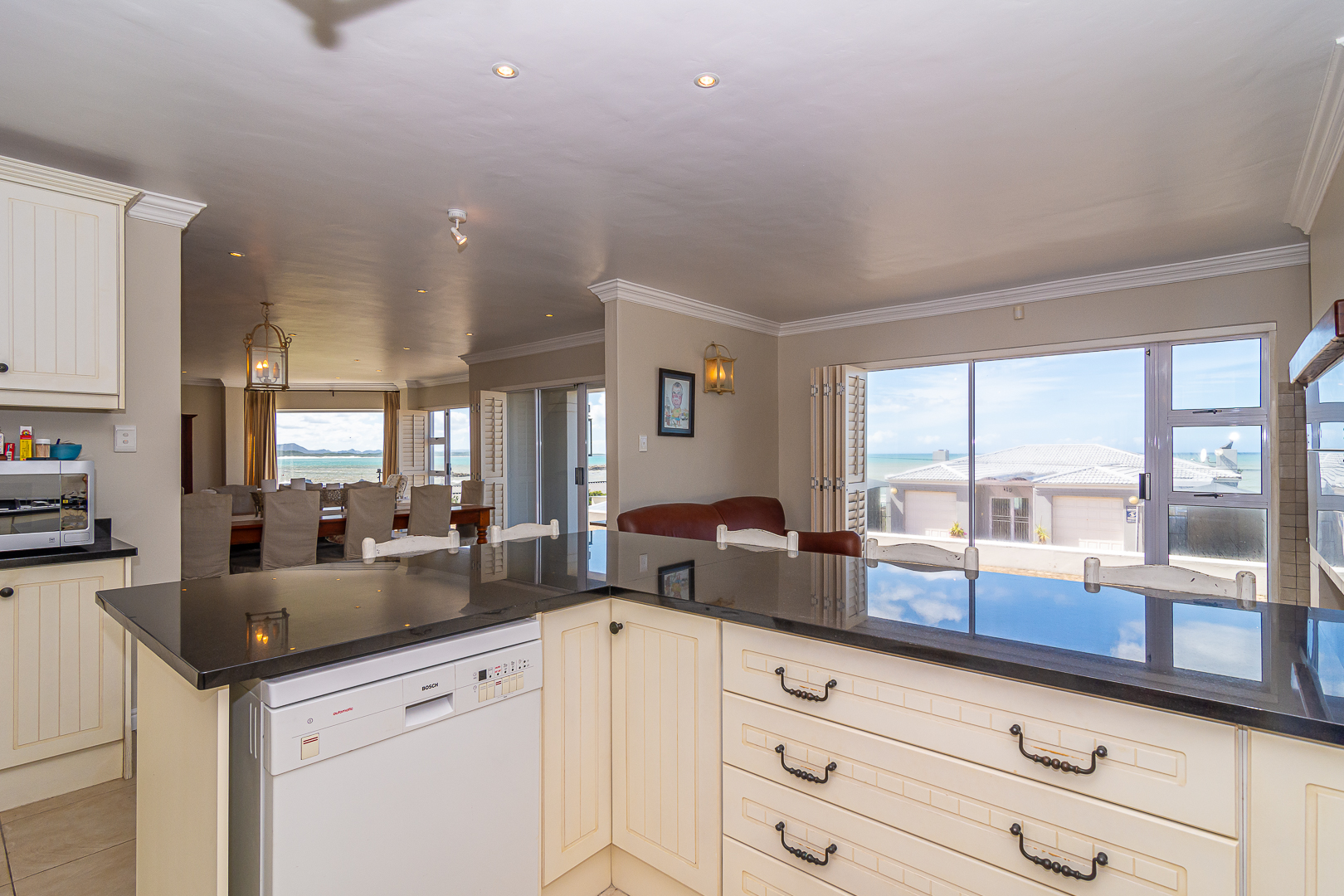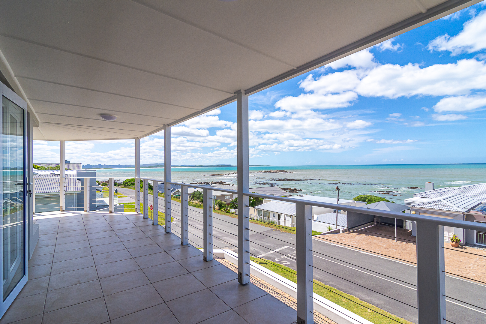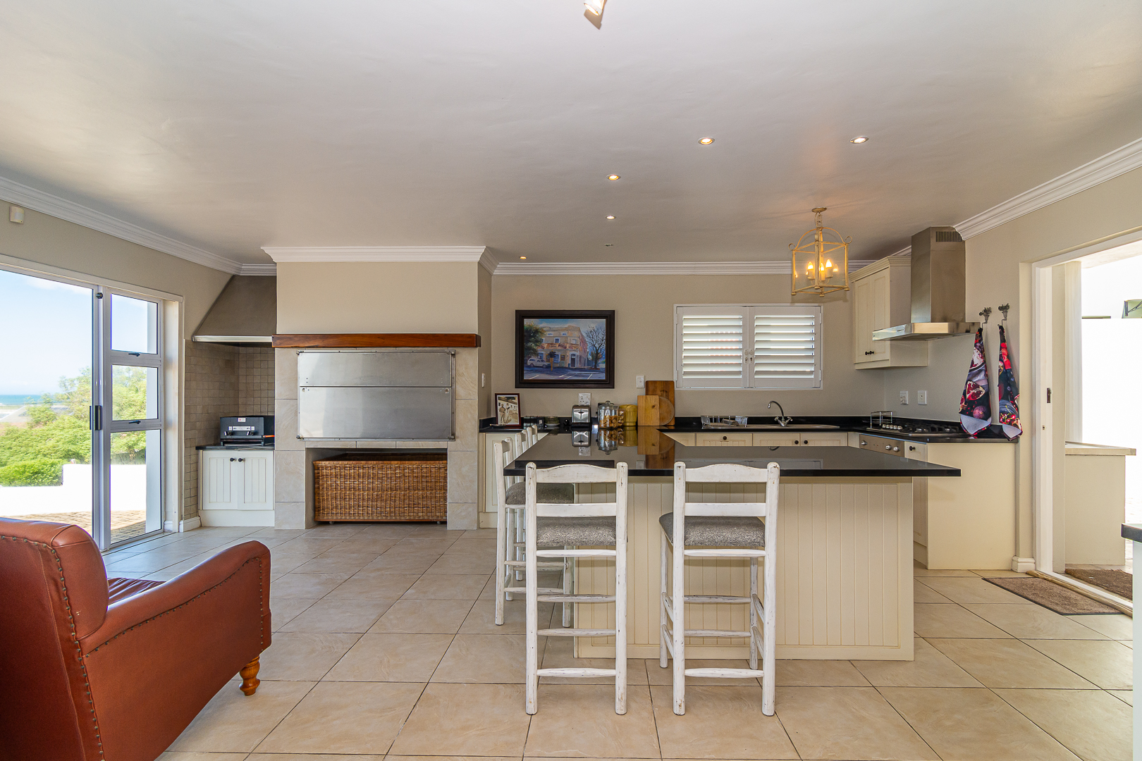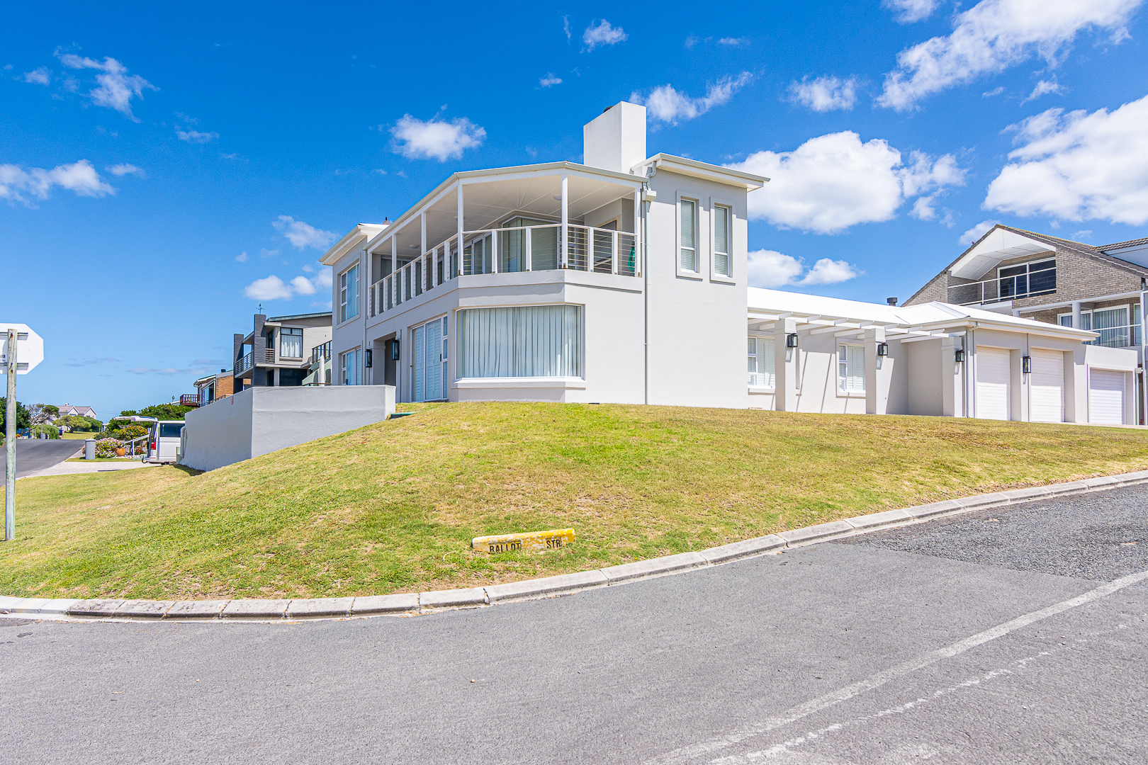 Ground level comprises an open plan living/kitchen/dining/braai area with stainless steel built-in braai. A modern kitchen with ample storage space and granite tops. Four bedrooms with hardwood floors, (one with en-suite) and two bathrooms. The upstairs entertainment area features a living room/kitchenette, additional bedroom with en-suite bathroom - leading onto an open balcony with stainless steel built-in braai and breathtaking sea views. Offers a spacious double garage plus a tandem garage (both with automated doors which can easily accommodate five cars).