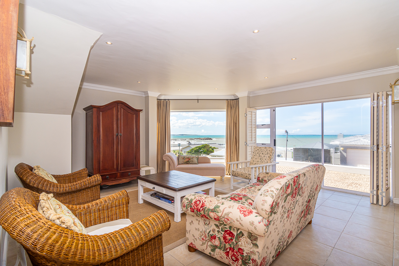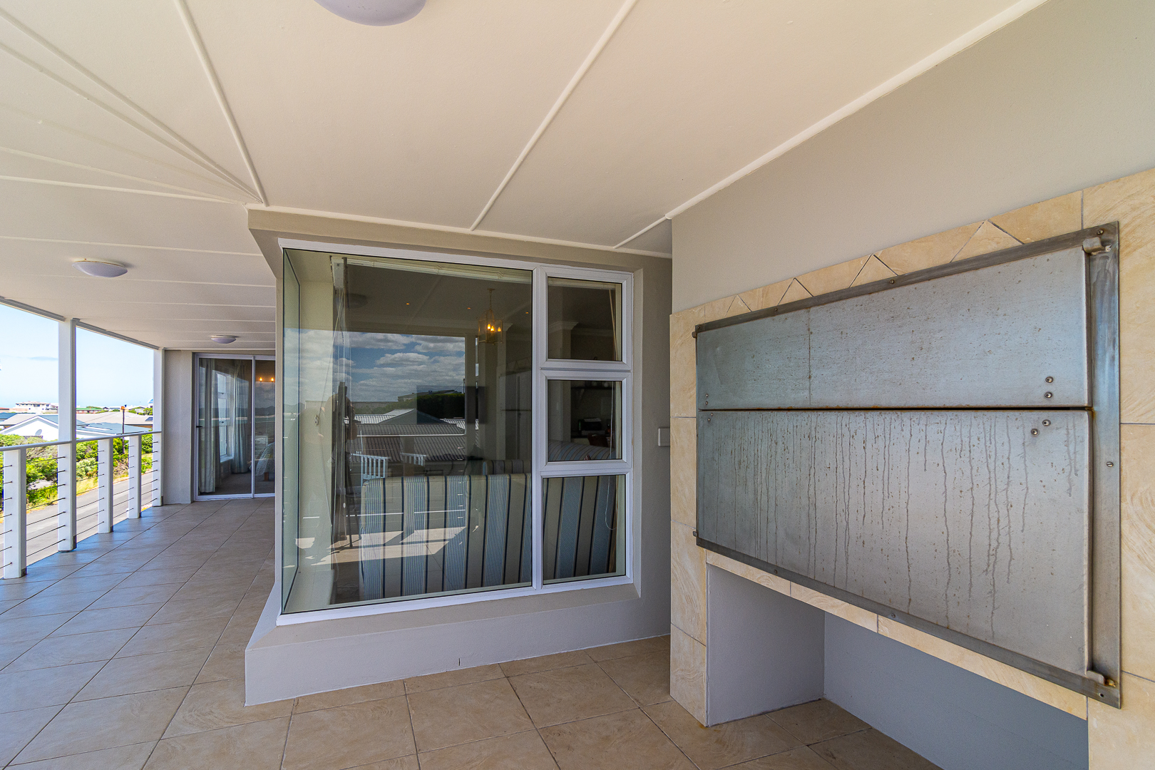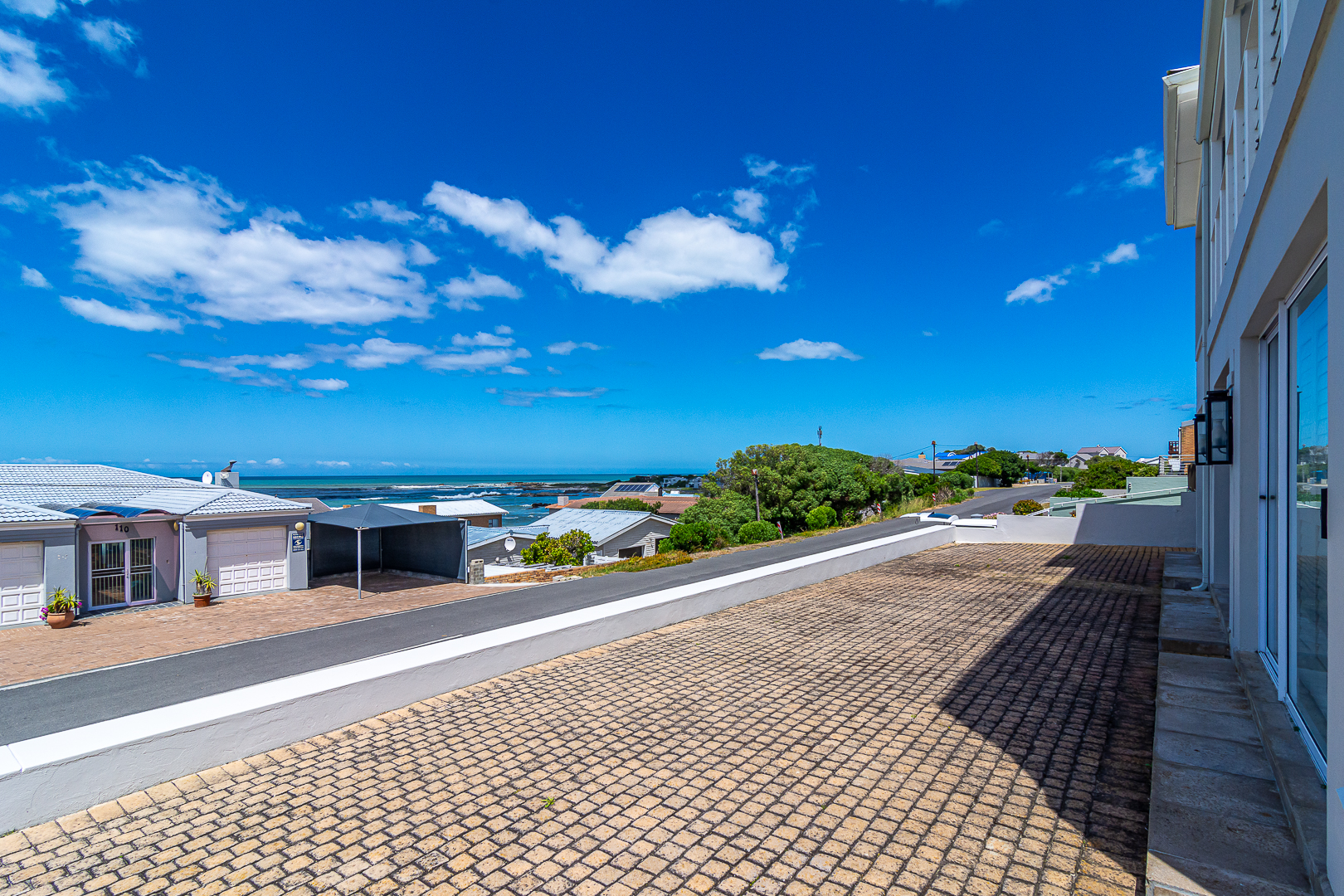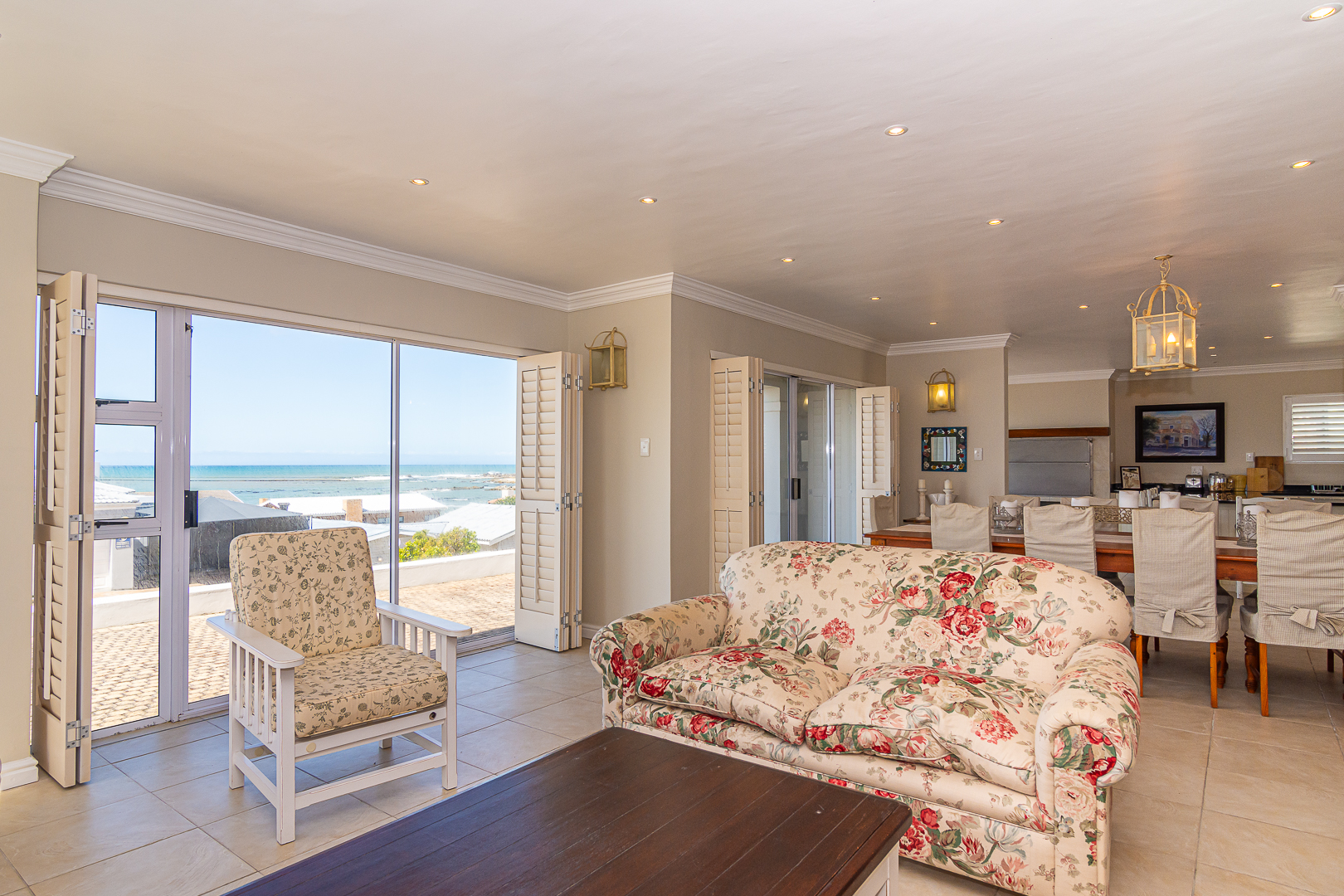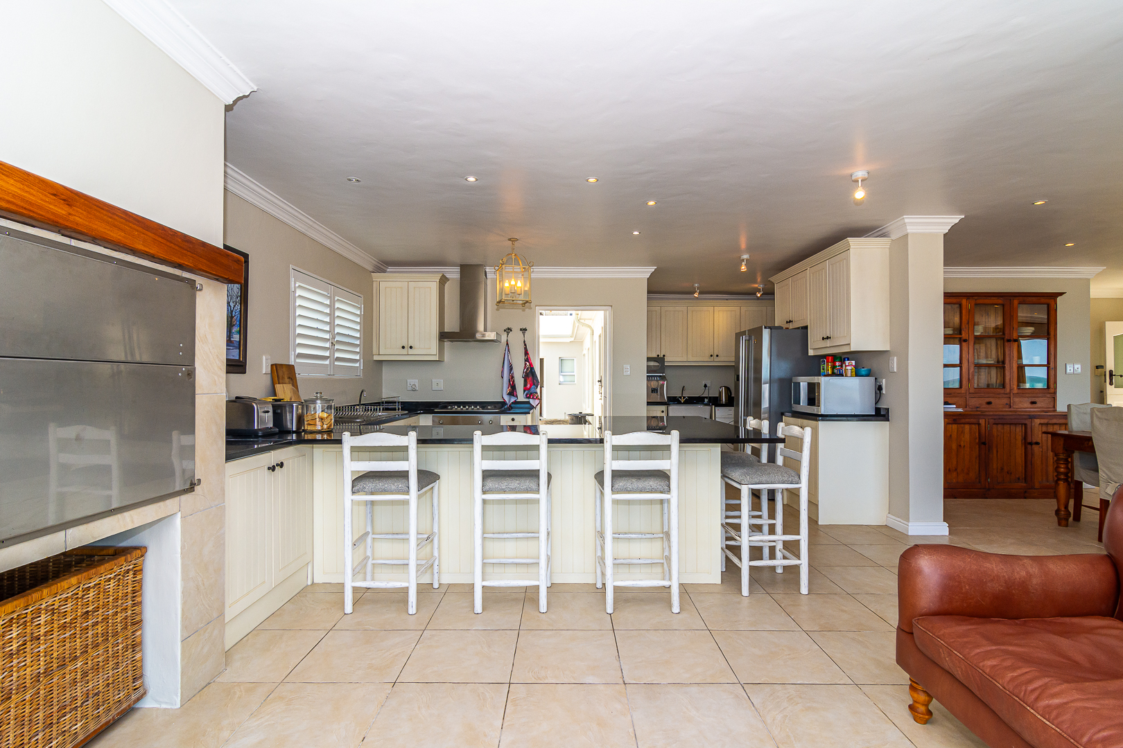 Ground level comprises an open plan living/kitchen/dining/braai area with stainless steel built-in braai. A modern kitchen with ample storage space and granite tops. Four bedrooms with hardwood floors, (one with en-suite) and two bathrooms. The upstairs entertainment area features a living room/kitchenette, additional bedroom with en-suite bathroom - leading onto an open balcony with stainless steel built-in braai and breathtaking sea views. Offers a spacious double garage plus a tandem garage (both with automated doors which can easily accommodate five cars).