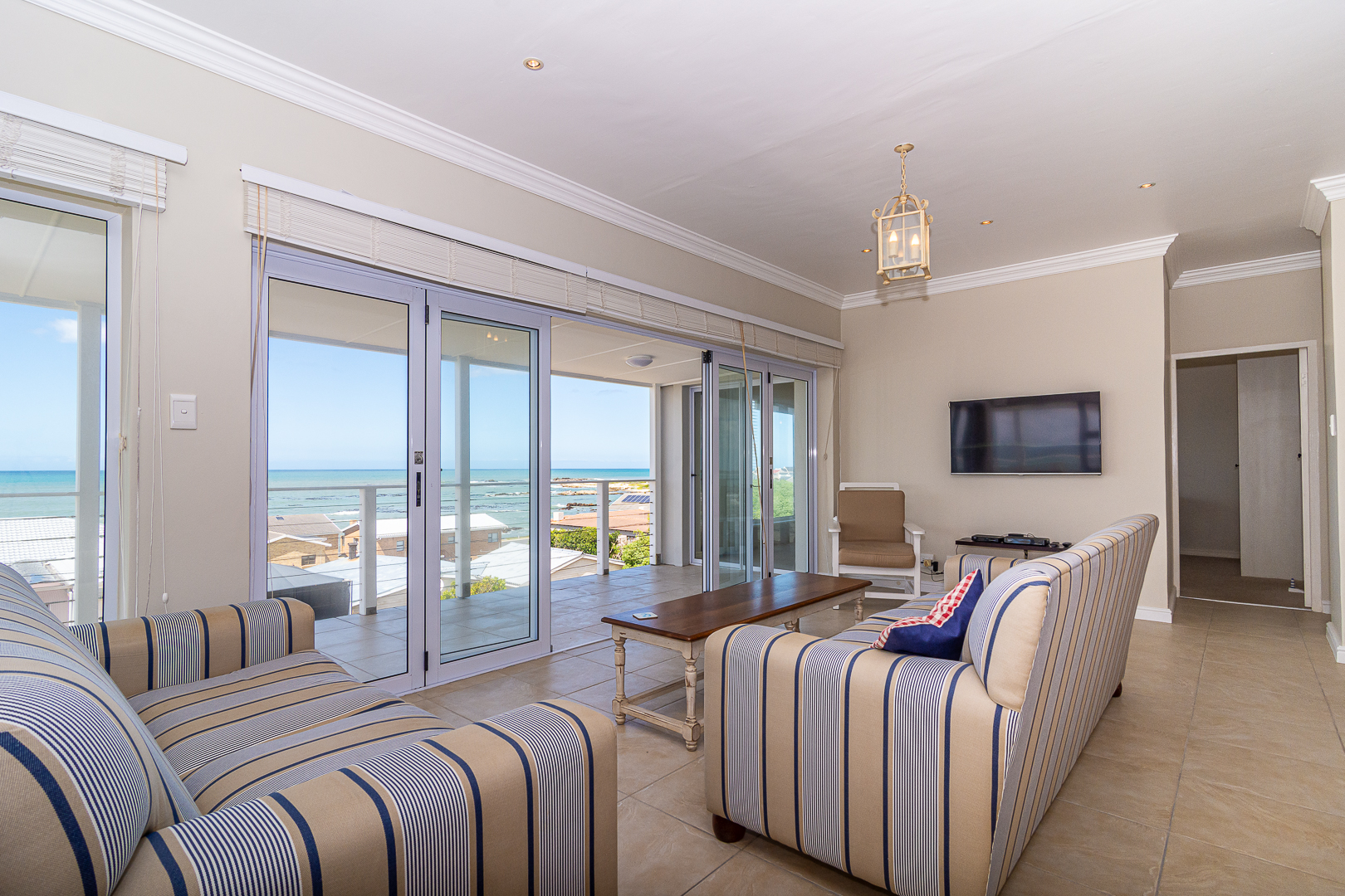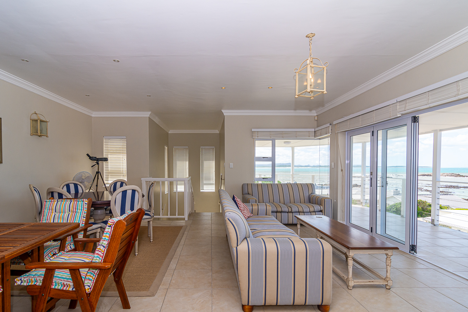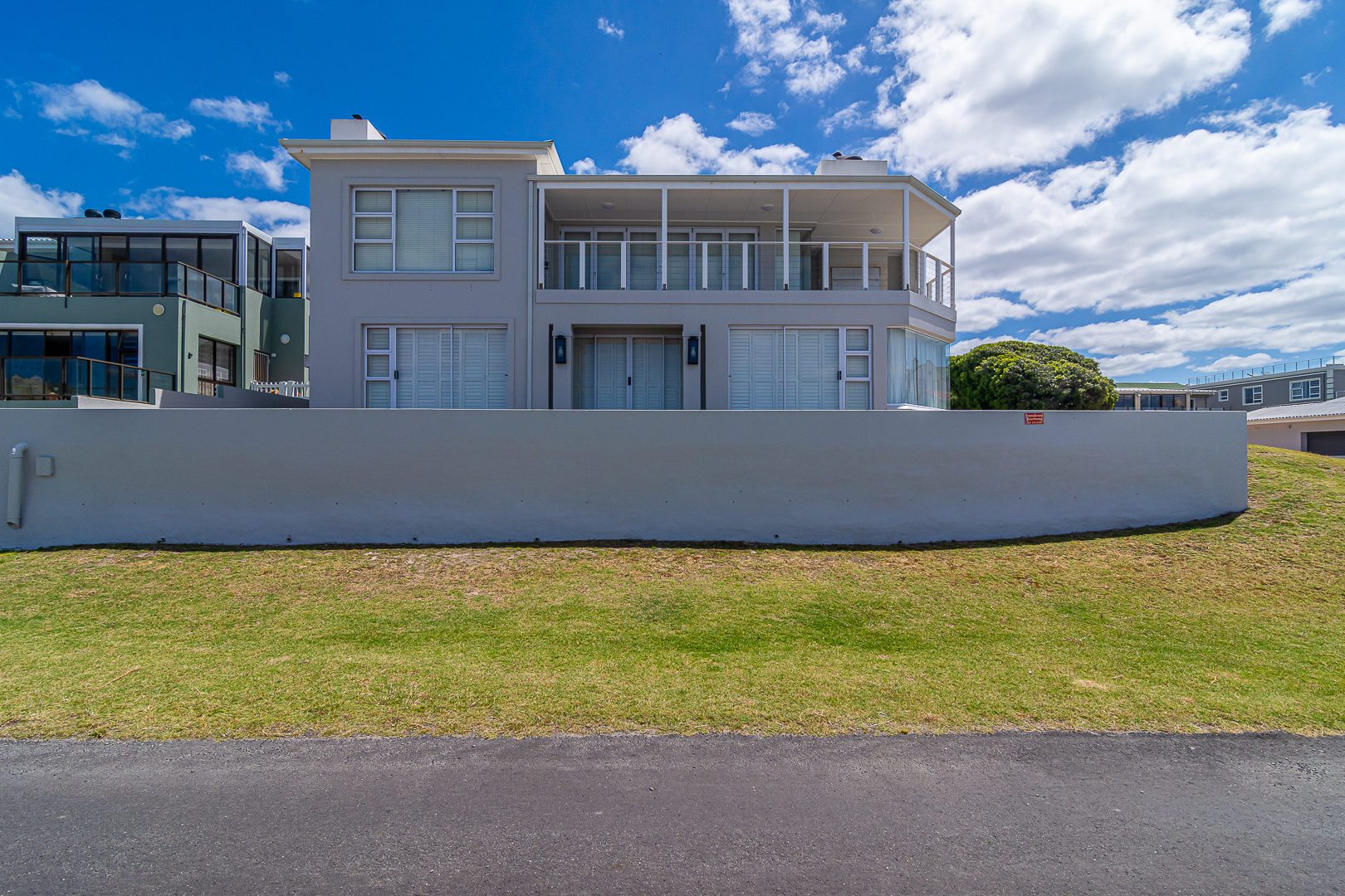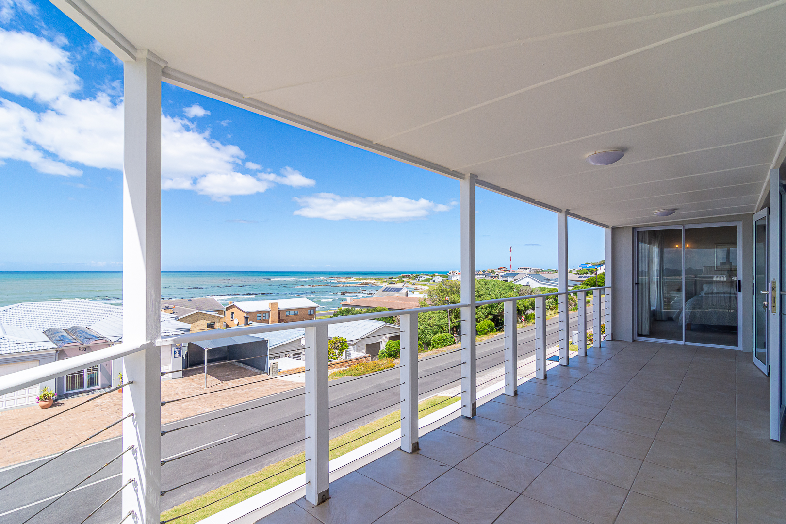 Ground level comprises an open plan living/kitchen/dining/braai area with stainless steel built-in braai. A modern kitchen with ample storage space and granite tops. Four bedrooms with hardwood floors, (one with en-suite) and two bathrooms. The upstairs entertainment area features a living room/kitchenette, additional bedroom with en-suite bathroom - leading onto an open balcony with stainless steel built-in braai and breathtaking sea views. Offers a spacious double garage plus a tandem garage (both with automated doors which can easily accommodate five cars).