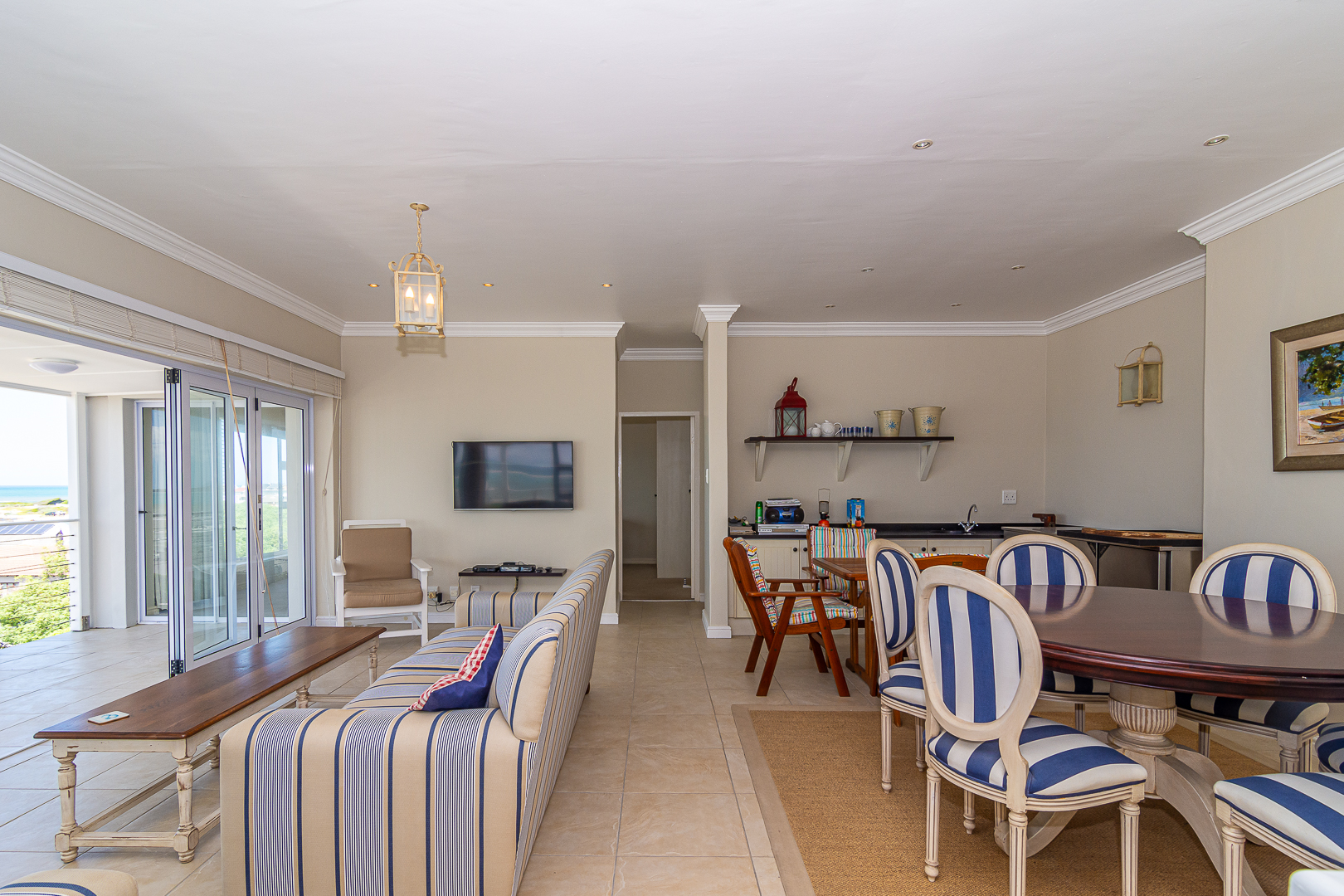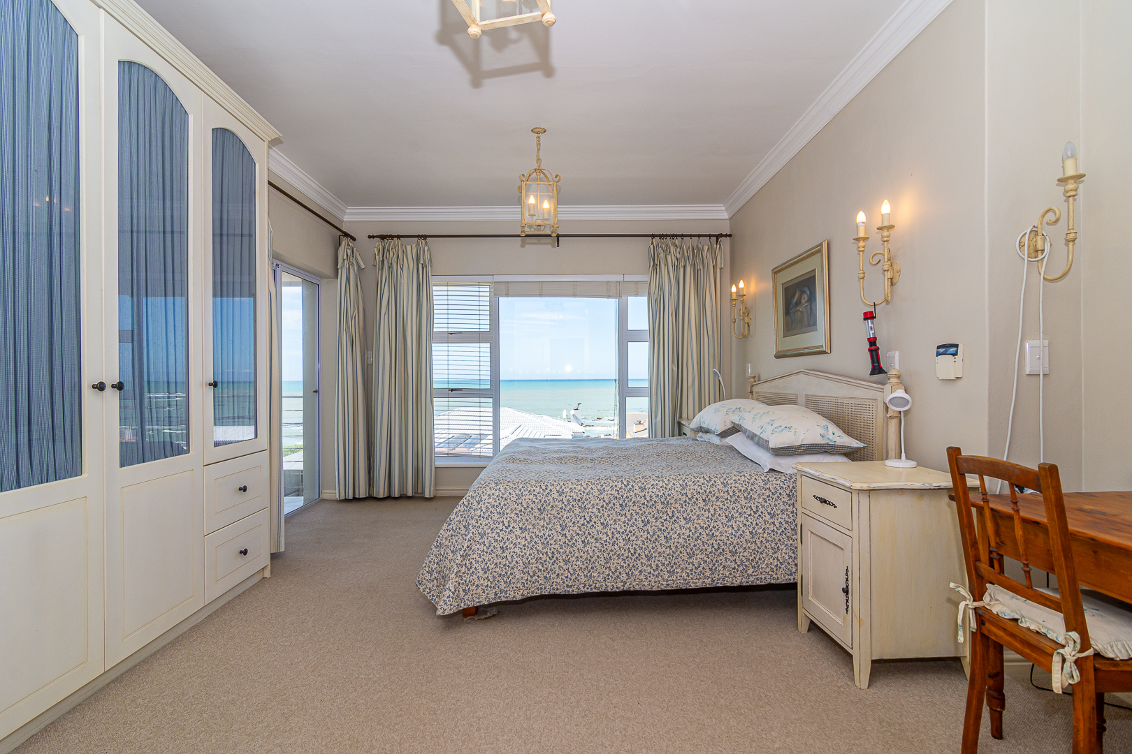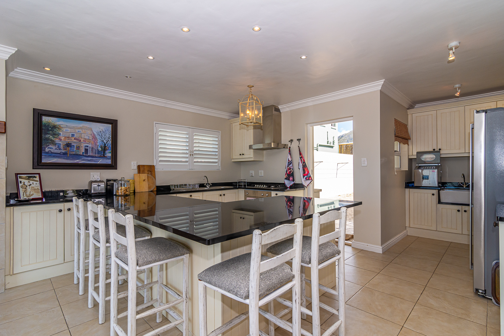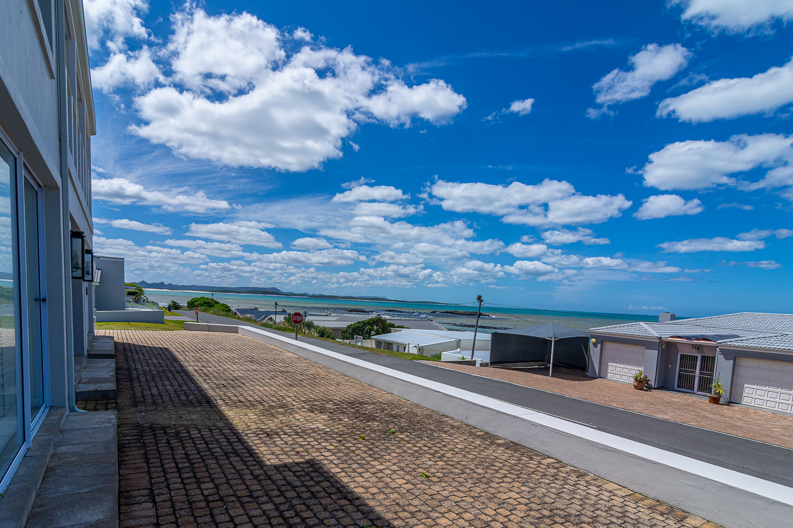 Ground level comprises an open plan living/kitchen/dining/braai area with stainless steel built-in braai. A modern kitchen with ample storage space and granite tops. Four bedrooms with hardwood floors, (one with en-suite) and two bathrooms. The upstairs entertainment area features a living room/kitchenette, additional bedroom with en-suite bathroom - leading onto an open balcony with stainless steel built-in braai and breathtaking sea views. Offers a spacious double garage plus a tandem garage (both with automated doors which can easily accommodate five cars).