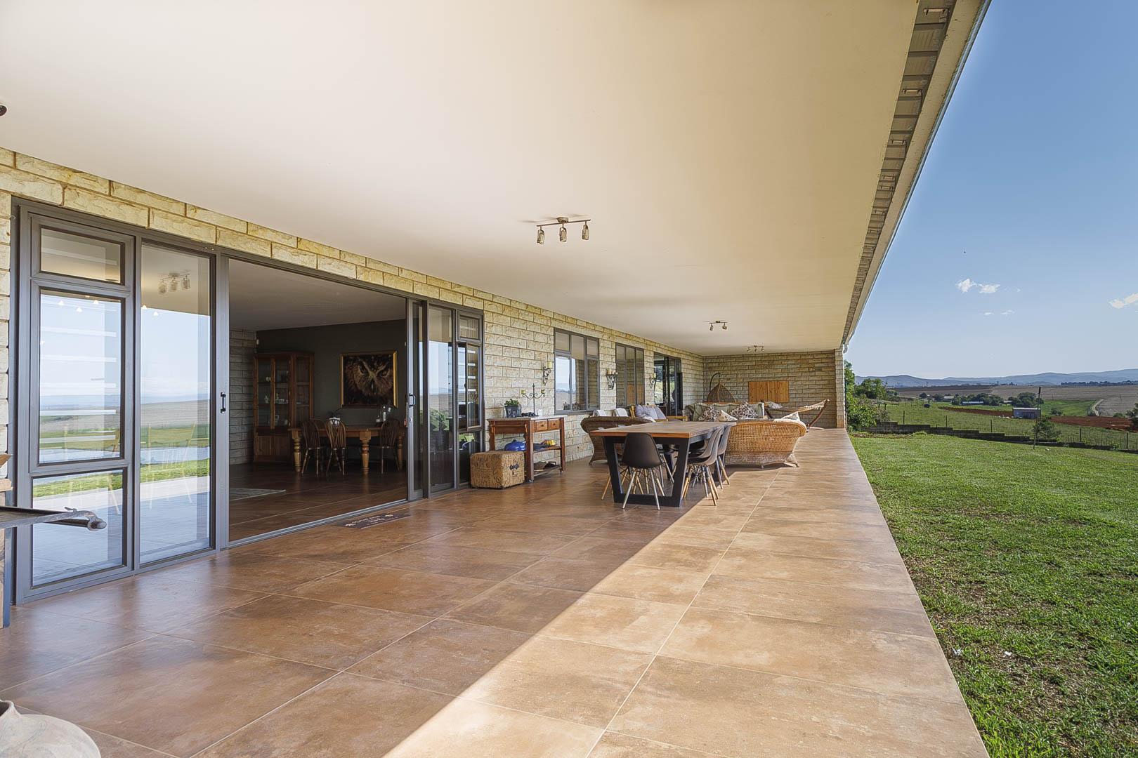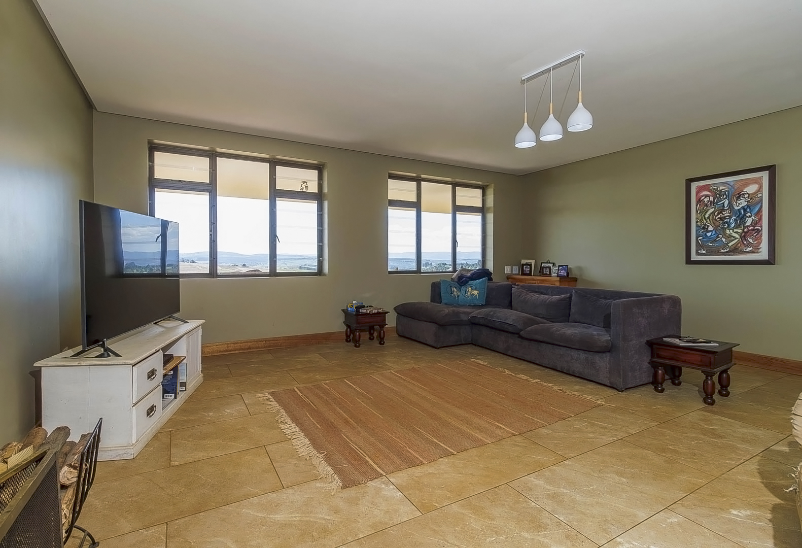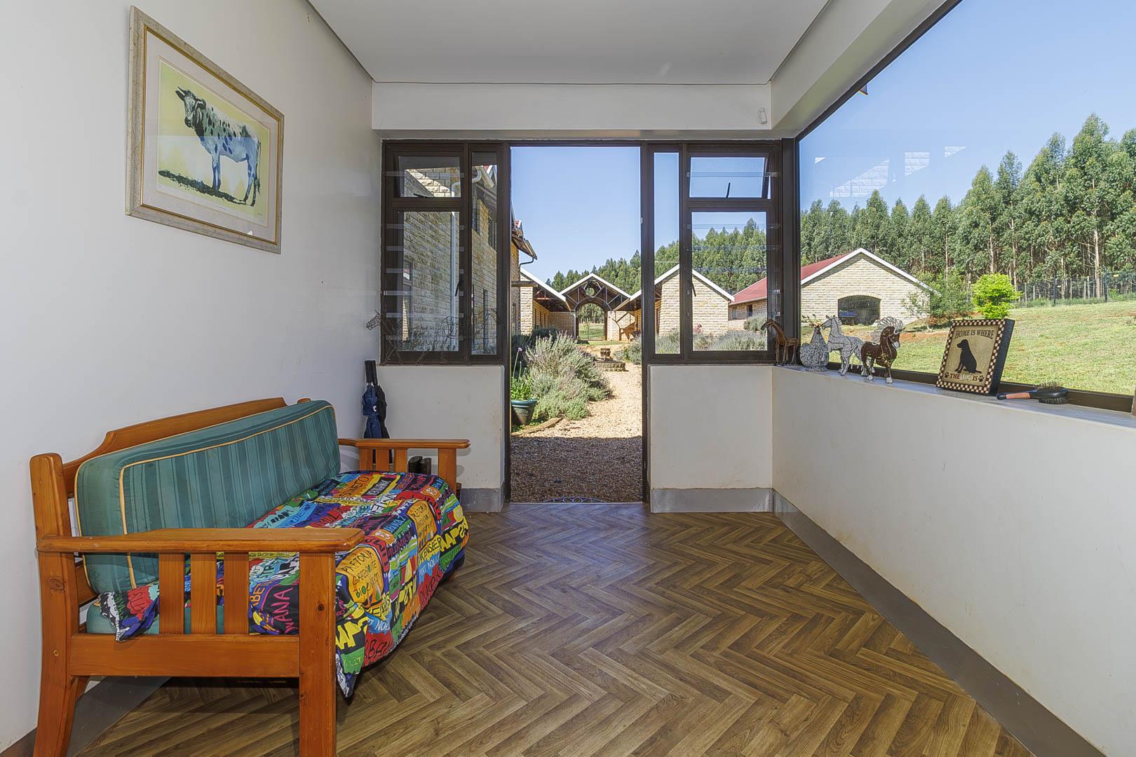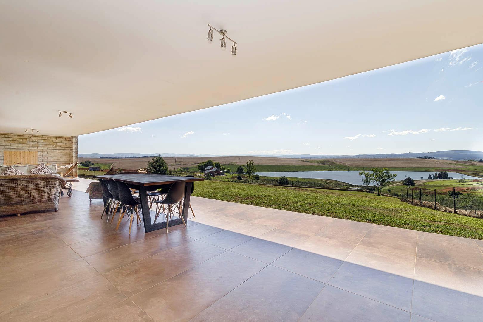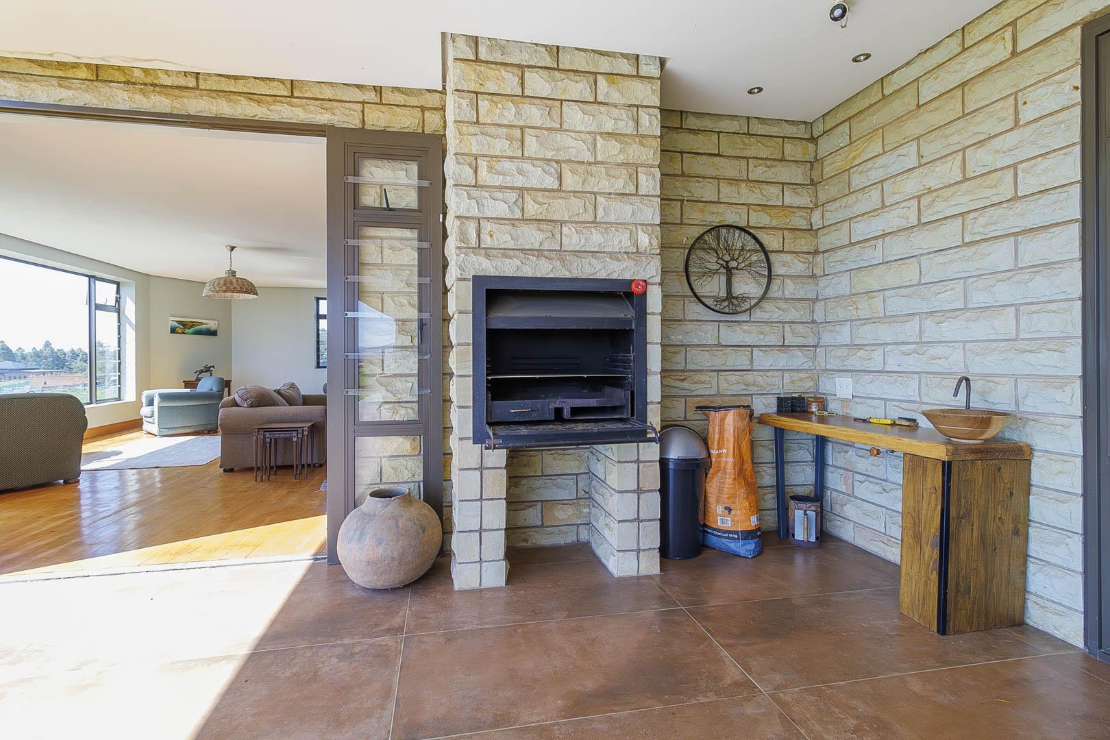 This stunning property, built with an equestrian lifestyle in mind, offers breathtaking views of the Drakensberg and prioritizes family safety. It boasts spacious living and entertainment areas, including a grand foyer, a guest loo with cloakroom, a large office, and two reception rooms. The TV lounge features a jet master fireplace, underfloor heating, and panoramic views. The banquet-sized dining room and lounges open to a 90m² patio with a built-in braai, while the gym also doubles as an entertainment space leading to the patio.
