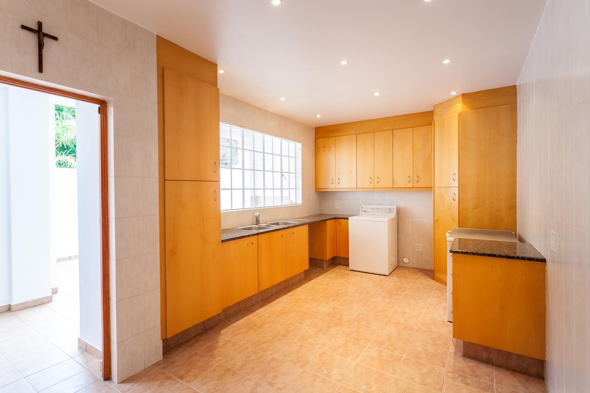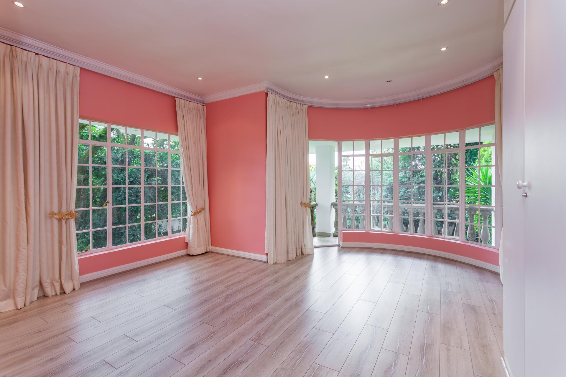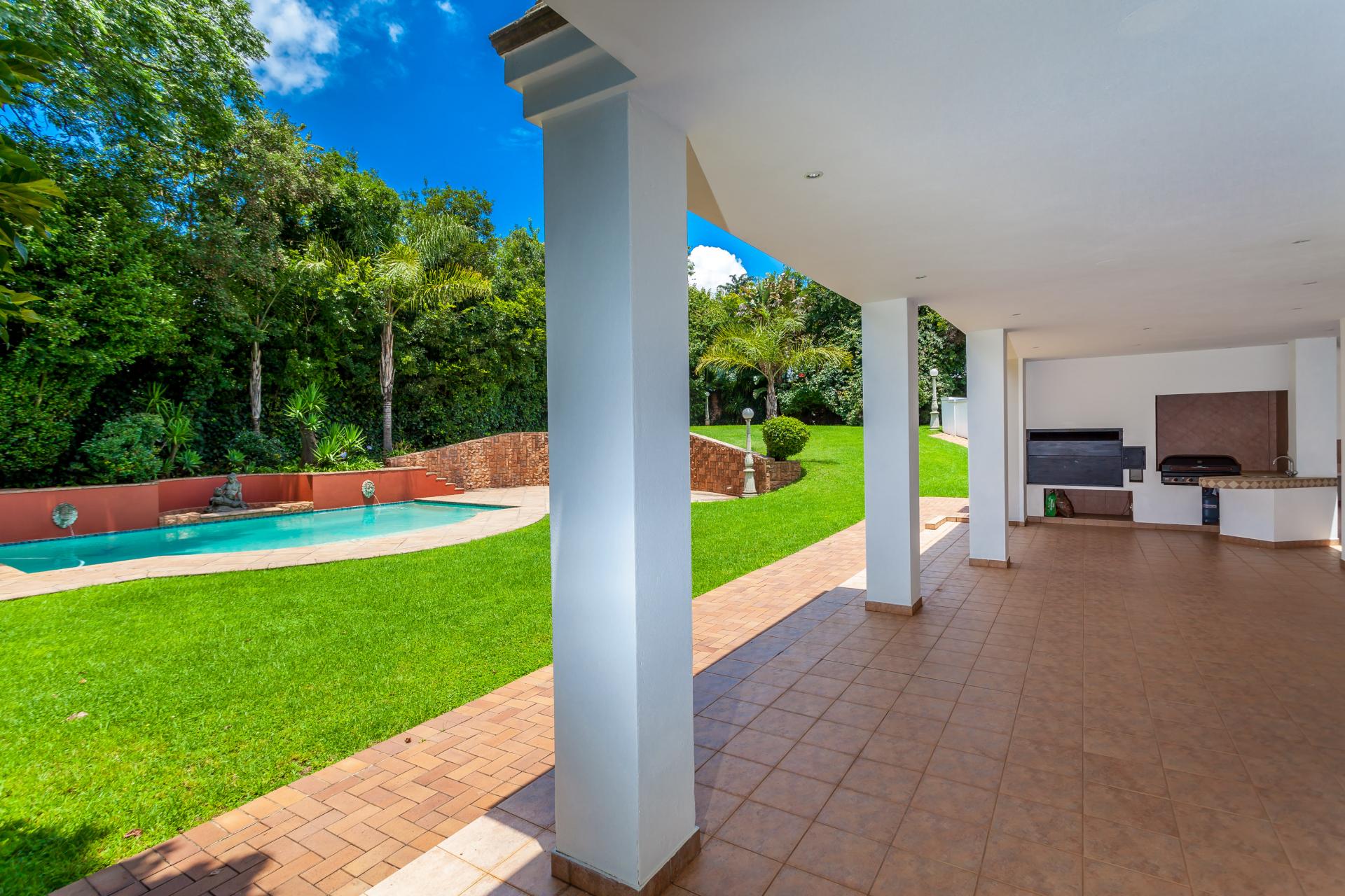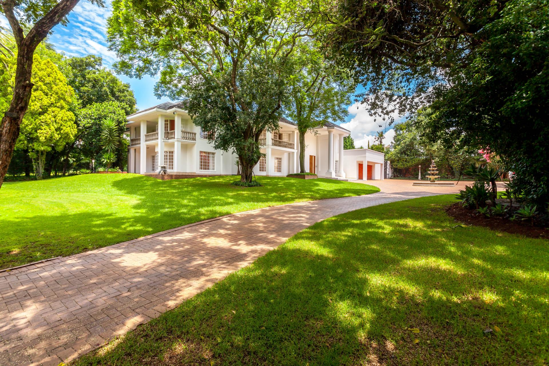 As you drive along the paved driveway up to this meticulously transformed grand white mansion with it's magnificent featured columns, you feel like you have just arrived on a movie set. You could be in another place or another time, yet there is a comforting familiarity about it. The lush green garden with rolling lawns are inviting and create the perfect backdrop to this stylish and sophisticated home. Behind the large bespoke solid wooden door, in the entrance hall with coat closet and guest toilet, an elegant sweeping marble staircase and feature skylight reaches out to you. The ground floor reception rooms flow effortlessly from one into another, finished in top quality marble tiles with custom made marble windowsills and a custom designed gas fireplace. The family room features a built in bar, a second toilet and shower facility serving the patio, pool and entertainment areas. The patio is complete with Jetmaster braai with spit function, gas barbecue, prep area with sink, TV plug point, as well as extra electrical and music audio plug points. The eat in kitchen with maple and imbuia wood cabinetry is ideal for family gathering and parties. 4 Bedrooms,, two of them are en-suite, on the upper level are safely and securely tucked together. The main bedroom with en-suite bathroom is complete with Jacuzzi spa bath, steam shower and jet massages. 2nd Large bedroom with en-suite bathroom has shower, basin and toilet. The family bathroom with, bath, shower , toilet and double basins services the other bedrooms. All bedrooms have TV points and additional plug points. The study is perfect for a work from home situation or could be a 5th bedroom. Staff accommodation is fully tiled with built in kitchenette, cupboards and en-suite bathroom with shower. Automated double garages tiled with built in cupboards and work bench + 3 phase plug installed. Large paved area for loads of off street parking. This home is calling for a trendy and super cool buyer that appreciates olde-world charm but can furnish it with modern day glamour and sophistication.
