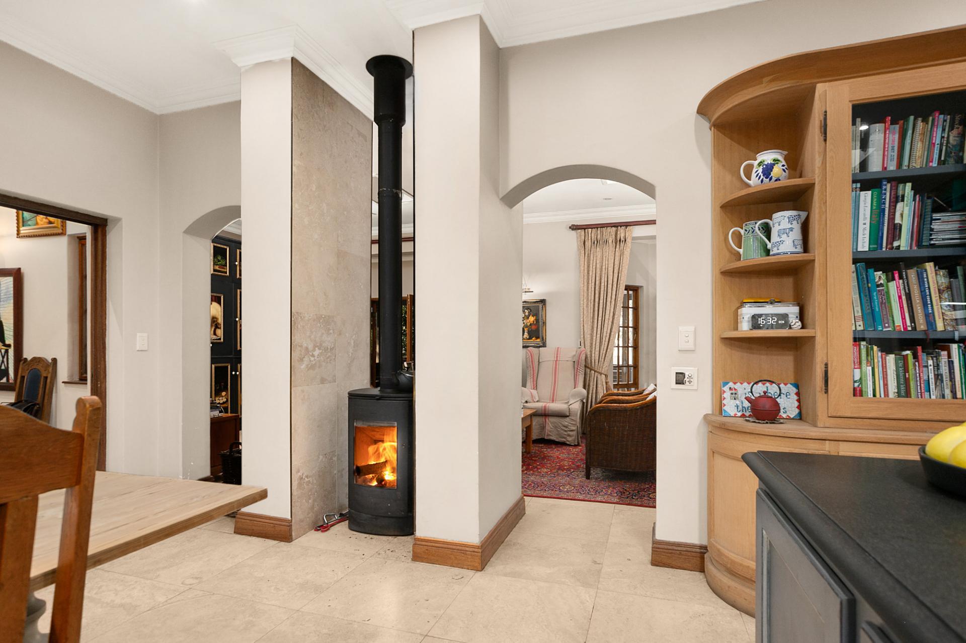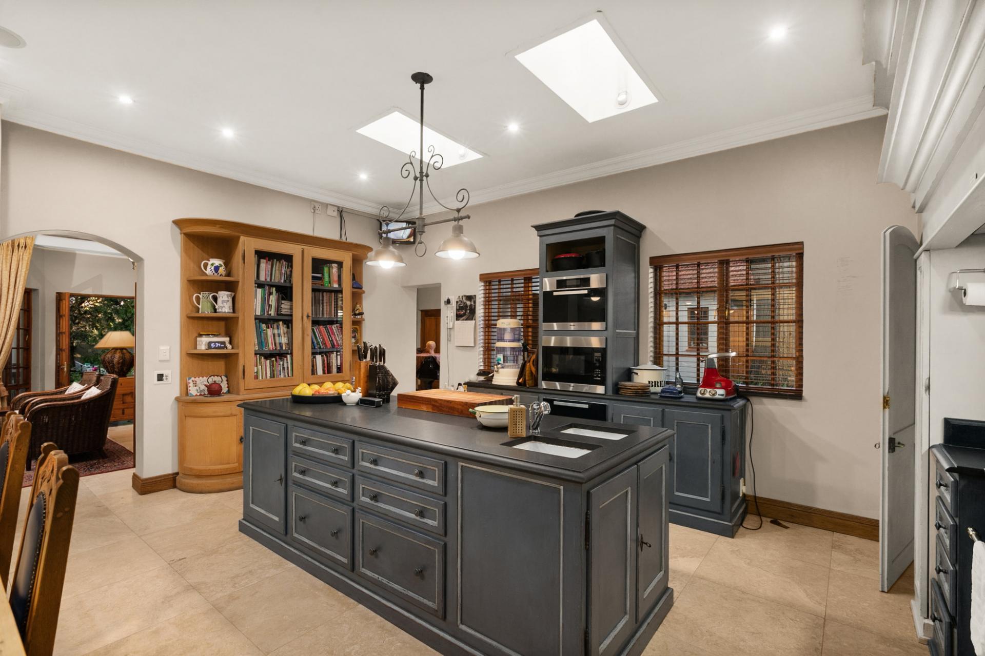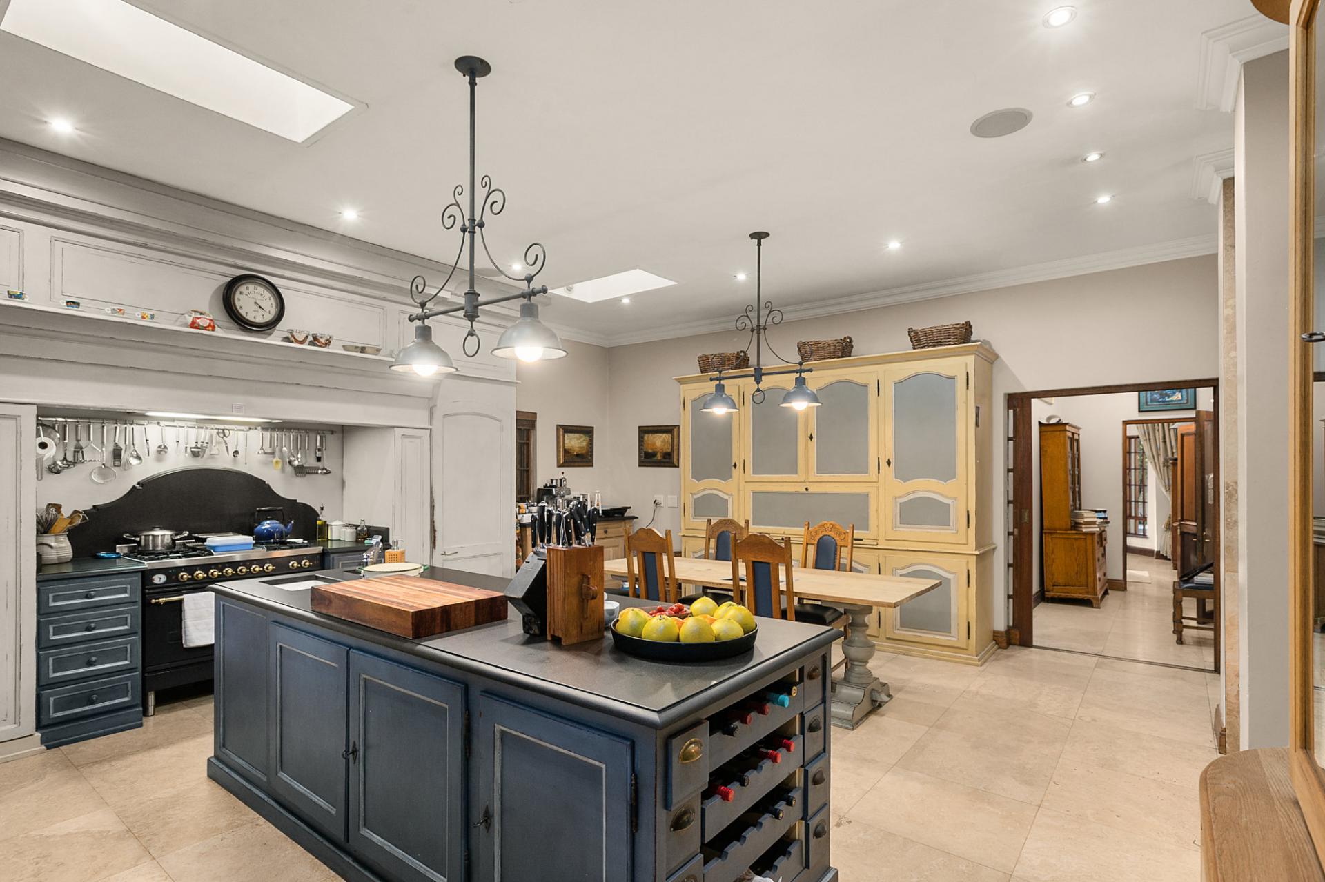 A gracious entrance hall sets the tone, leading into a sophisticated sitting room that flows effortlessly into the heart of the home—a beautifully appointed French Provençal kitchen. Featuring a central island, double oven, gas hob, and top-tier appliances by Ilve, Gaggenau, and Miele, this space is a culinary enthusiast’s dream. Cleverly integrated storage solutions, including pull-out shelves and built-in spice drawers, marry form with function. A Morso wood-burning fireplace rotates between the kitchen and lounge, enhancing warmth and ambience.