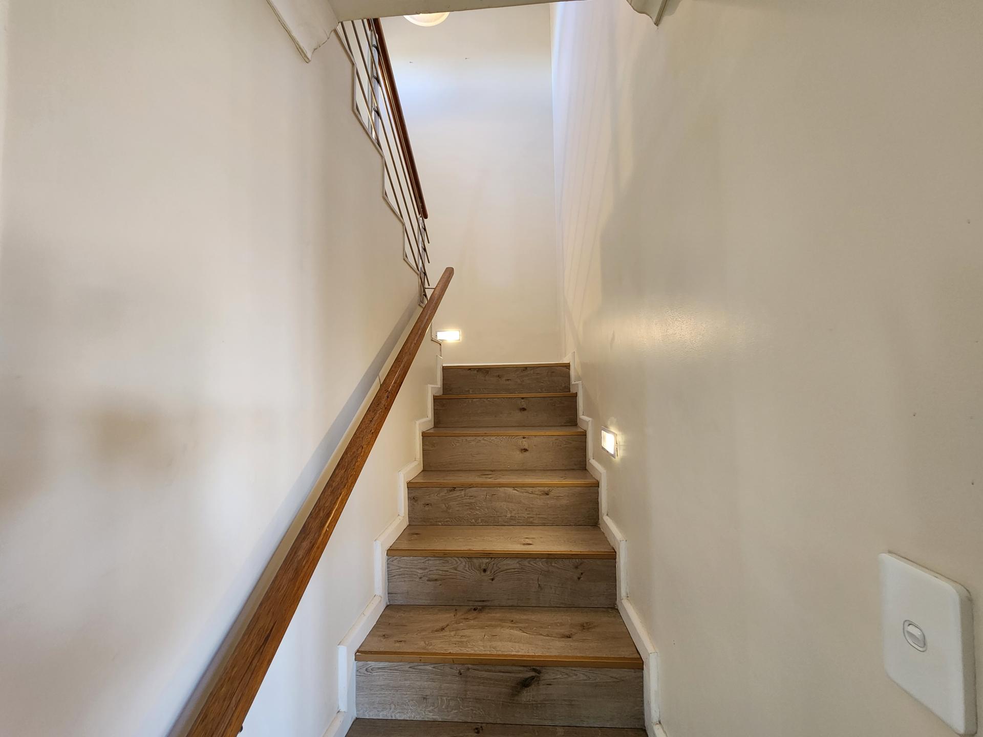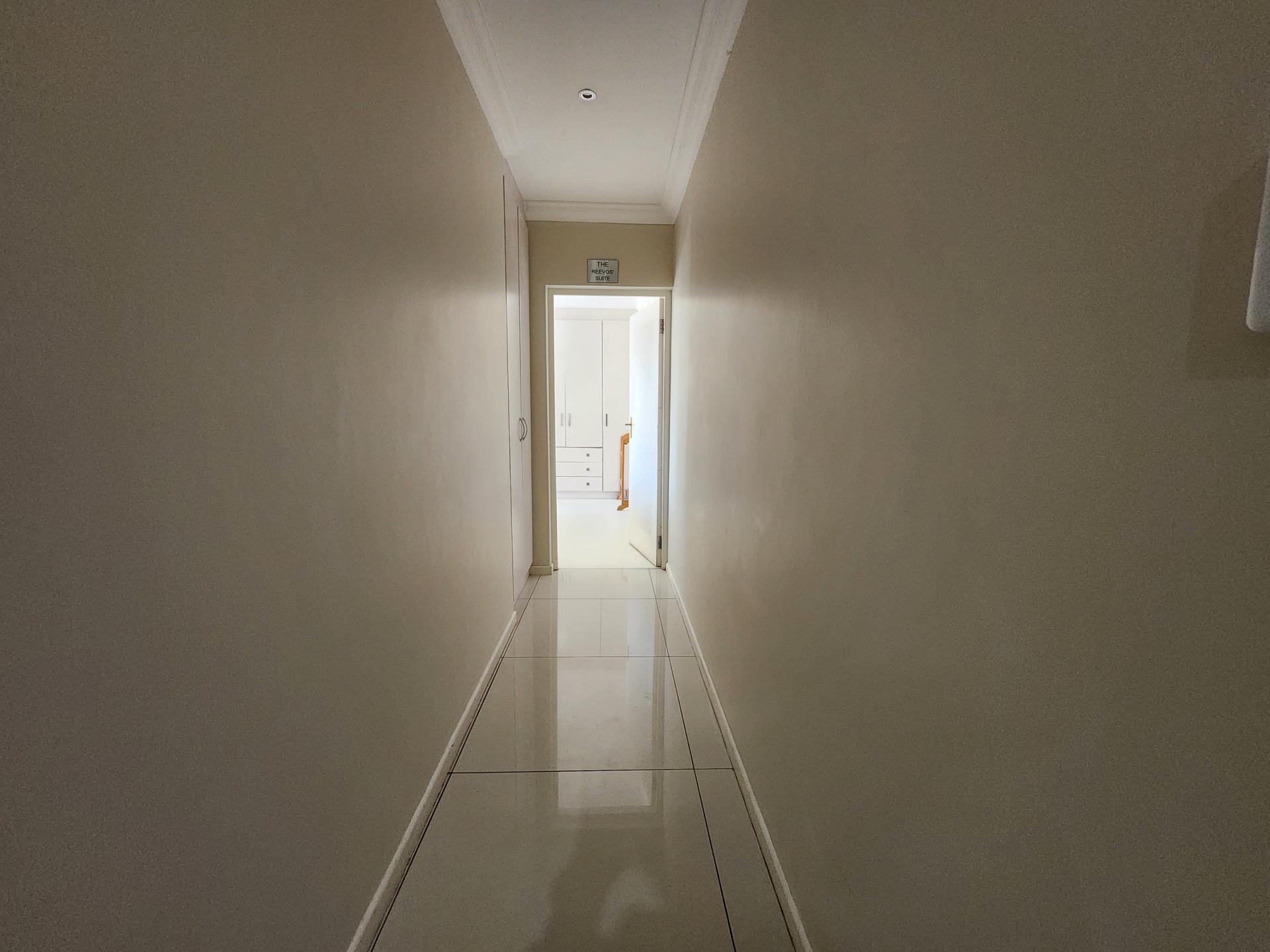 As you step through the front door, a welcoming entrance hall leads you upstairs to the first level, where large corner windows in the lounge allow you to take in the stunning lagoon views. The open-plan design seamlessly connects the TV lounge, dining area with built-in cupboards, and a stylish kitchen equipped with a 5-burner gas stove, Caesarstone countertops, a separate scullery, and a pantry.