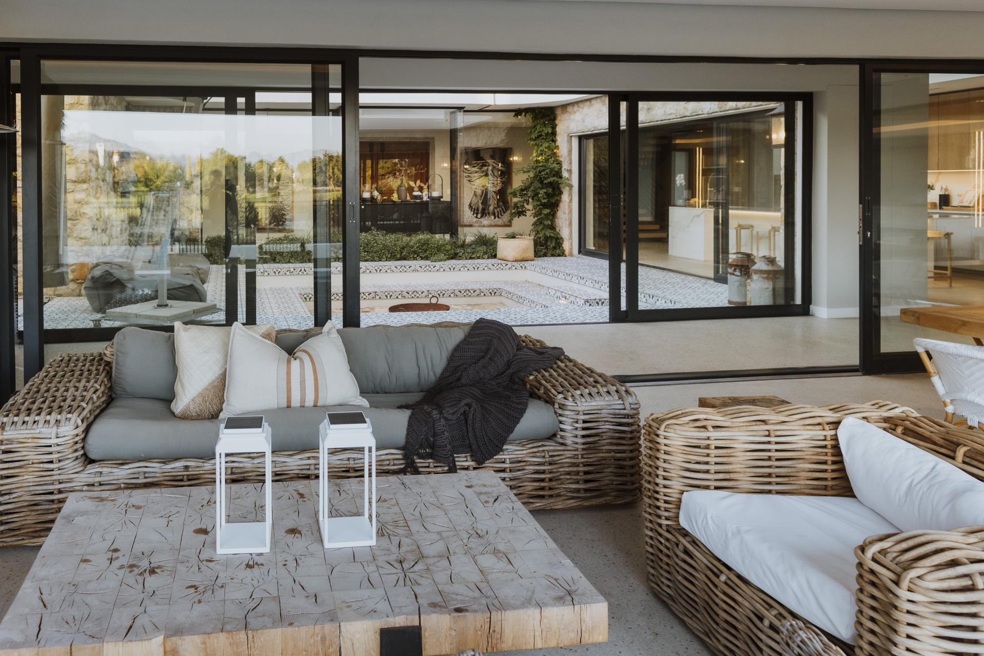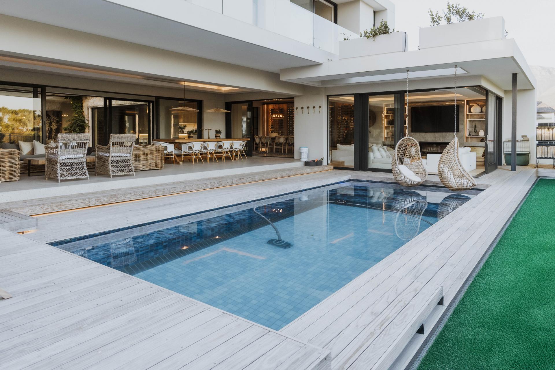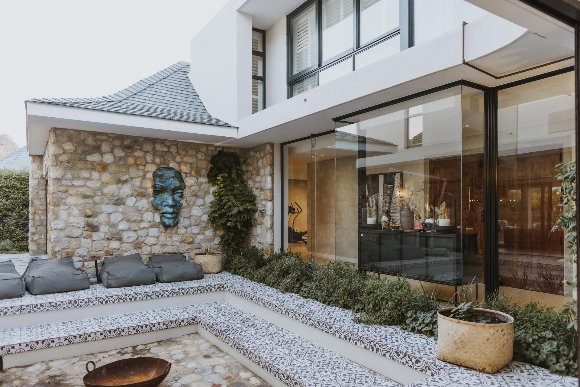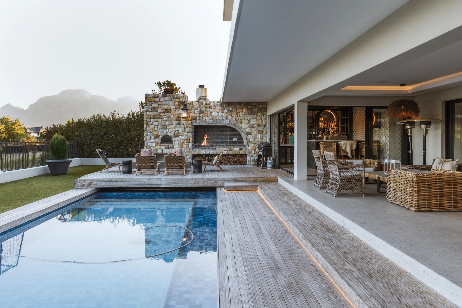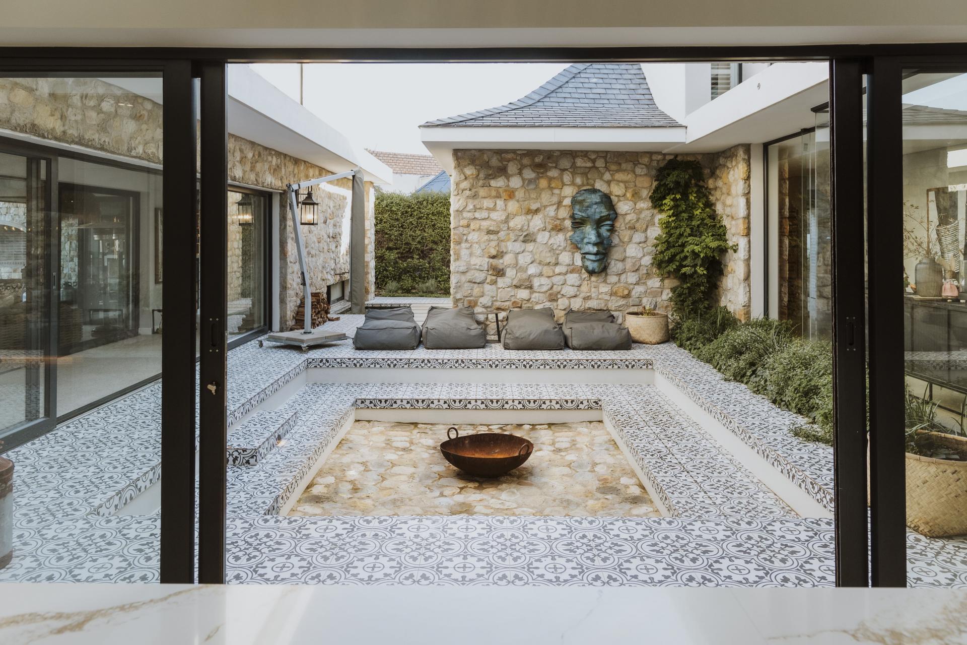 As you enter the home through the double wooden doors, you are amazed by the sheer beauty that surrounds you as the entire outlook is captivating right from the entrance. The house is built around an open courtyard that includes a large square fire pit surrounded by Victorian style tiles. All areas open onto this magnificent entertainment space and thus it forms the central hub. From here you will find the dining room, with an exceptional floor to ceiling glassed in wine display. This area then opens to the well sized TV room which is slightly sunken. A stunning fireplace heats the room in winter and the expansive glass doors open onto the garden and patio for summer entertaining. This home is built for socialising and offers a patio that includes a dining area as well as 2 separate sitting enclaves. A stunning state of the art bar opens out onto this patio as well as onto the braai and pizza oven. The heated pool with an automatic pool cover completes this amazing design.