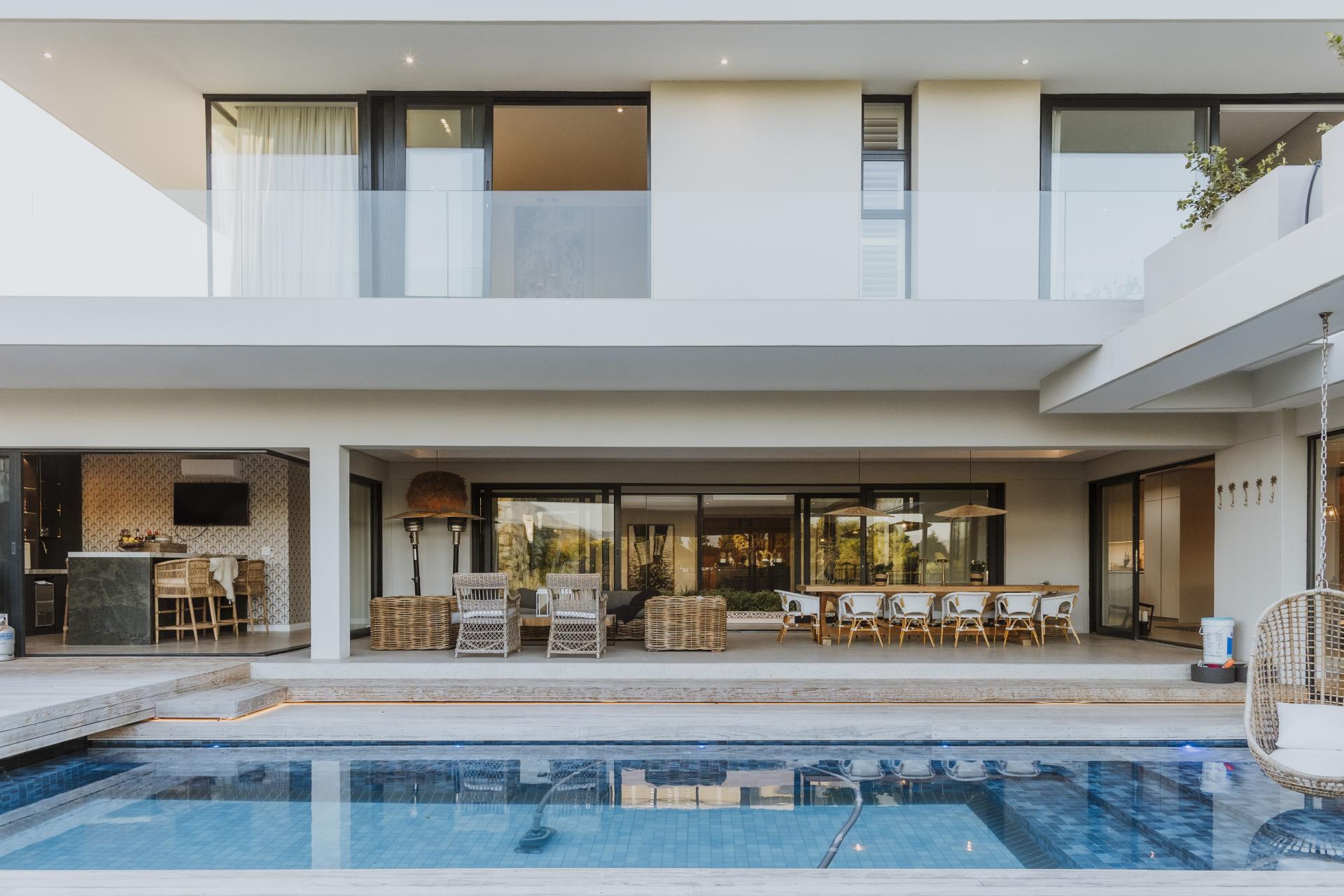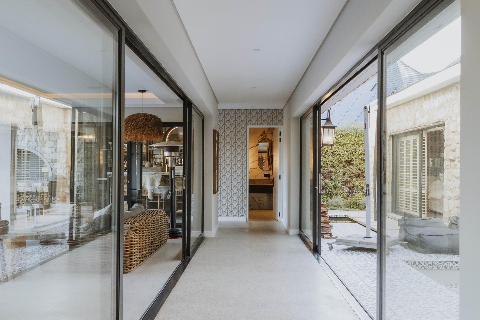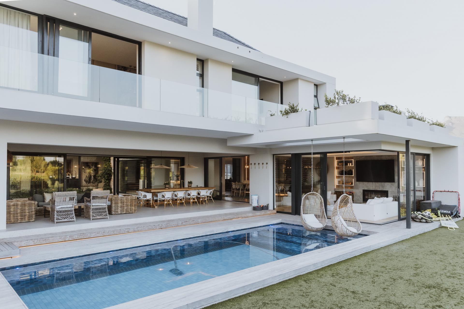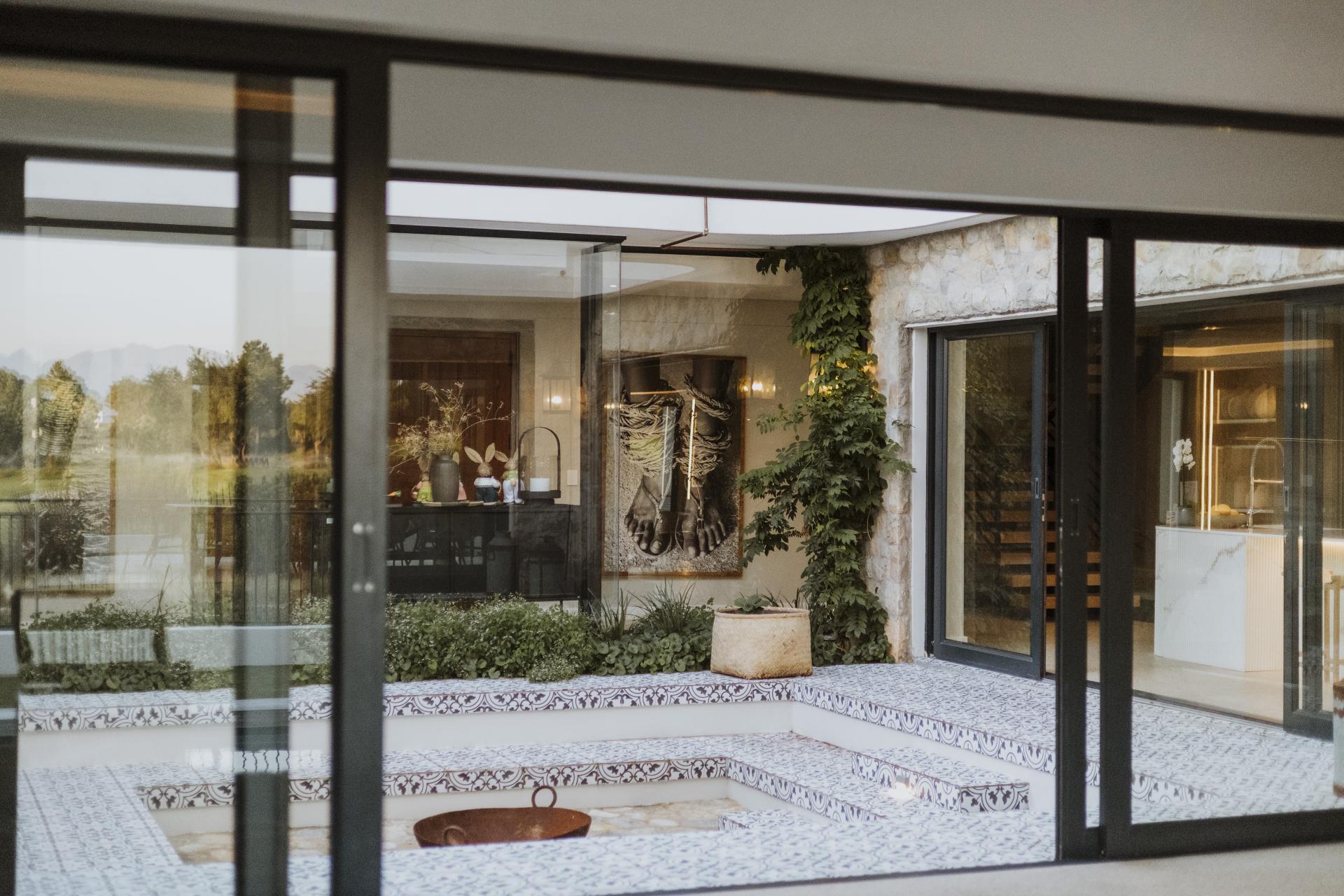 As you enter the home through the double wooden doors, you are amazed by the sheer beauty that surrounds you as the entire outlook is captivating right from the entrance. The house is built around an open courtyard that includes a large square fire pit surrounded by Victorian style tiles. All areas open onto this magnificent entertainment space and thus it forms the central hub. From here you will find the dining room, with an exceptional floor to ceiling glassed in wine display. This area then opens to the well sized TV room which is slightly sunken. A stunning fireplace heats the room in winter and the expansive glass doors open onto the garden and patio for summer entertaining. This home is built for socialising and offers a patio that includes a dining area as well as 2 separate sitting enclaves. A stunning state of the art bar opens out onto this patio as well as onto the braai and pizza oven. The heated pool with an automatic pool cover completes this amazing design.