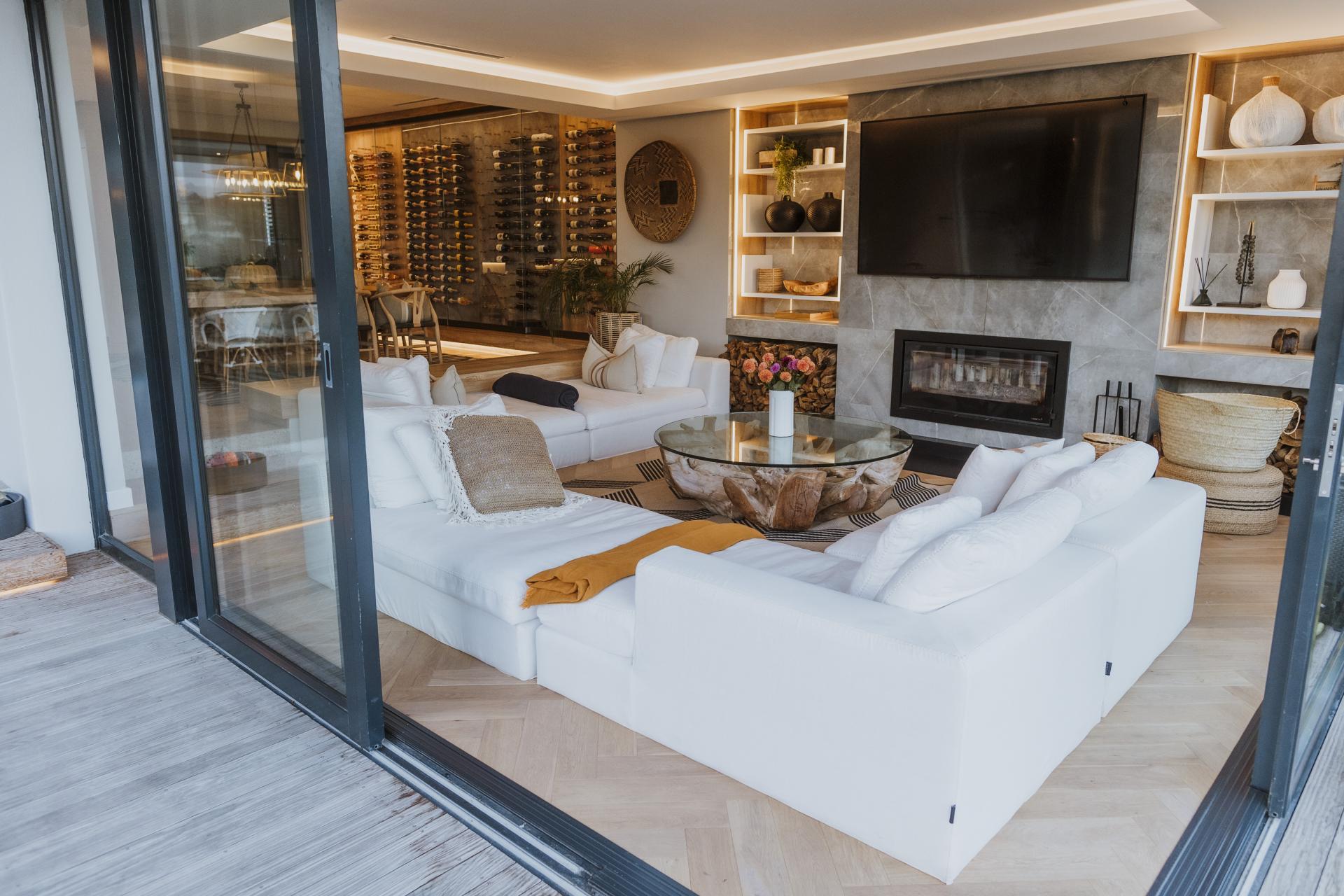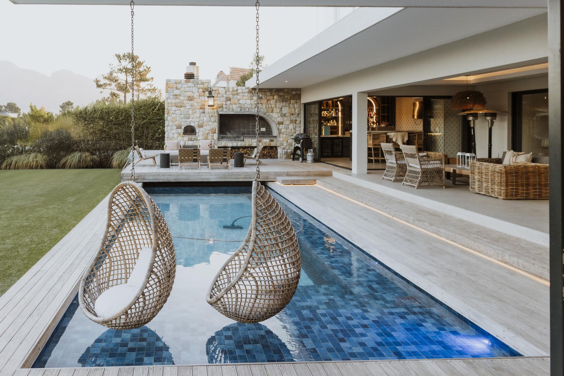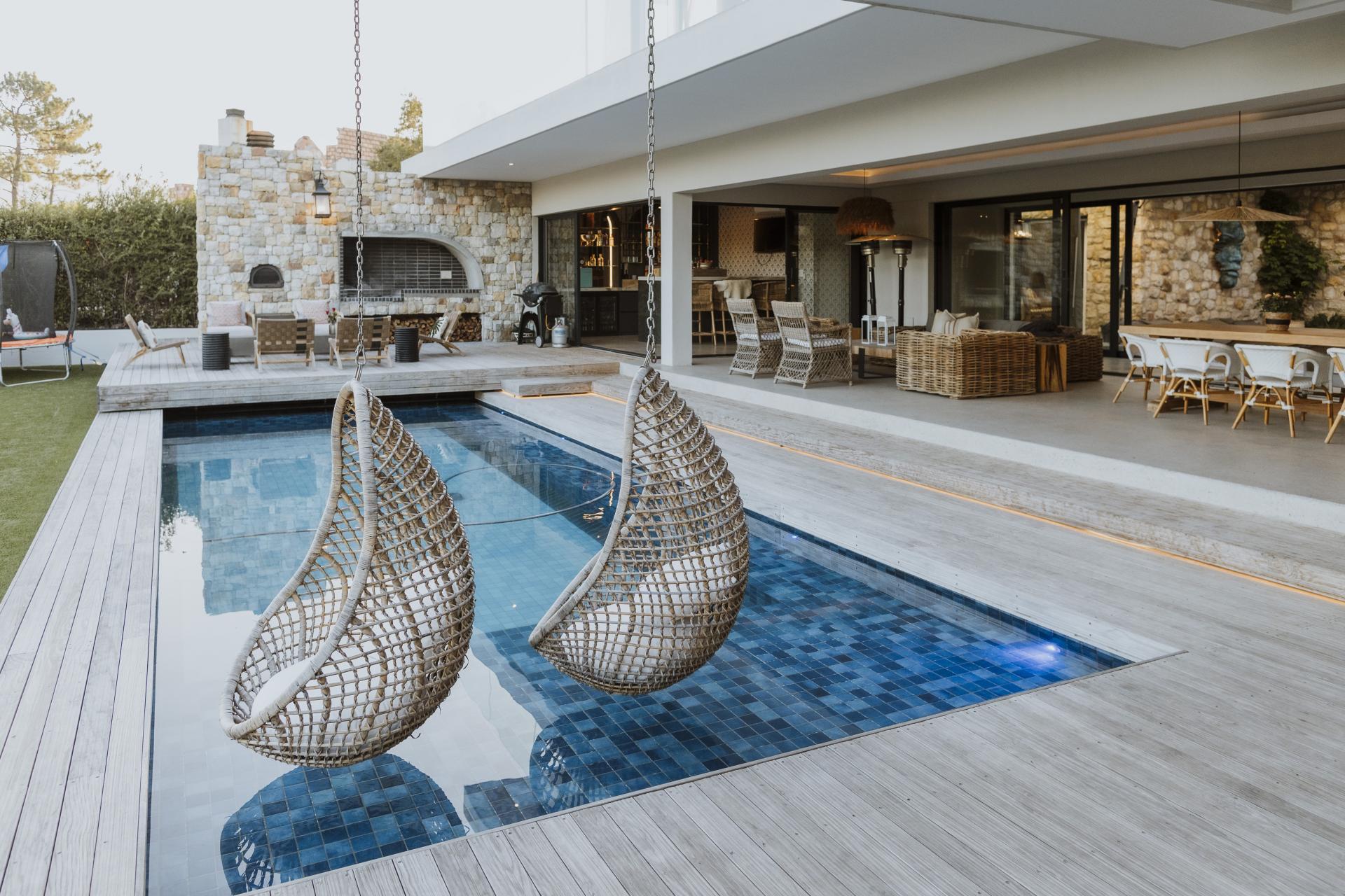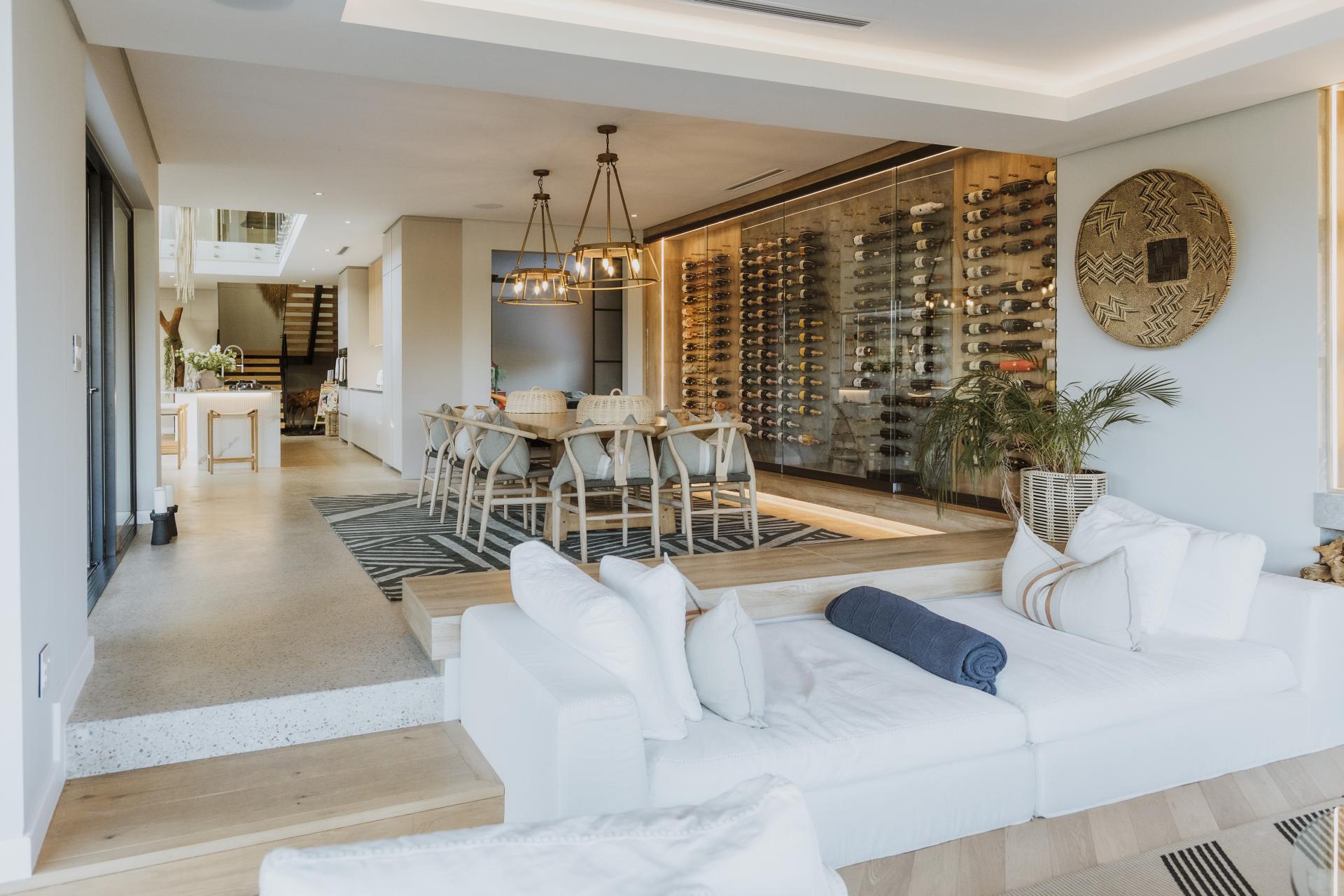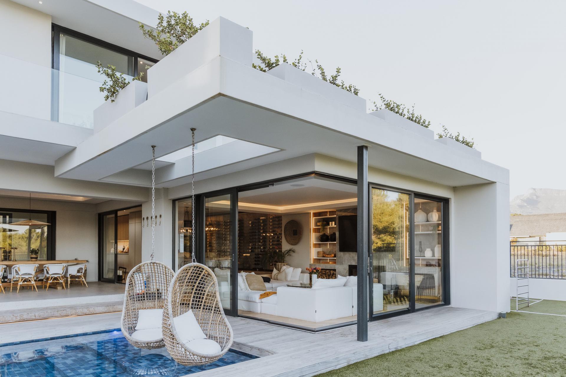 As you enter the home through the double wooden doors, you are amazed by the sheer beauty that surrounds you as the entire outlook is captivating right from the entrance. The house is built around an open courtyard that includes a large square fire pit surrounded by Victorian style tiles. All areas open onto this magnificent entertainment space and thus it forms the central hub. From here you will find the dining room, with an exceptional floor to ceiling glassed in wine display. This area then opens to the well sized TV room which is slightly sunken. A stunning fireplace heats the room in winter and the expansive glass doors open onto the garden and patio for summer entertaining. This home is built for socialising and offers a patio that includes a dining area as well as 2 separate sitting enclaves. A stunning state of the art bar opens out onto this patio as well as onto the braai and pizza oven. The heated pool with an automatic pool cover completes this amazing design.