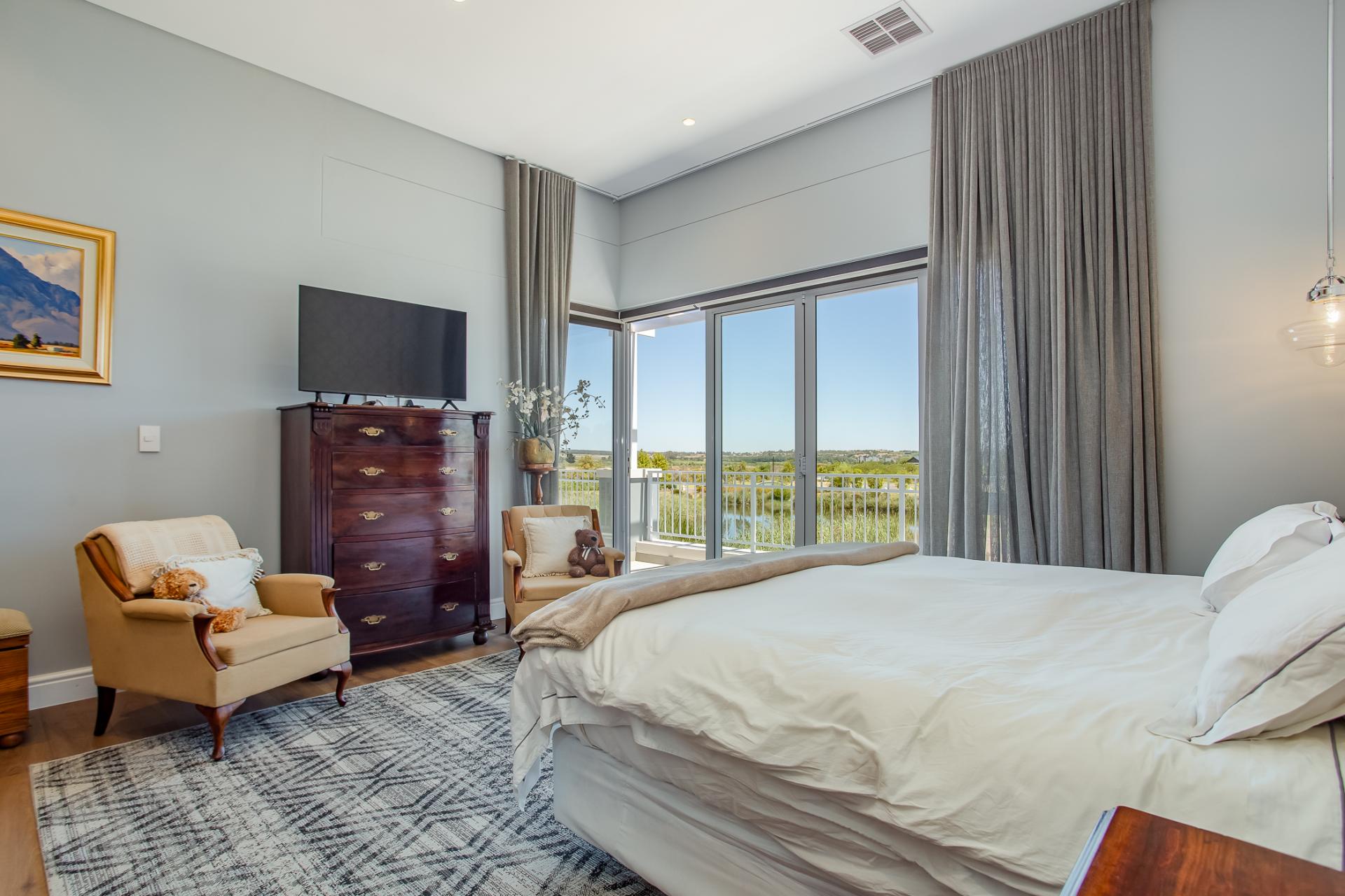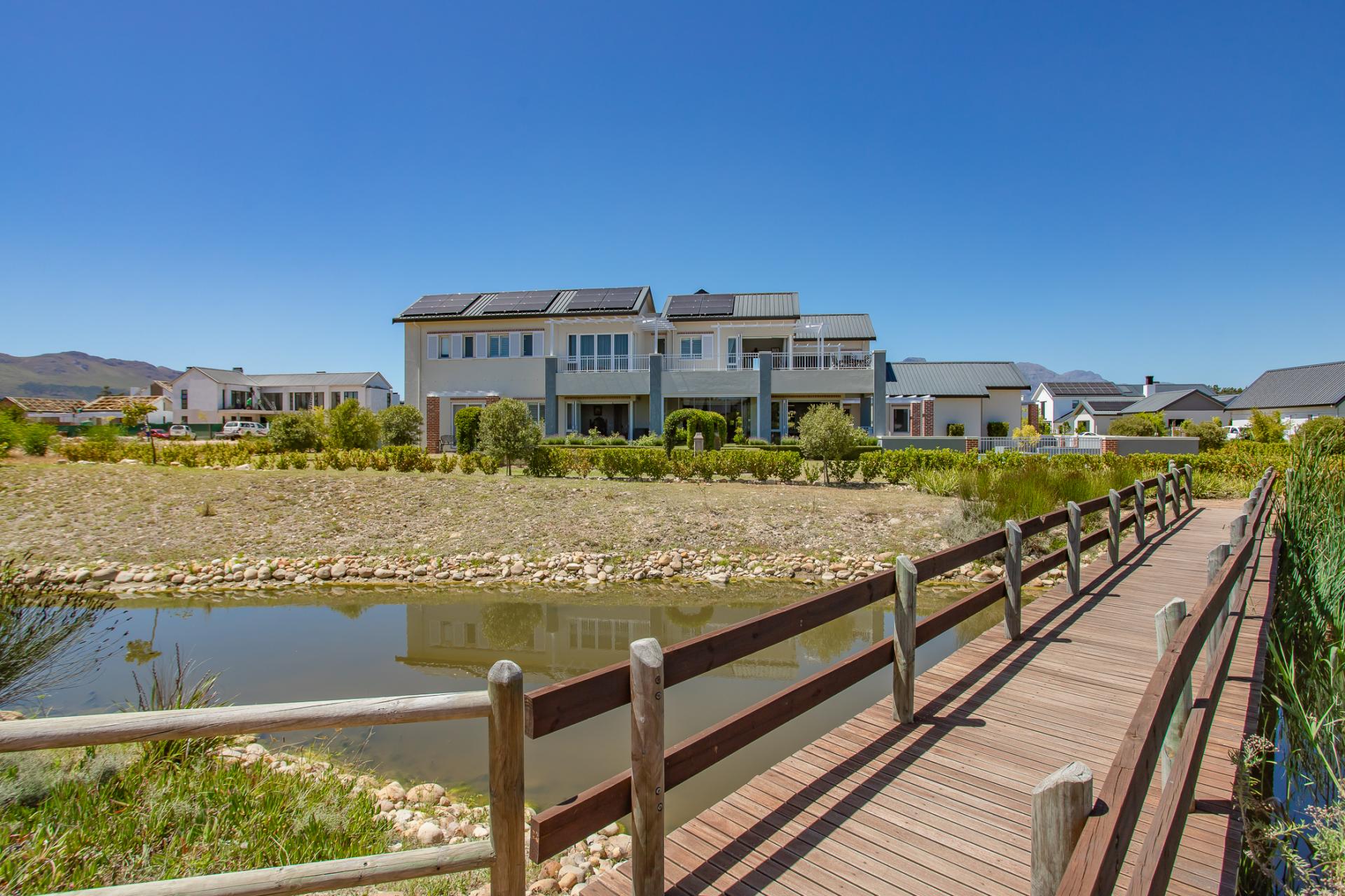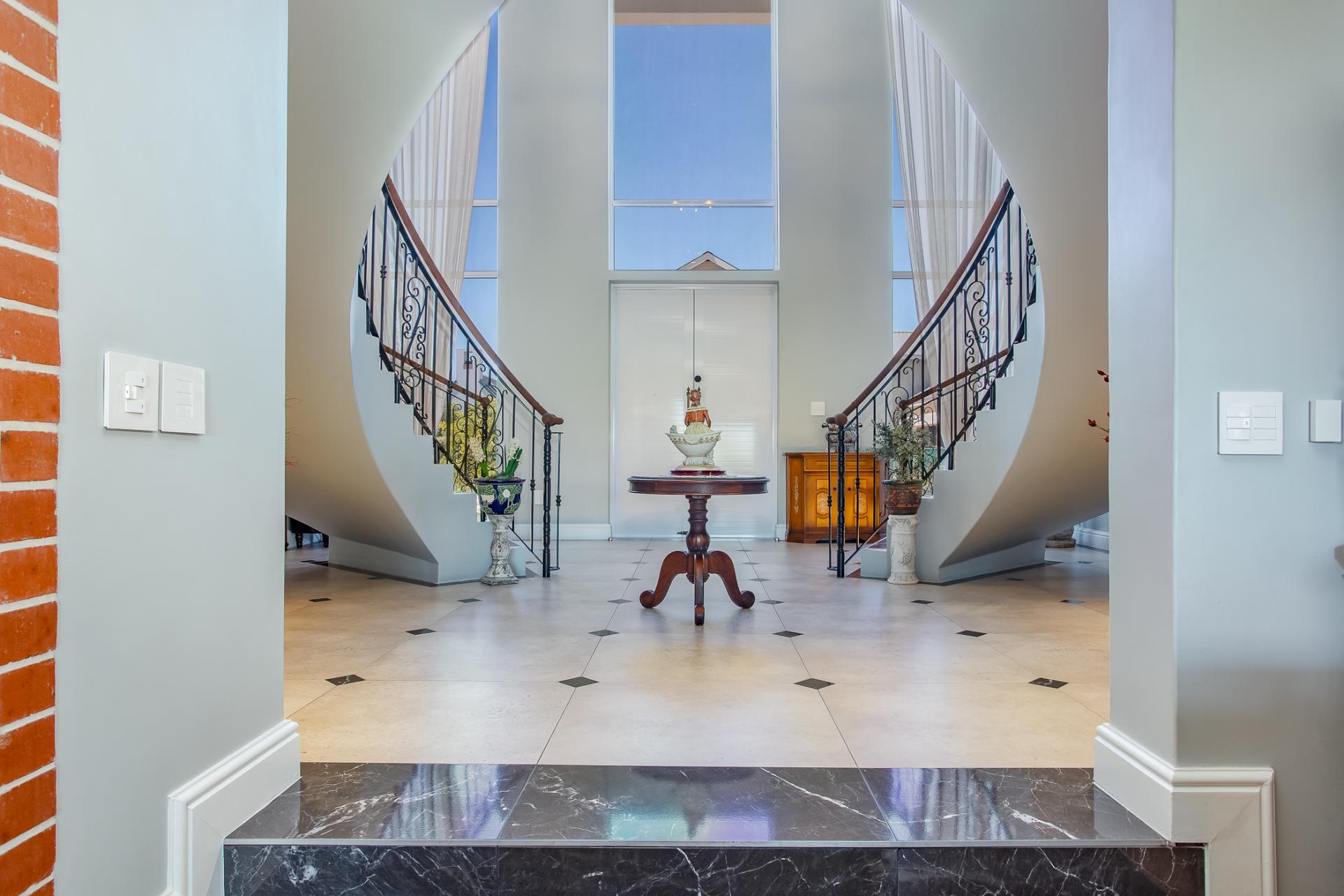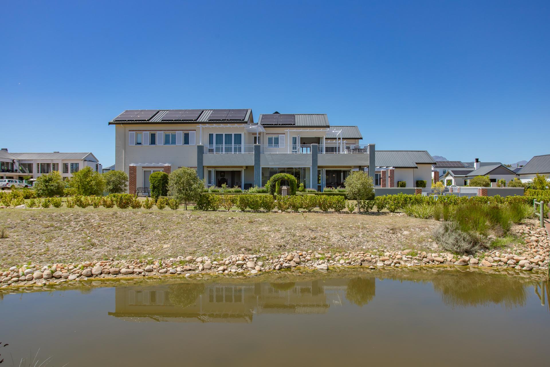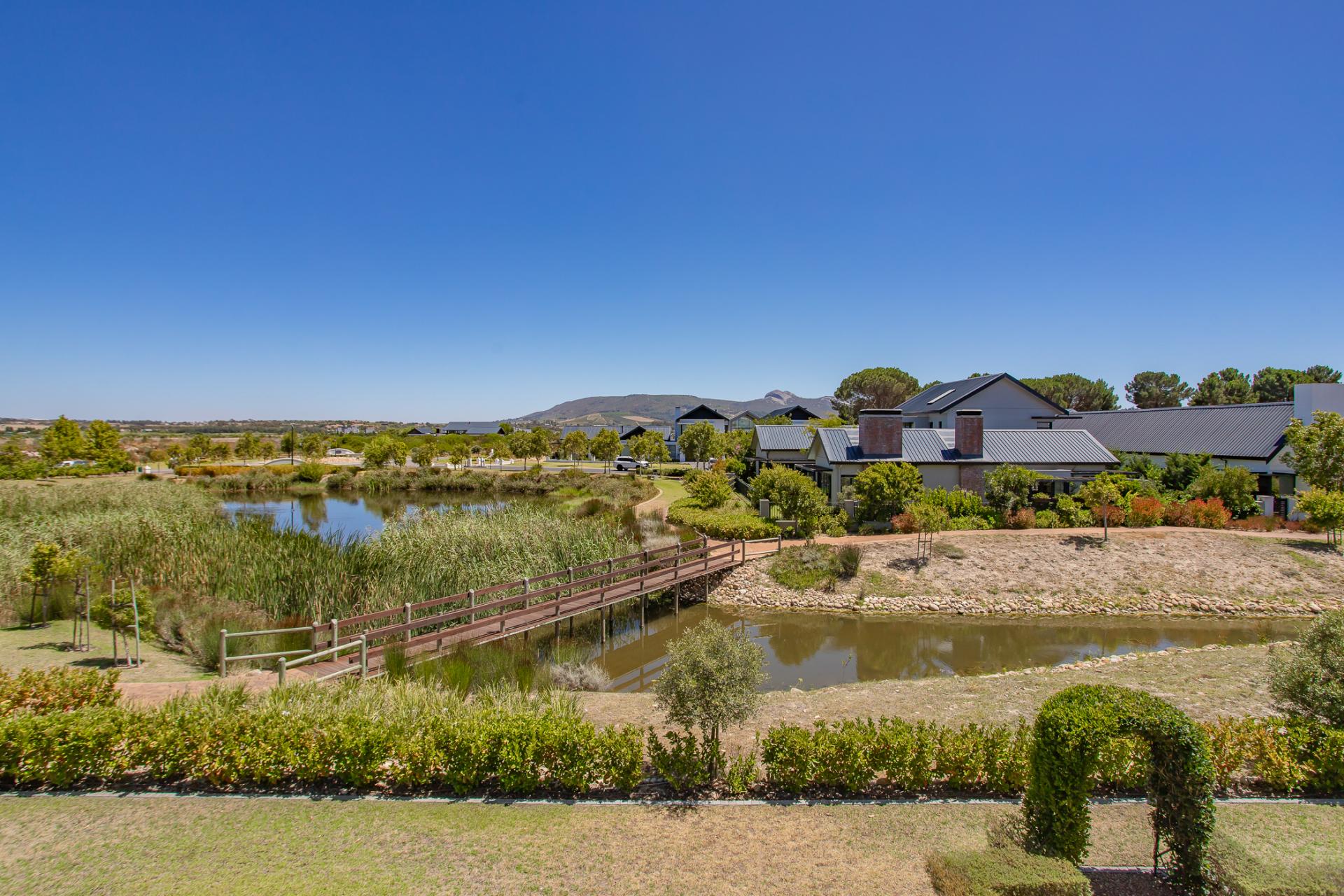 This magnificent north-facing residence, perfectly suited to a large family, enjoys uninterrupted views of the tranquil dam, lush parklands, and the surrounding mountain ranges.