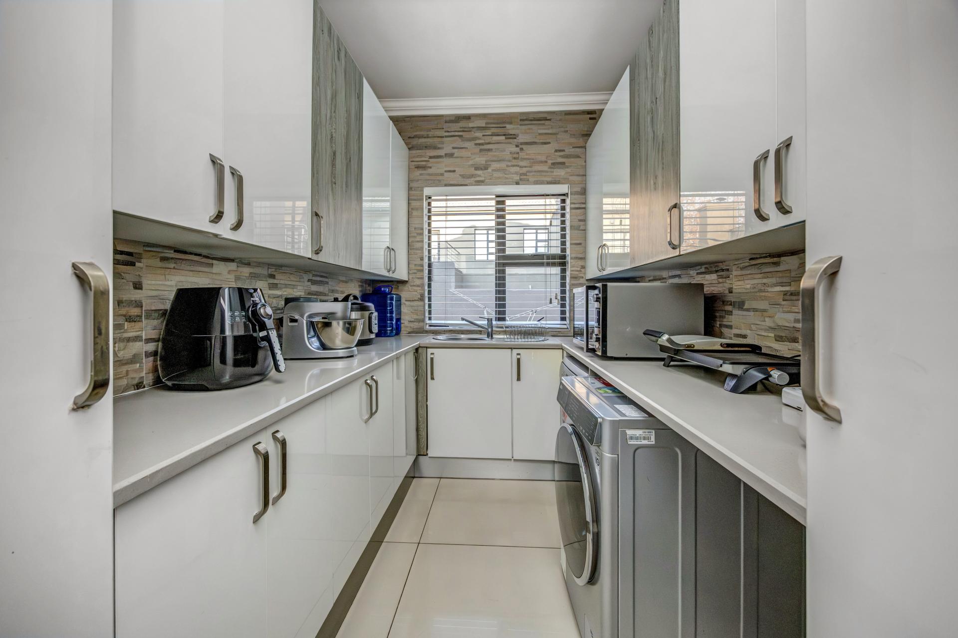 The gourmet kitchen features a center island and ample cabinetry, built-in appliances complemented by beautiful architectural finishes, and high ceilings. A double garage offers direct access into the home, and the property is nestled within a secure estate that provides greenbelt walkways and 24-hour manned security.