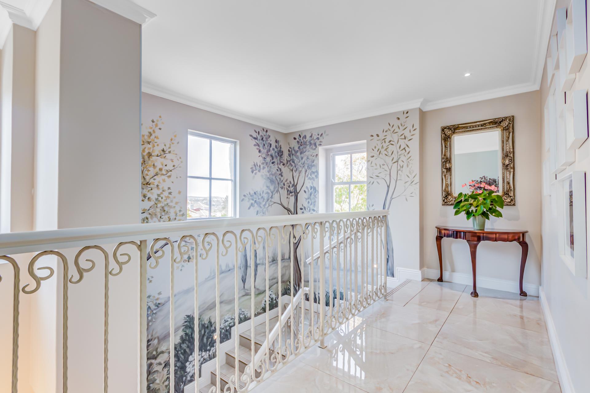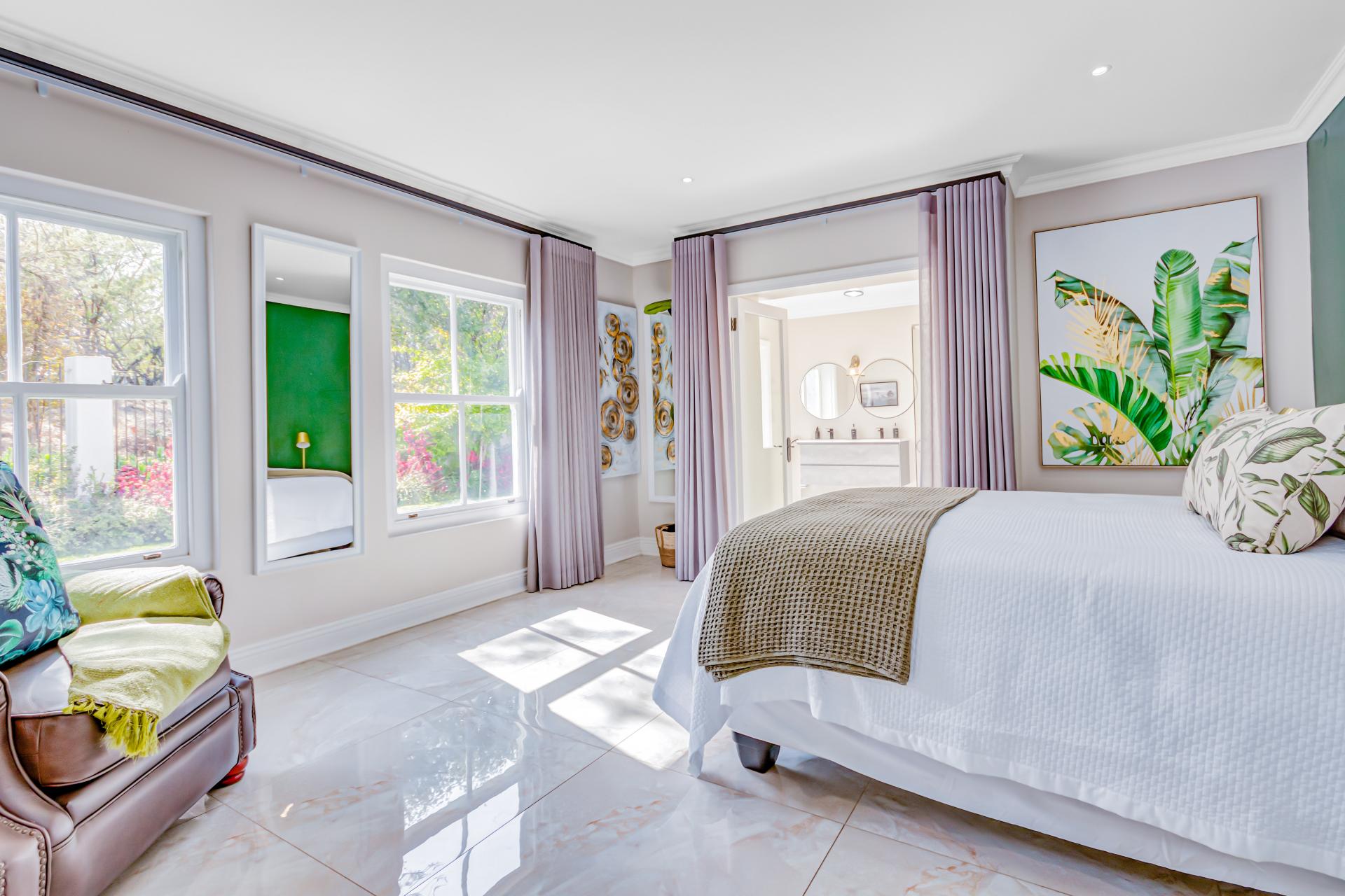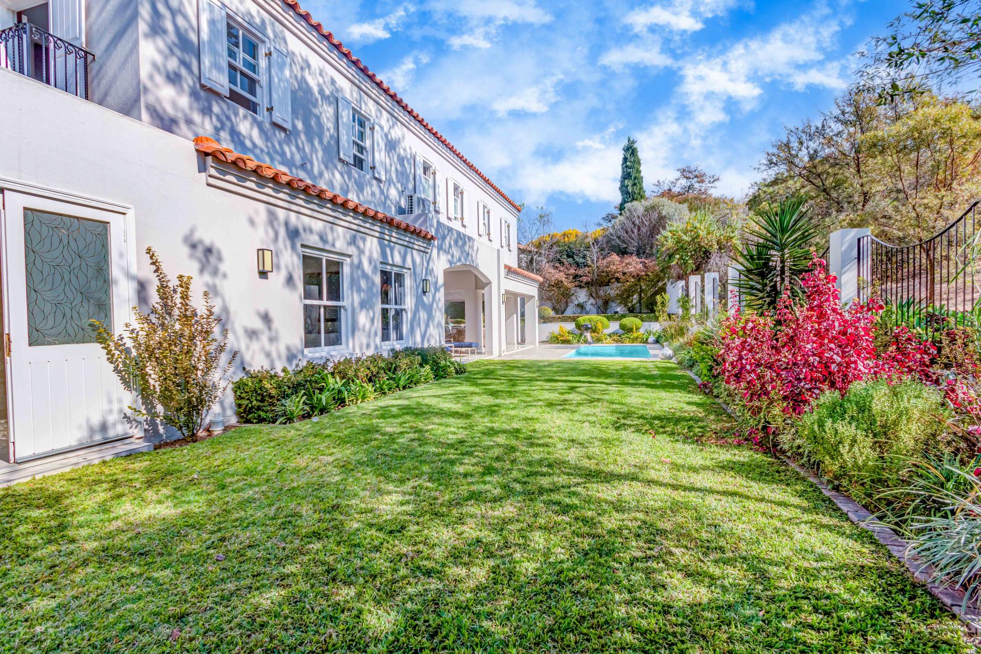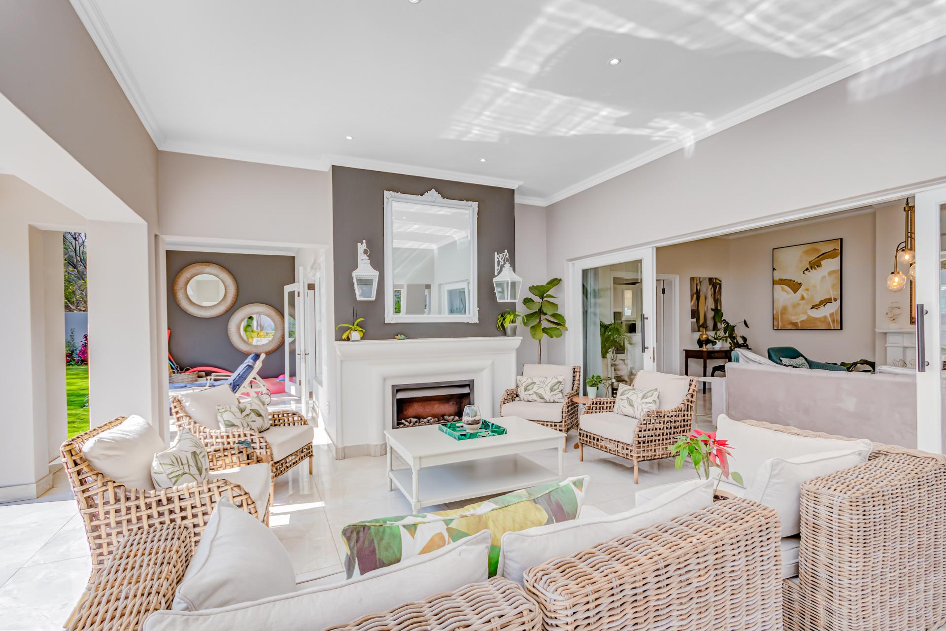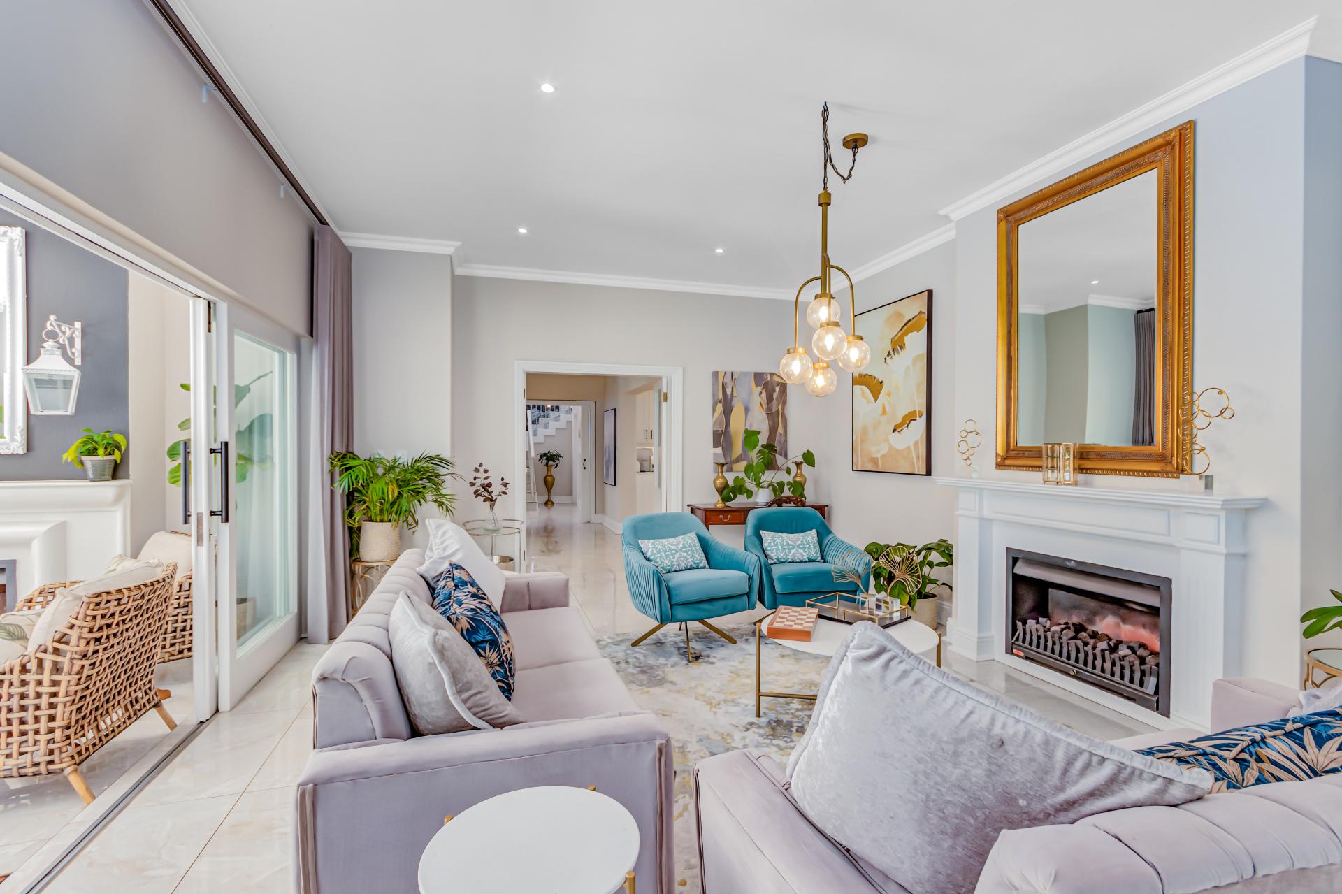 Upon entering through the grand French doors, you are greeted by a double-volume foyer that sets the tone for the elegance within. The heart of the home, the kitchen, is thoughtfully designed for entertaining. It seamlessly connects to the open-plan dining room and lounge, which extend to a spacious covered patio featuring a gas fireplace. This inviting space overlooks a beautifully landscaped garden, a true oasis of tranquility.