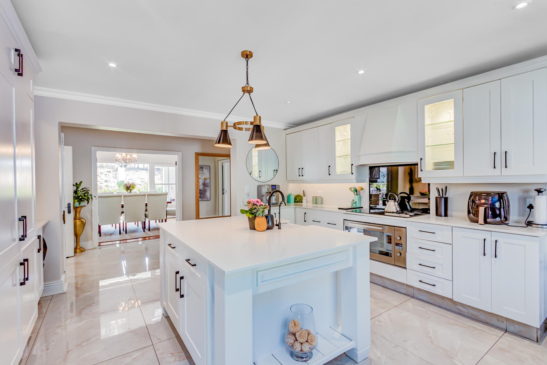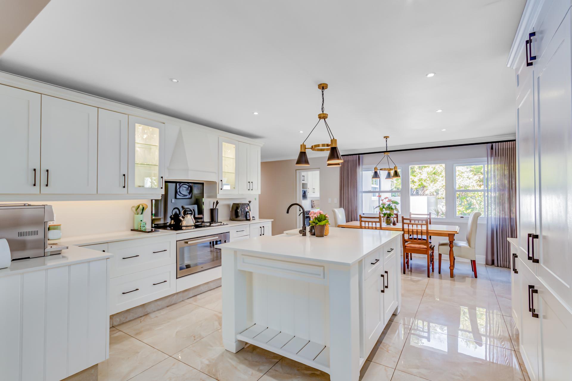 The kitchen is a chef's dream, boasting a large island, ample cupboard space, and a separate informal dining area/breakfast bar that opens to a charming courtyard.
