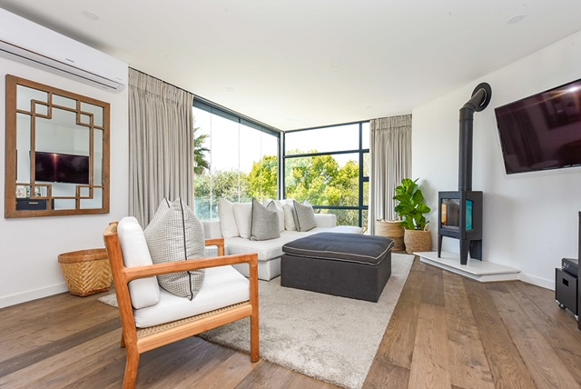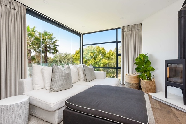 the greenbelt views from the expansive reception rooms that surround a state-of-the-art kitchen, featuring a large scullery and a walk-in pantry. Stacking glass doors effortlessly draw you to the covered patio and firepit, creating an enchanting space for