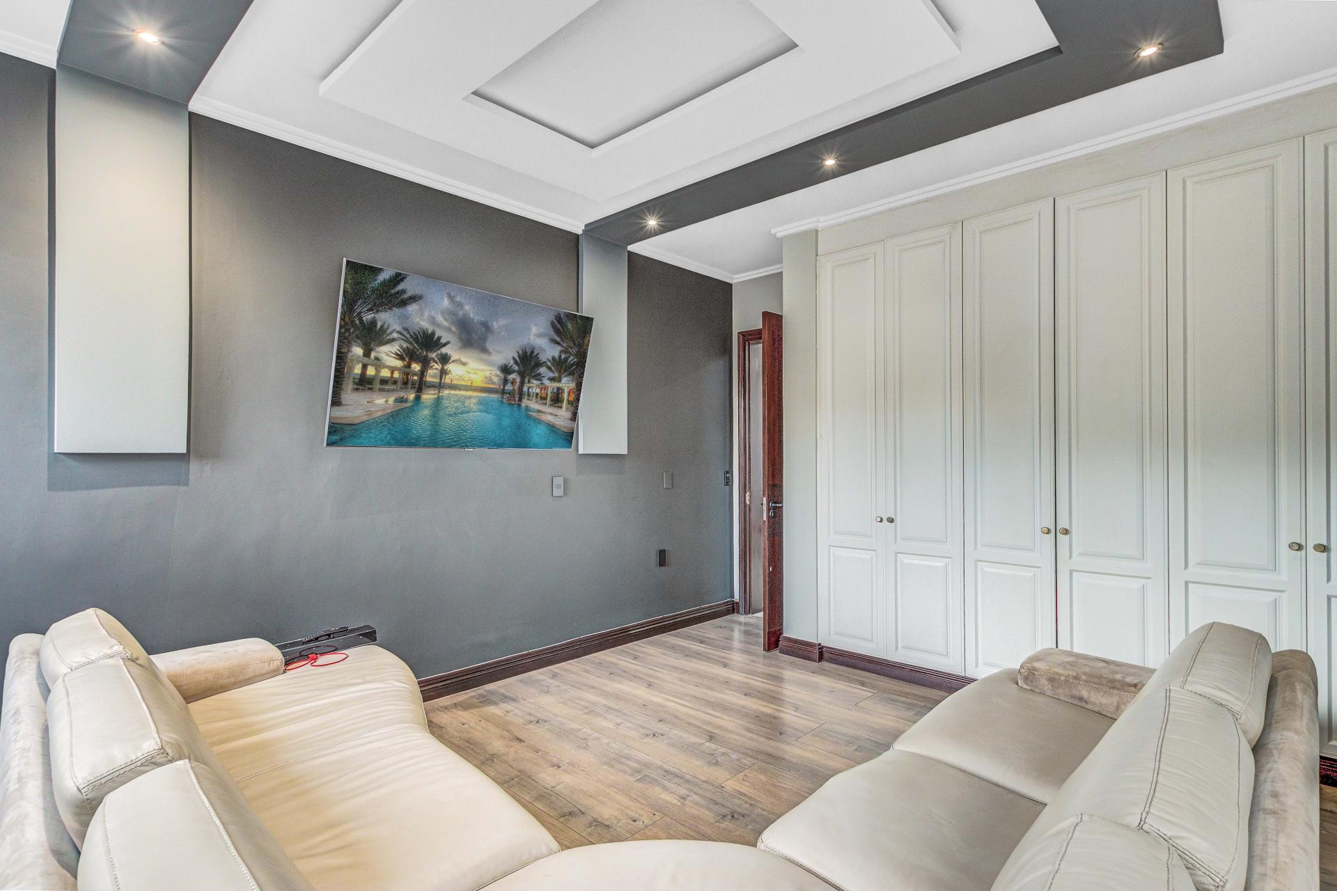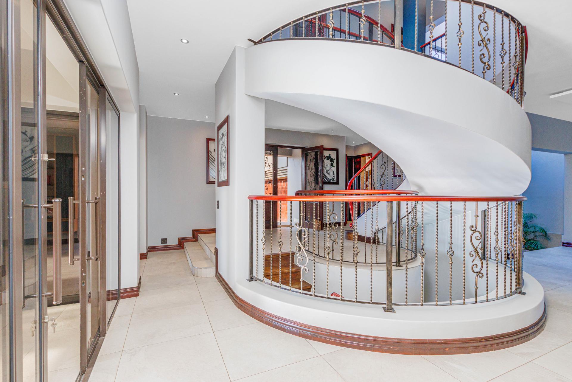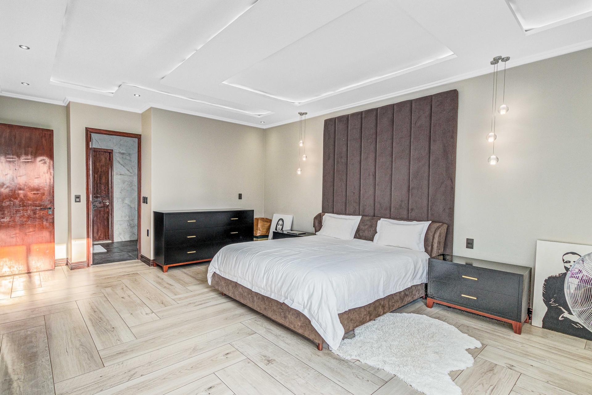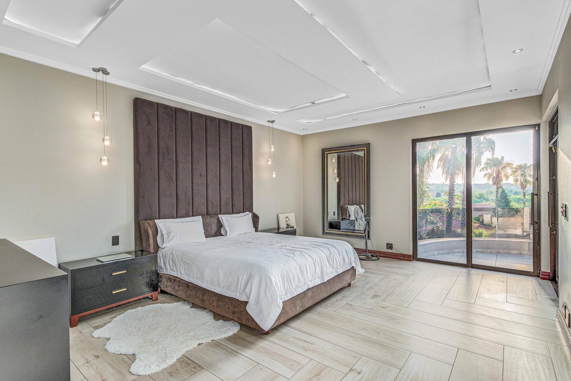The standout main suite is a true sanctuary, offering panoramic views of Dainfern Ridge, a grand ensuite bathroom, a walk-in dressing room, and a private balcony, double staff accommodation, 3 car automated garage and backup power.