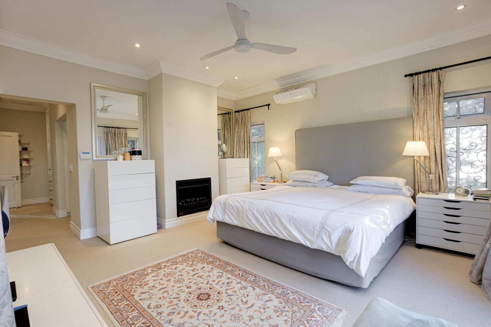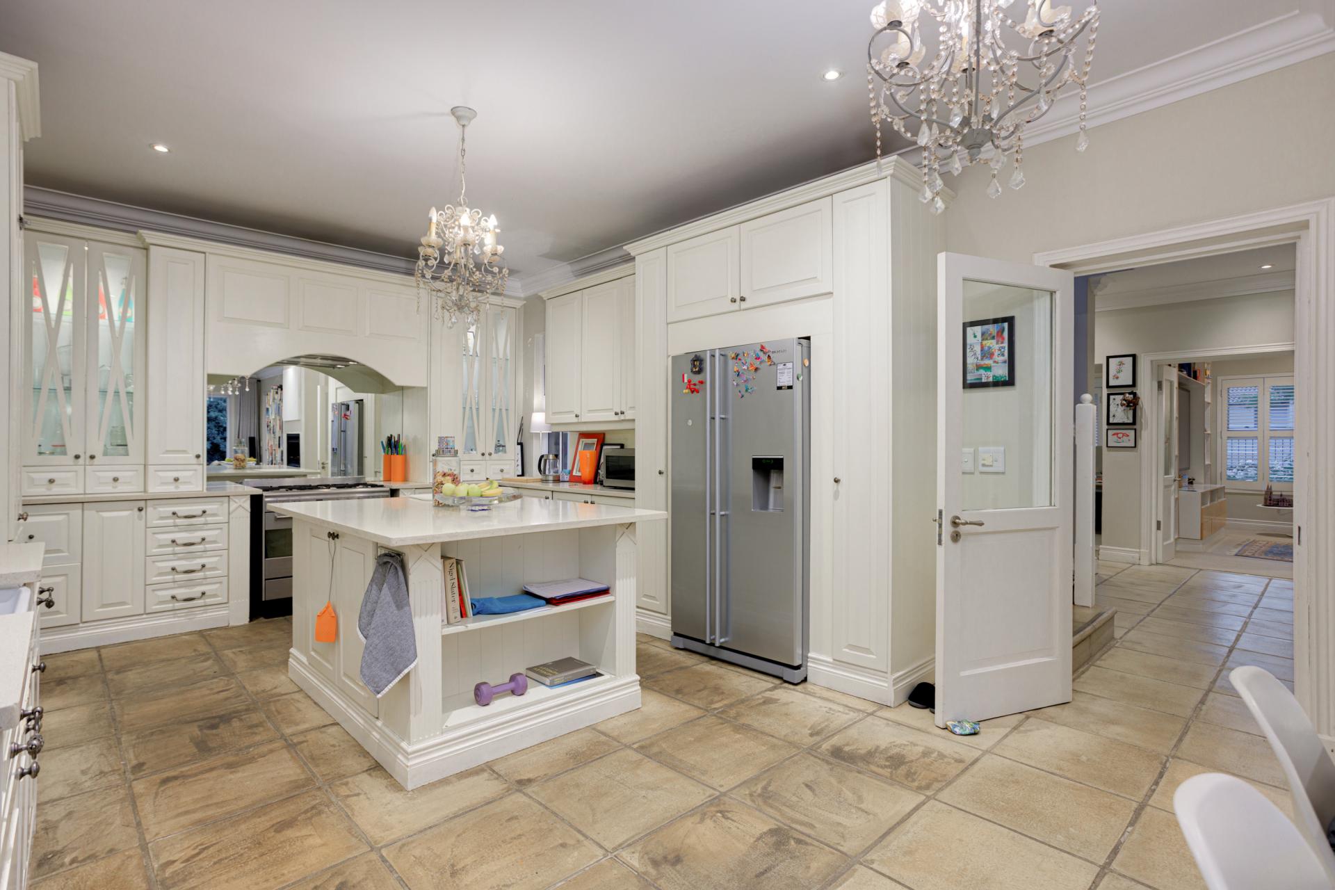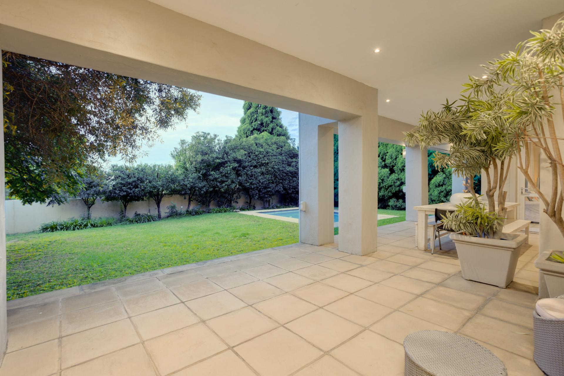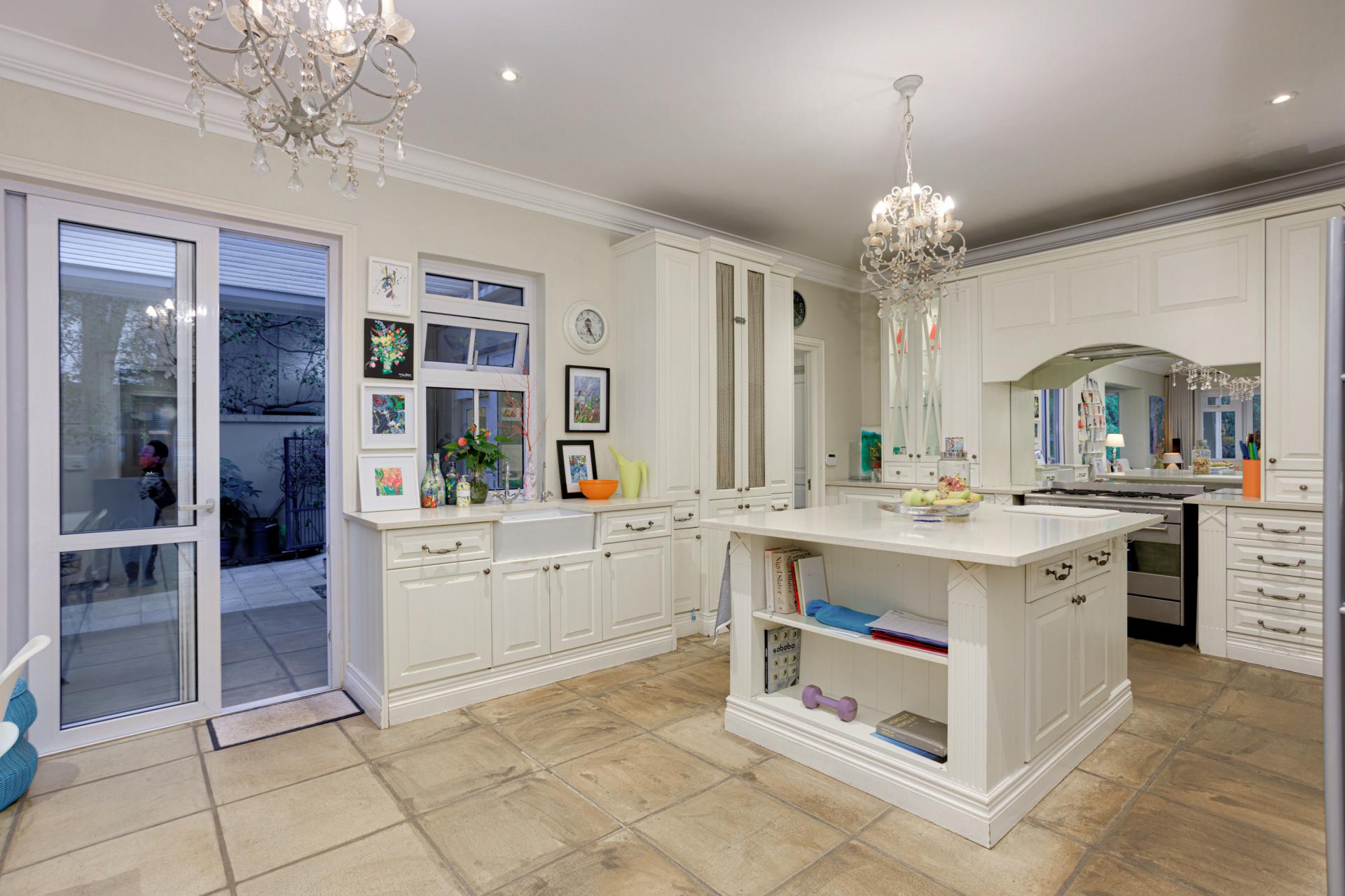 The main living areas are thoughtfully arranged, comprising a comfortable TV lounge with a gas fireplace, a formal dining room and a spacious open-plan lounge that also features a gas fireplace and connects effortlessly to the outdoors. All receptions are north-facing and open seamlessly onto a large, covered patio that’s perfect for entertaining, spilling out onto an expansive garden and a glistening swimming pool. The gourmet kitchen is elegantly finished with marble countertops and features a separate scullery, making it both functional and stylish for everyday living and hosting. Tucked away downstairs, a beautifully appointed study that overlooks a charming rose garden offers the ideal space for a quiet home office or library, or can alternatively serve as a private guest suite with its own en suite bathroom.