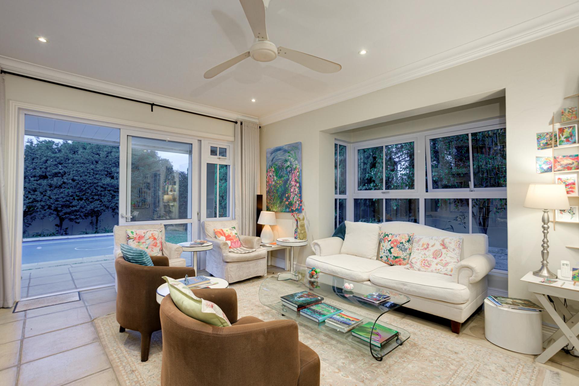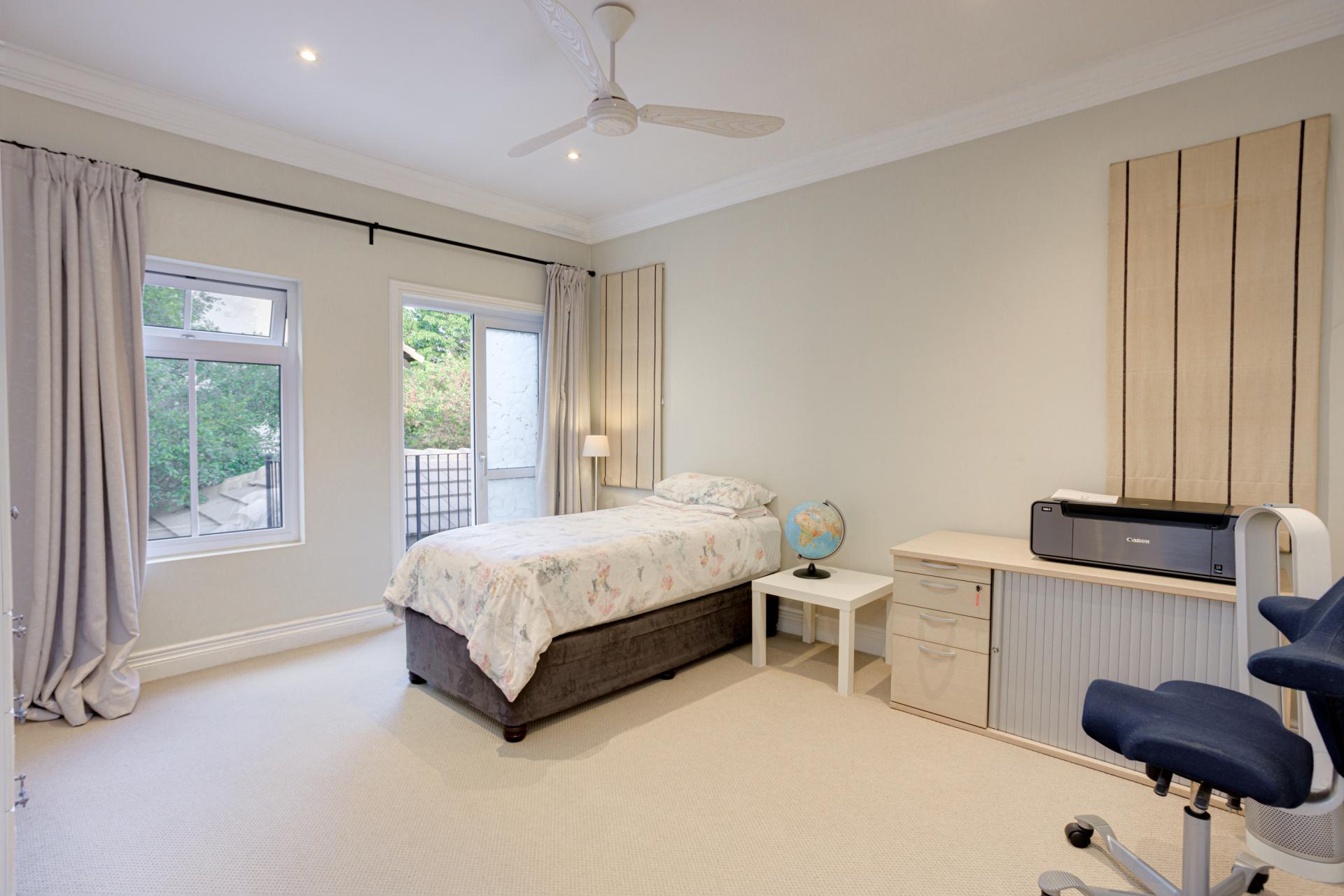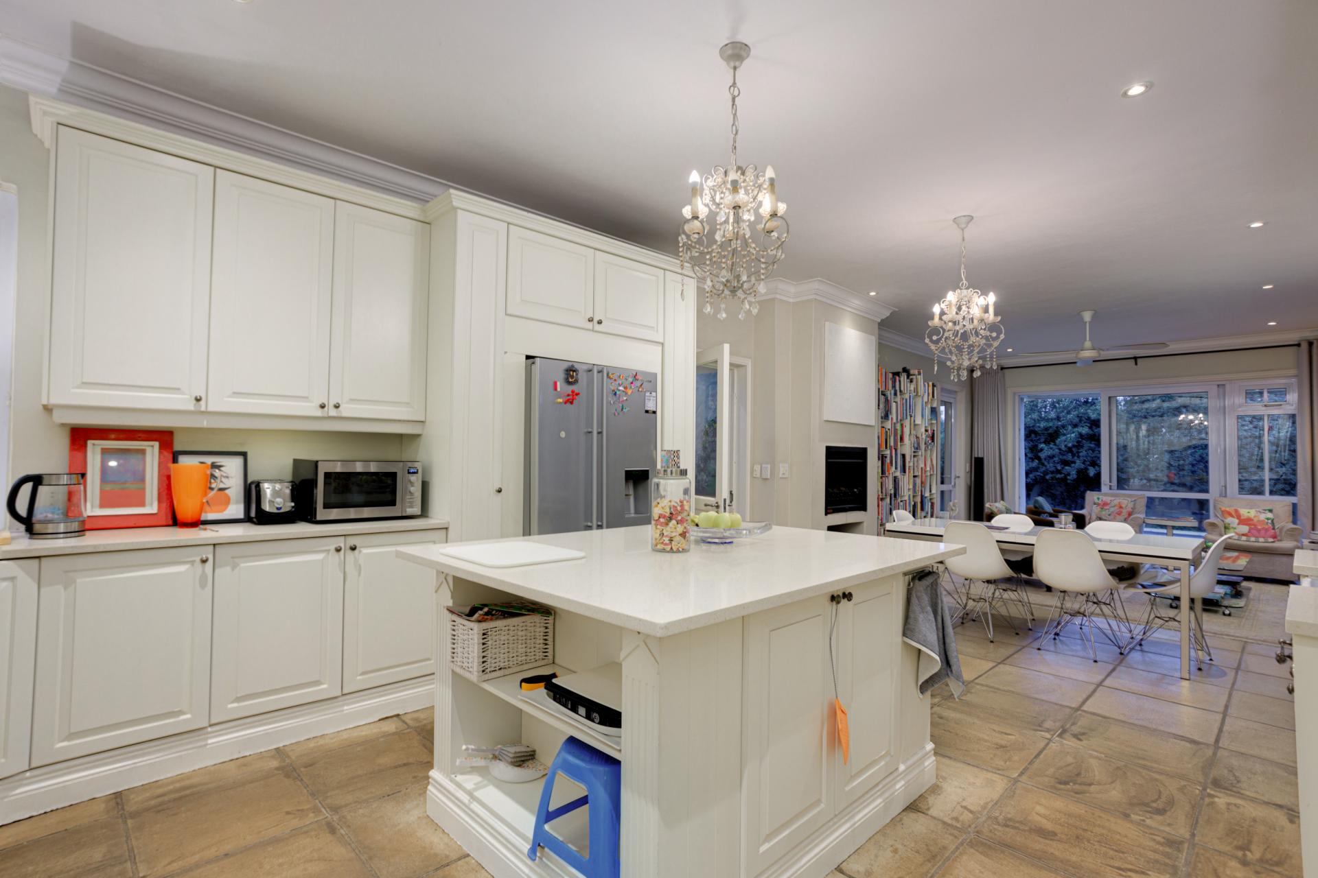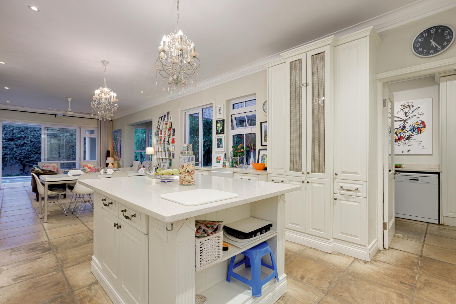 The main living areas are thoughtfully arranged, comprising a comfortable TV lounge with a gas fireplace, a formal dining room and a spacious open-plan lounge that also features a gas fireplace and connects effortlessly to the outdoors. All receptions are north-facing and open seamlessly onto a large, covered patio that’s perfect for entertaining, spilling out onto an expansive garden and a glistening swimming pool. The gourmet kitchen is elegantly finished with marble countertops and features a separate scullery, making it both functional and stylish for everyday living and hosting. Tucked away downstairs, a beautifully appointed study that overlooks a charming rose garden offers the ideal space for a quiet home office or library, or can alternatively serve as a private guest suite with its own en suite bathroom.