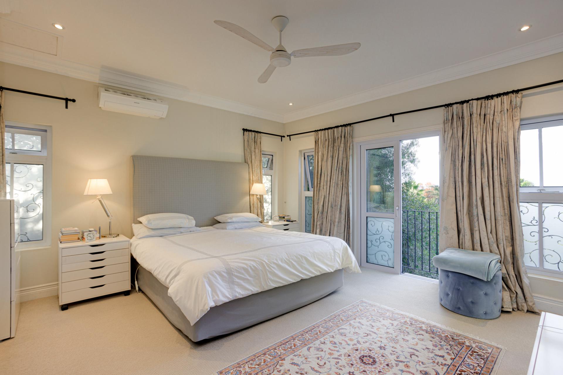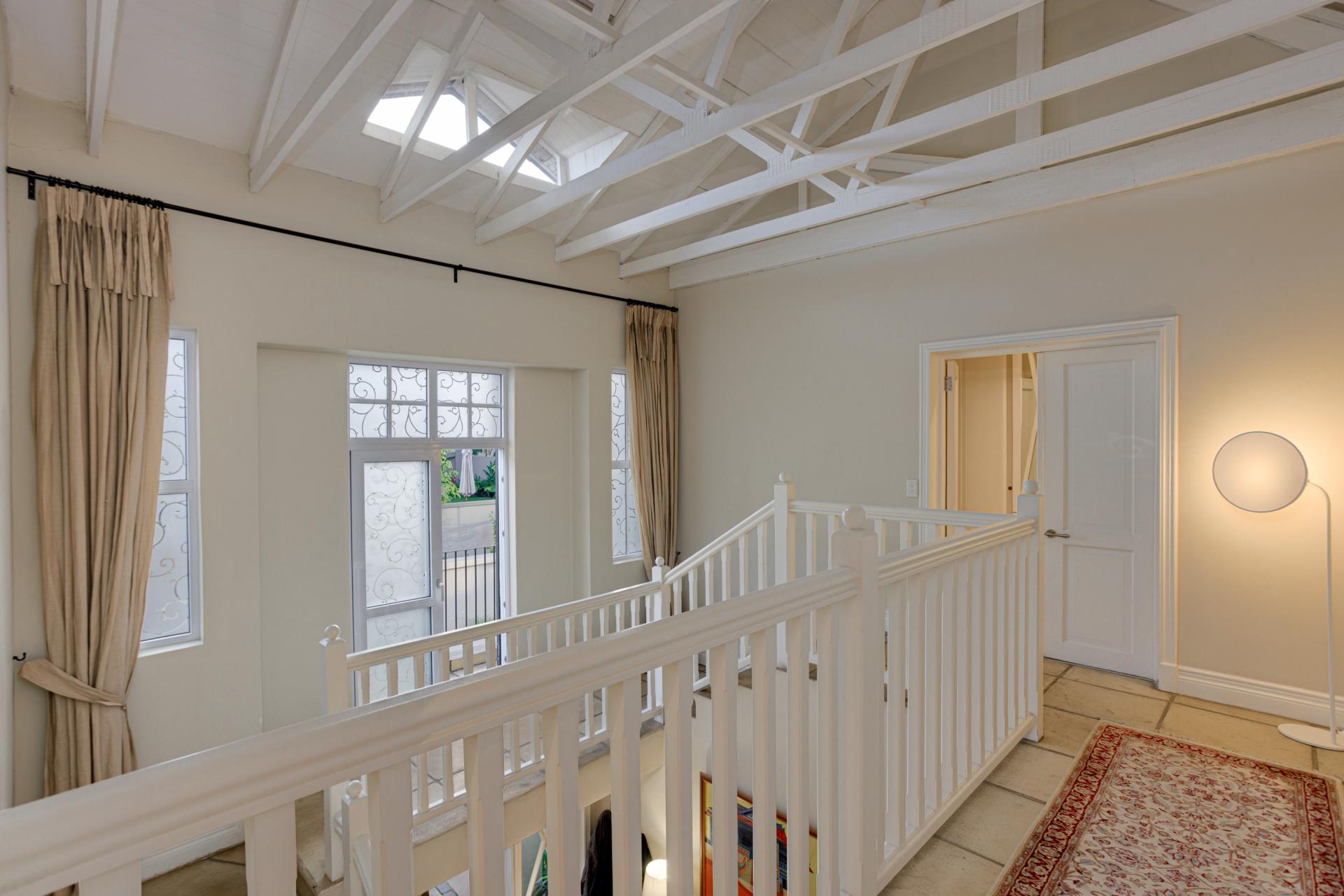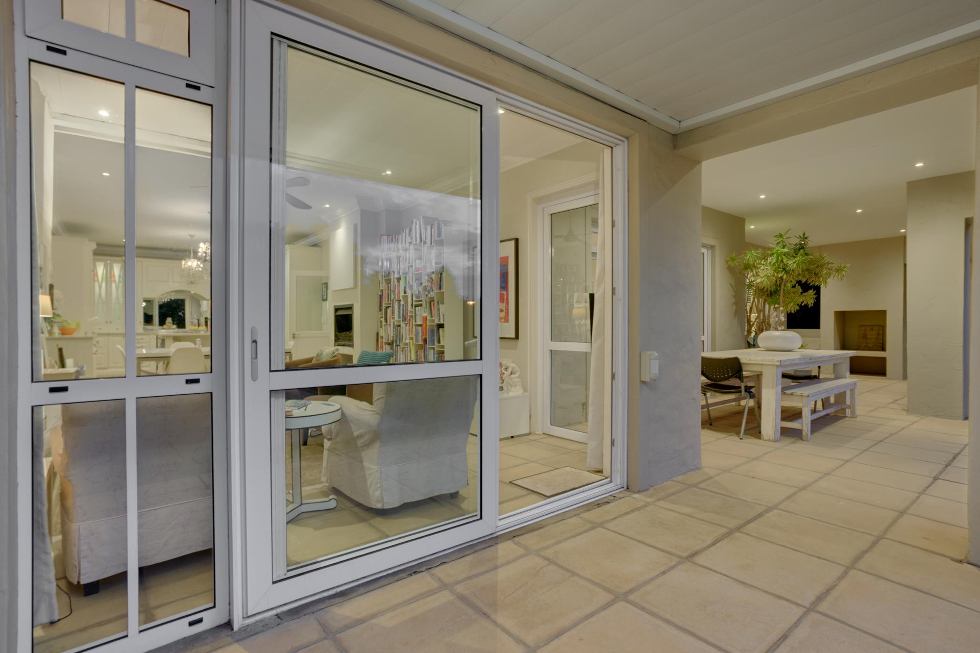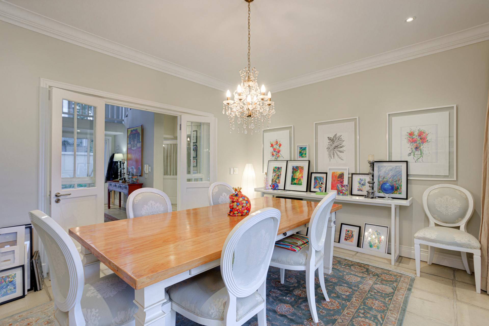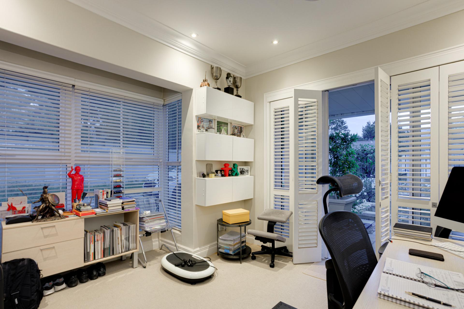 The main living areas are thoughtfully arranged, comprising a comfortable TV lounge with a gas fireplace, a formal dining room and a spacious open-plan lounge that also features a gas fireplace and connects effortlessly to the outdoors. All receptions are north-facing and open seamlessly onto a large, covered patio that’s perfect for entertaining, spilling out onto an expansive garden and a glistening swimming pool. The gourmet kitchen is elegantly finished with marble countertops and features a separate scullery, making it both functional and stylish for everyday living and hosting. Tucked away downstairs, a beautifully appointed study that overlooks a charming rose garden offers the ideal space for a quiet home office or library, or can alternatively serve as a private guest suite with its own en suite bathroom.