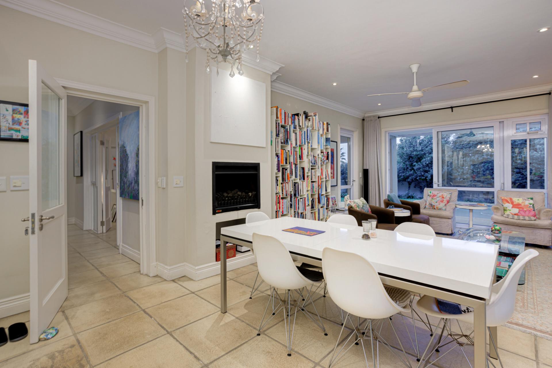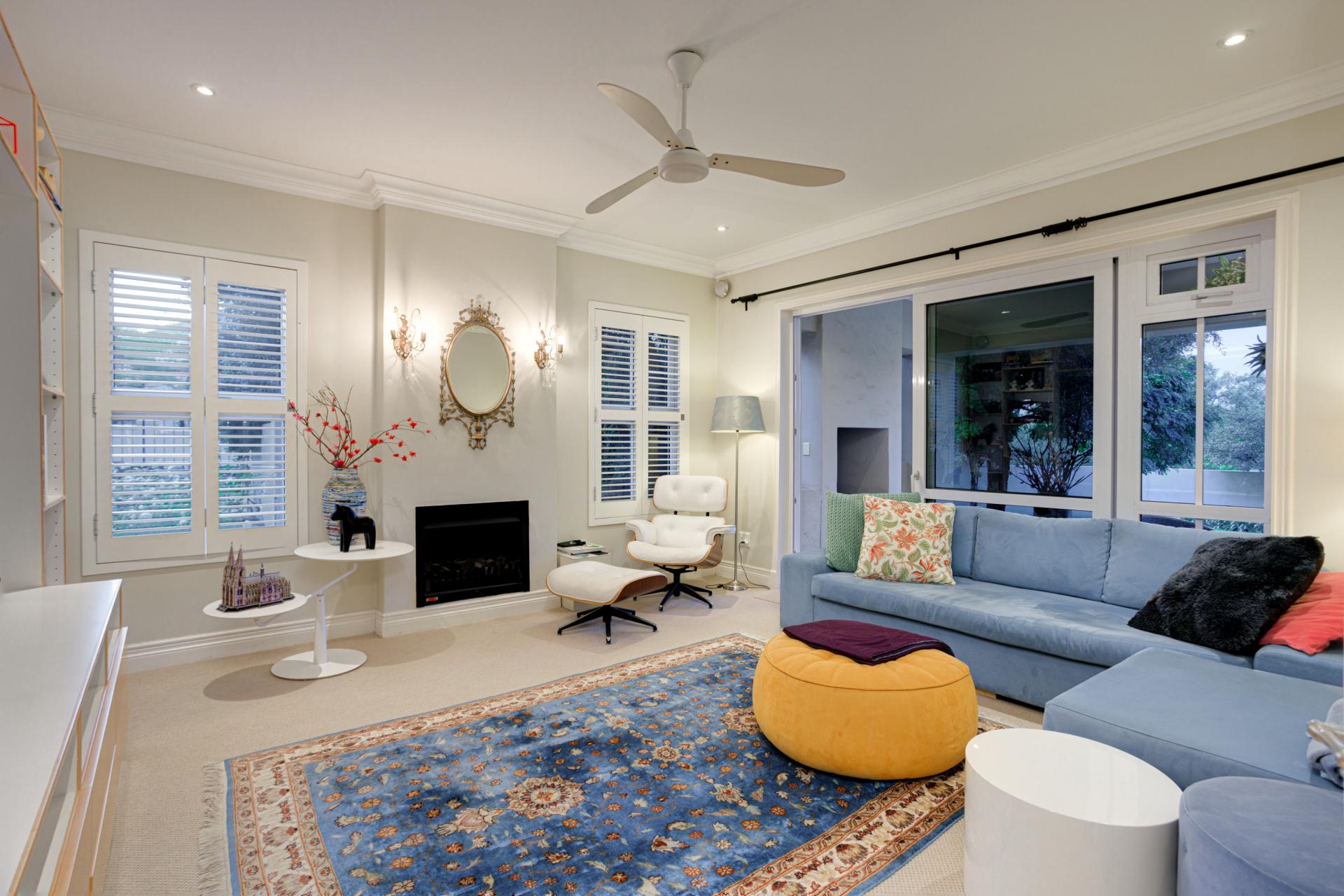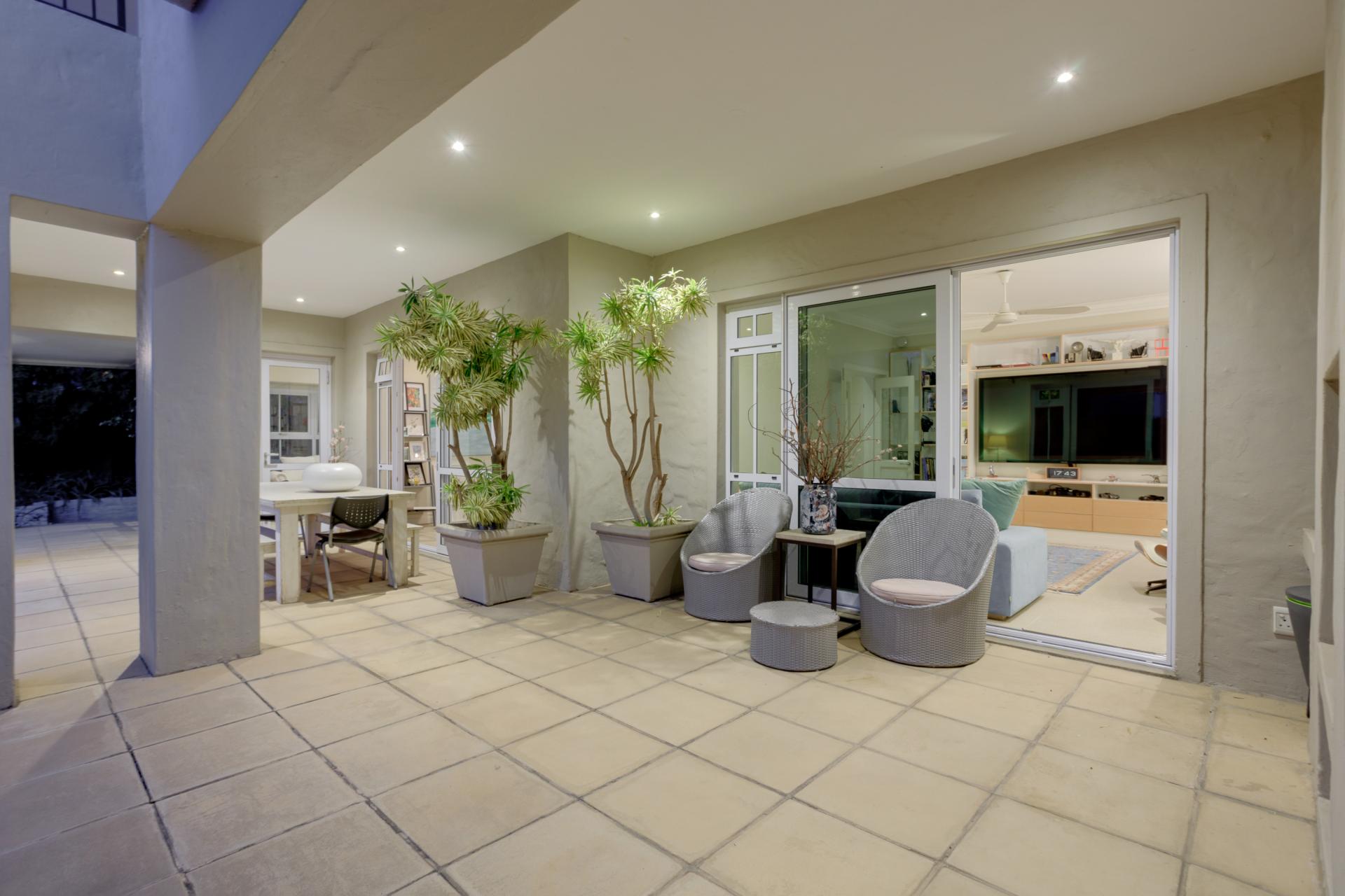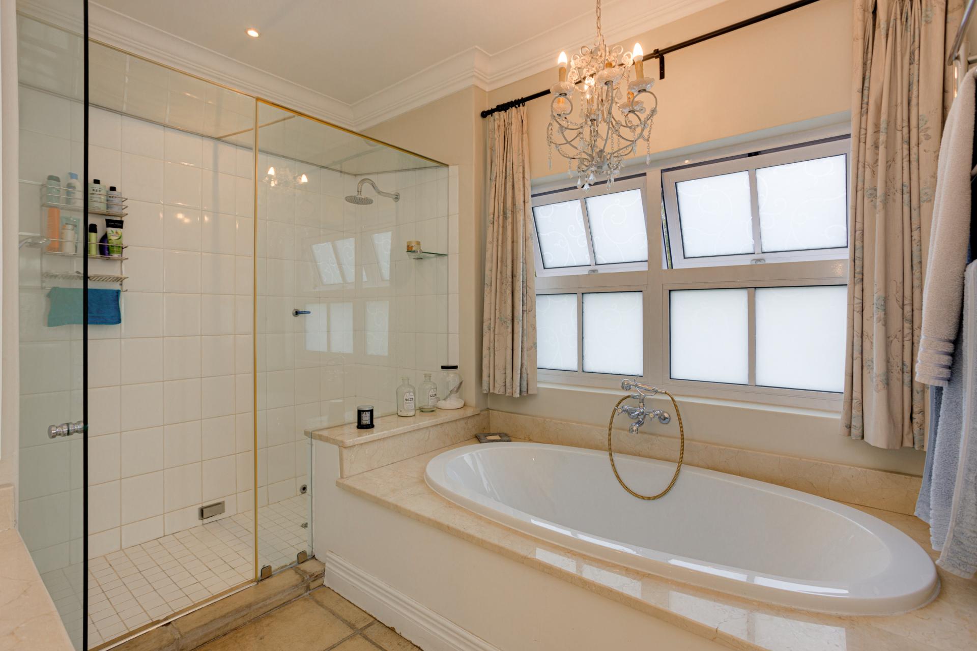 The main living areas are thoughtfully arranged, comprising a comfortable TV lounge with a gas fireplace, a formal dining room and a spacious open-plan lounge that also features a gas fireplace and connects effortlessly to the outdoors. All receptions are north-facing and open seamlessly onto a large, covered patio that’s perfect for entertaining, spilling out onto an expansive garden and a glistening swimming pool. The gourmet kitchen is elegantly finished with marble countertops and features a separate scullery, making it both functional and stylish for everyday living and hosting. Tucked away downstairs, a beautifully appointed study that overlooks a charming rose garden offers the ideal space for a quiet home office or library, or can alternatively serve as a private guest suite with its own en suite bathroom.