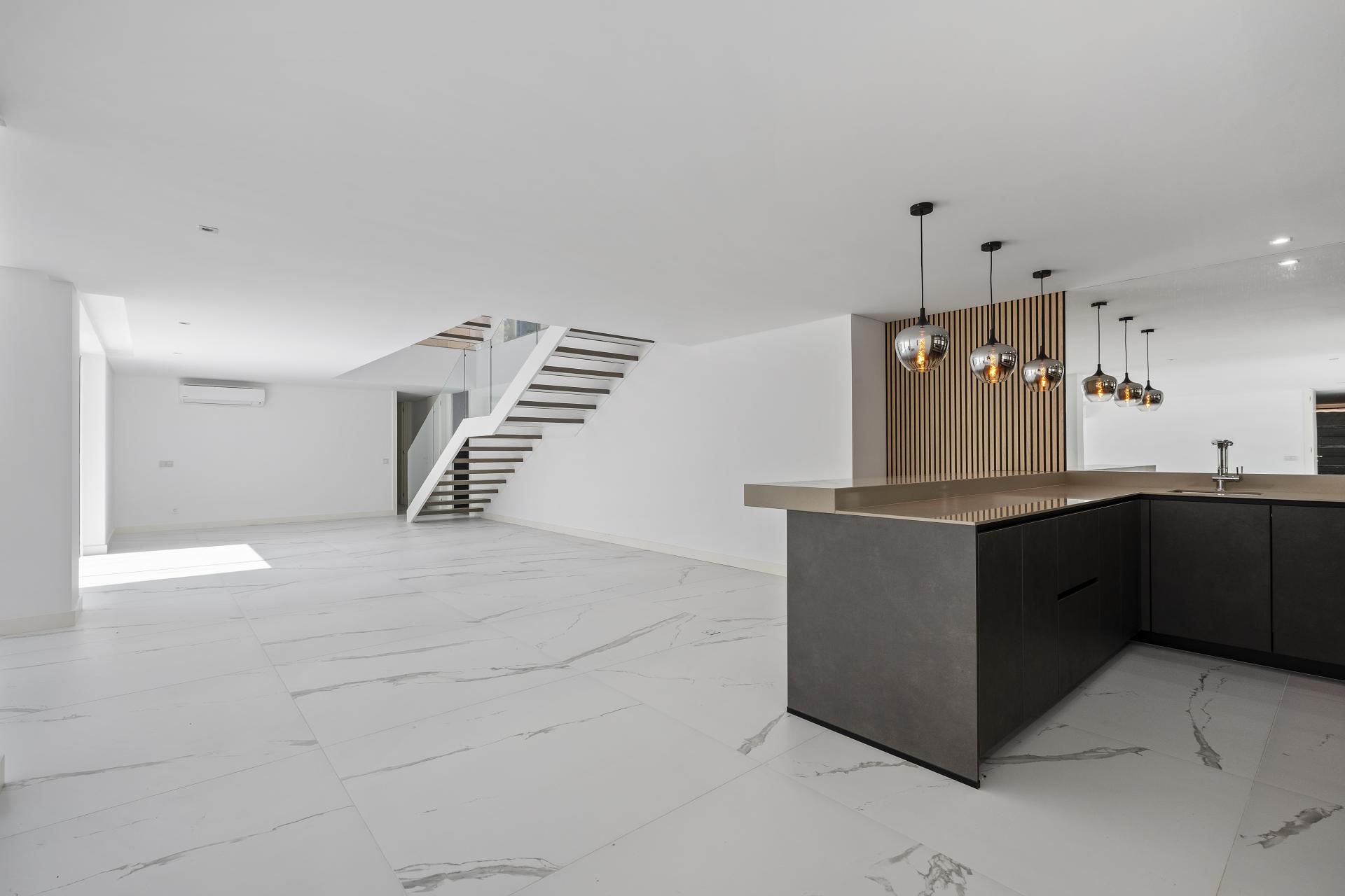 The interior layout is both functional and luxurious. A striking double-height entrance welcomes you into the open-plan living space with sleek marble ceramic flooring and floor-to-ceiling glass walls. The designer kitchen is fully fitted with high-spec appliances and opens to a BBQ terrace. The ground floor also includes two spacious en-suite bedrooms, ideal for guests or multigenerational living.