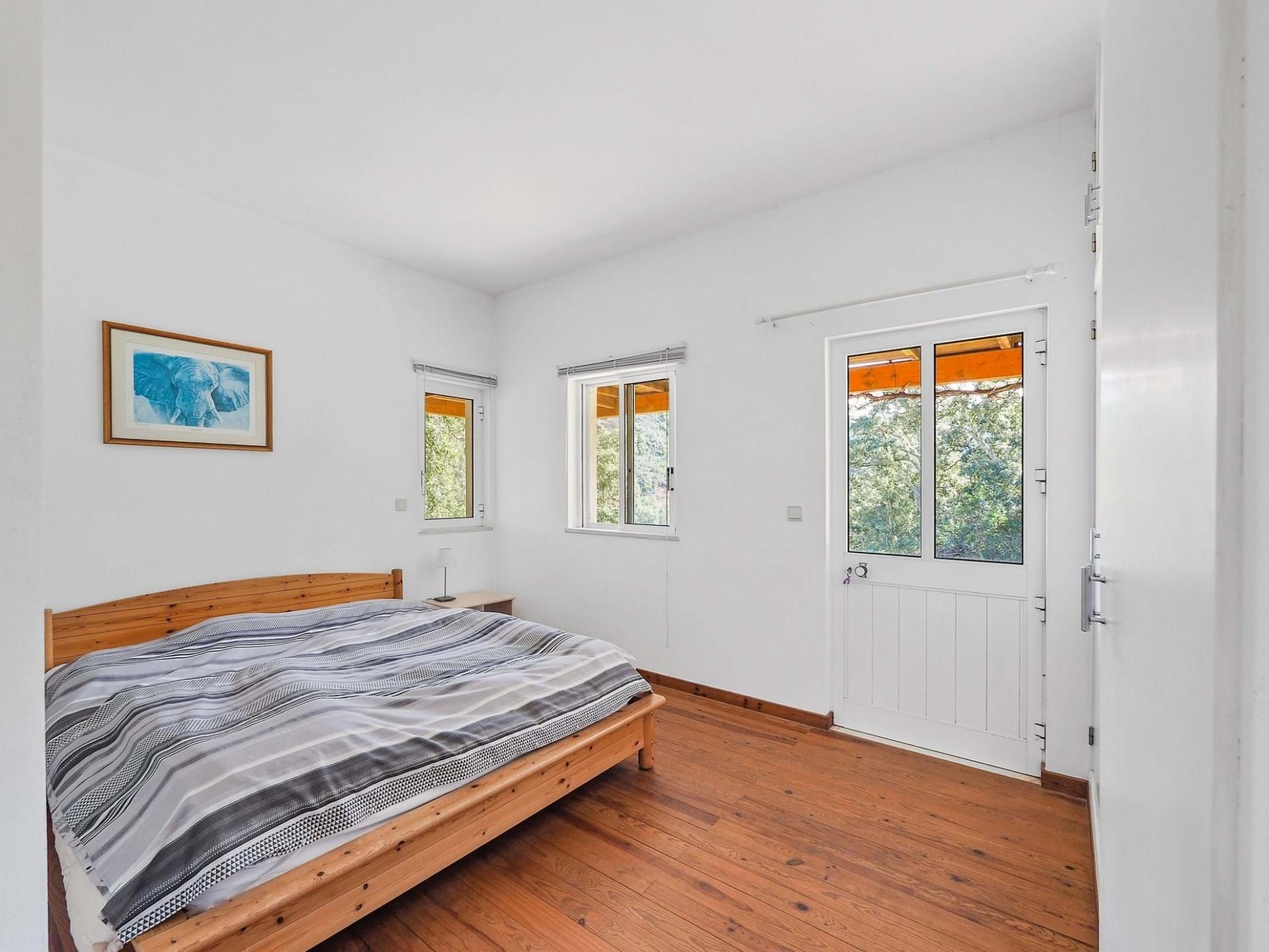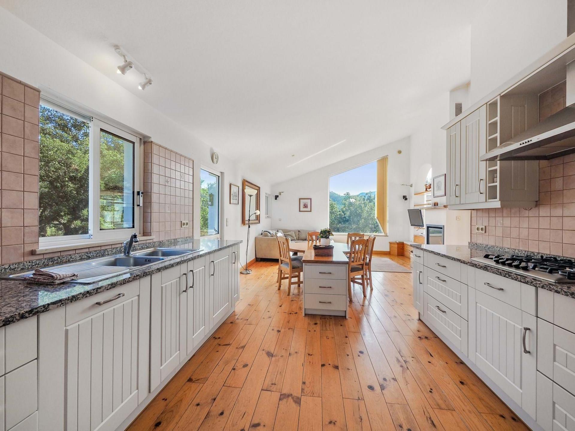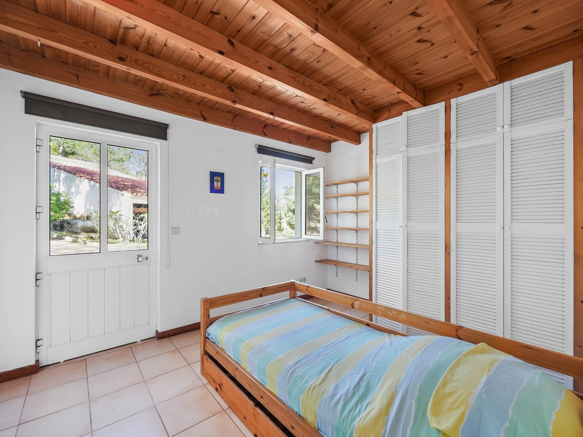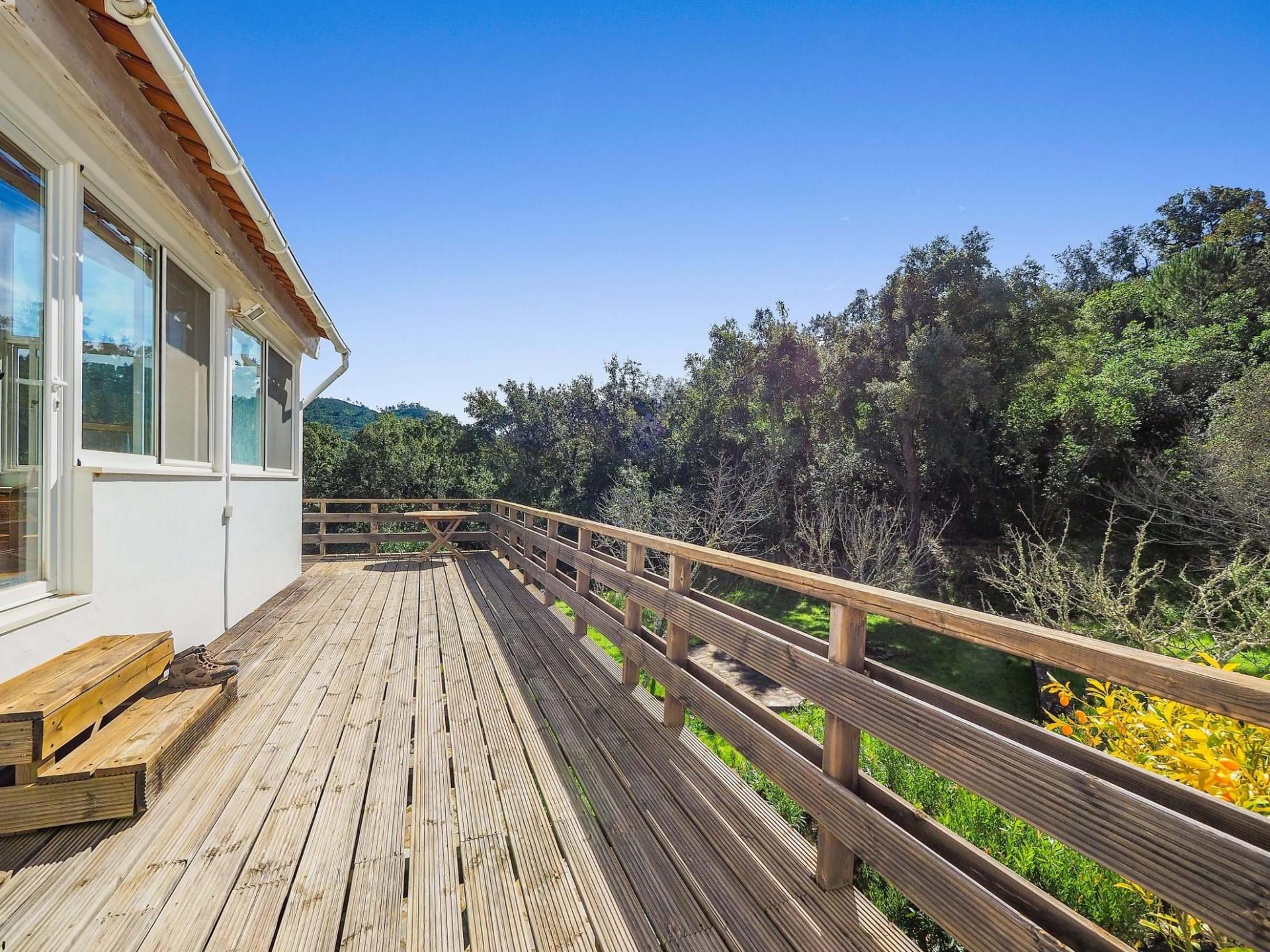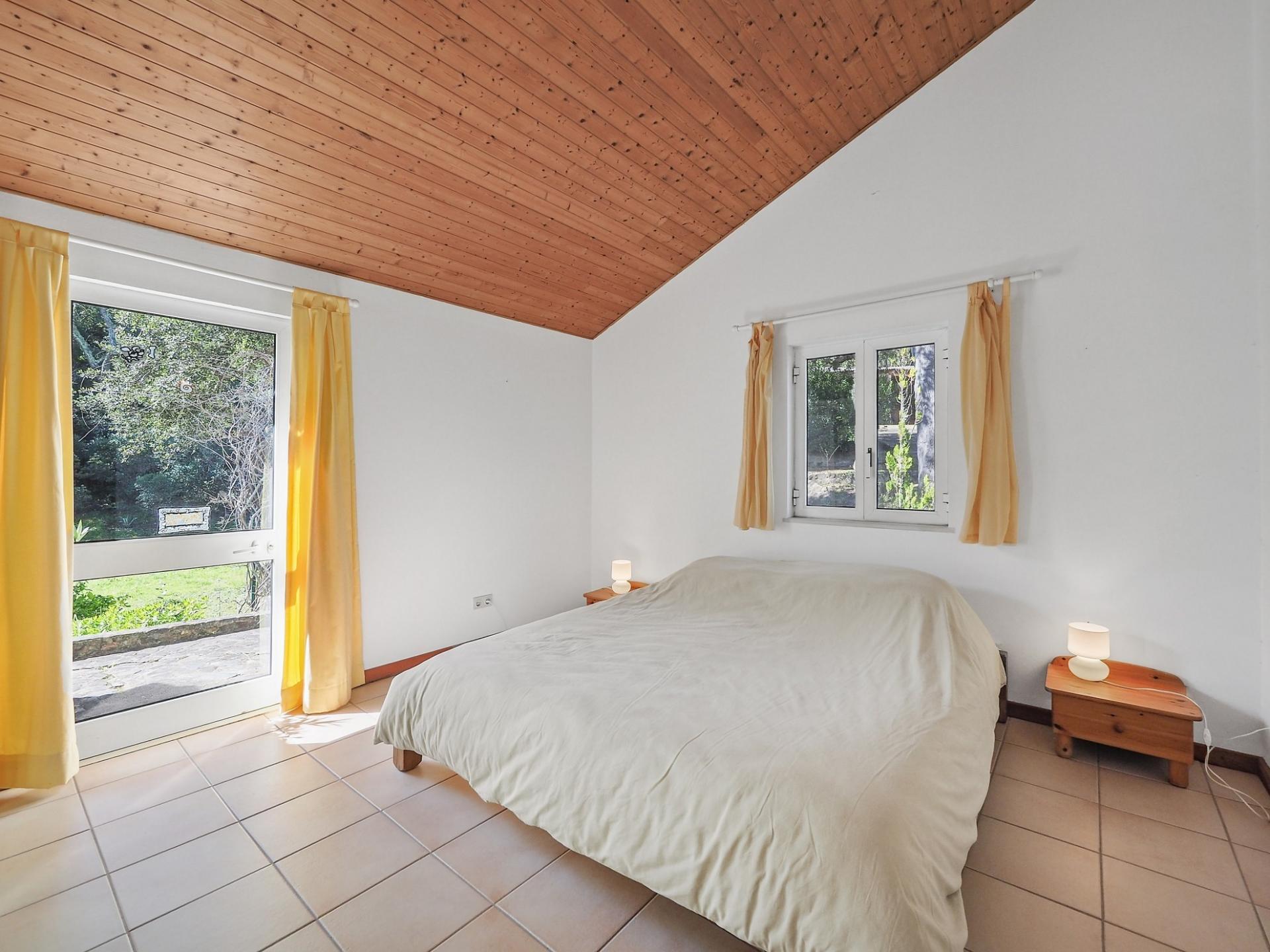 The exterior boasts a garage and carport with two workshops, wood storage, and a flat lawn surrounded by a picturesque cork oak forest, fruit trees, and vibrant gardens. Additionally, the property includes a ruin on a separate plot, which offers excellent potential for future development.