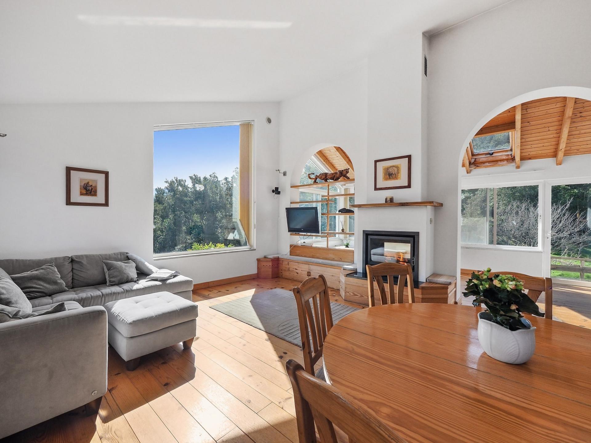 Das großzügige Grundstück verfügt über einen kleinen Bach am unteren Grundstücksrand sowie einen Wasserbrunnen. Das Haus wurde ursprünglich als zwei separate Wohneinheiten konzipiert und erstreckt sich über zwei Ebenen. Der Haupteingang führt in einen großzügigen offenen Wohn-, Ess- und Küchenbereich mit Holzfußboden, zweiseitigem Kamin und Panoramafenstern mit Bergblick. Im unteren Teil des ersten Gebäudes befinden sich zwei Schlafzimmer und ein Badezimmer, jeweils mit Zugang zu umliegenden Terrassen und Holzdecks. Ein Wasch- und Heizungsraum befindet sich ebenfalls auf dieser Ebene.