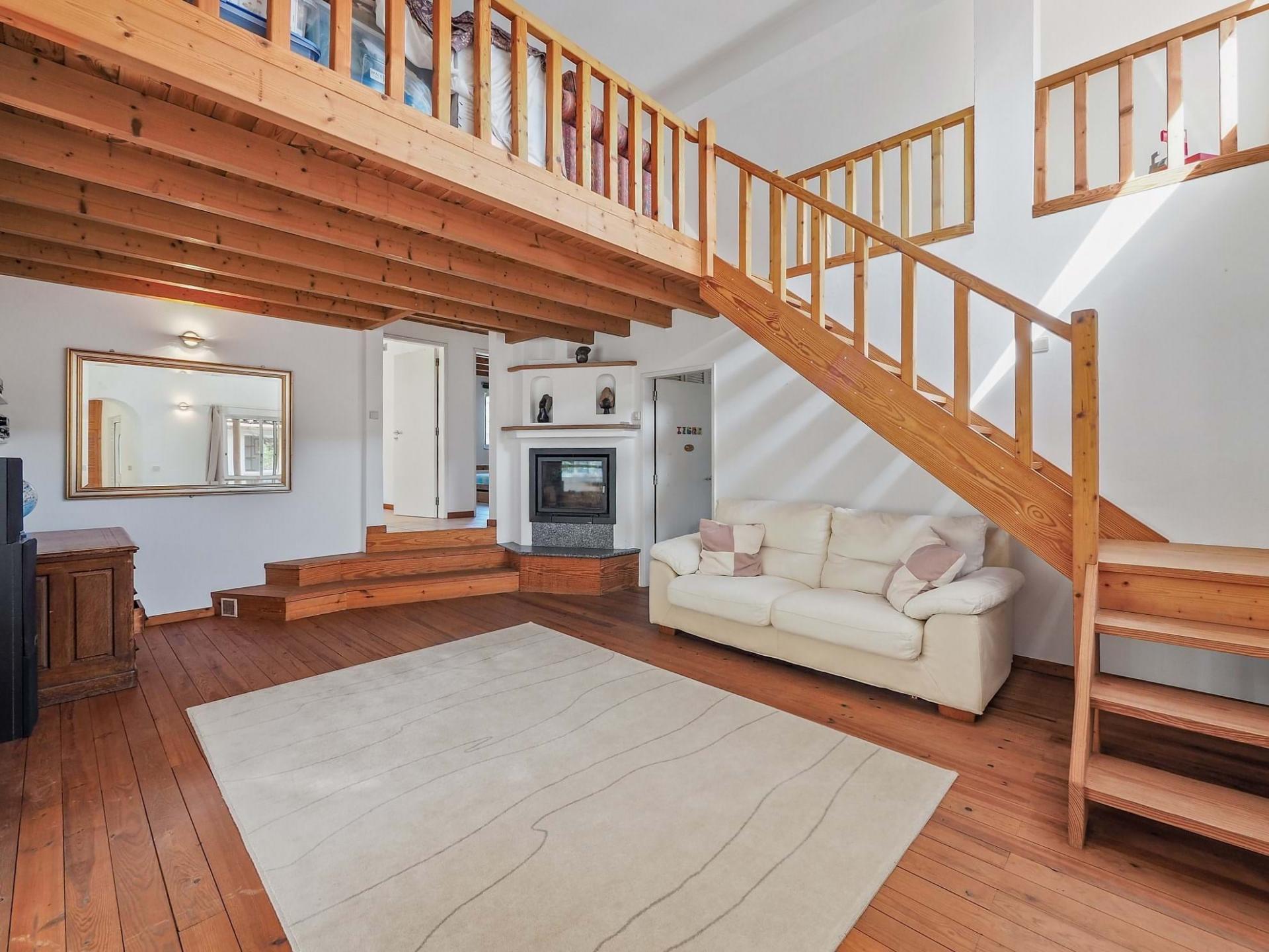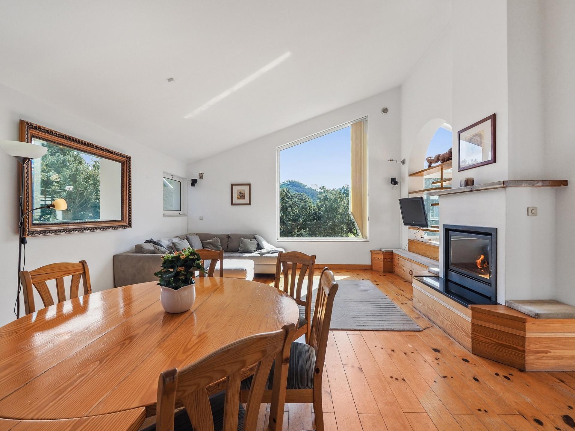 Originally designed as two separate houses, the villa is thoughtfully built over two levels. The main entrance opens to a spacious, open-plan kitchen, living, and dining area with elegant wooden flooring, a double-sided fireplace, and panoramic windows framing captivating mountain views.