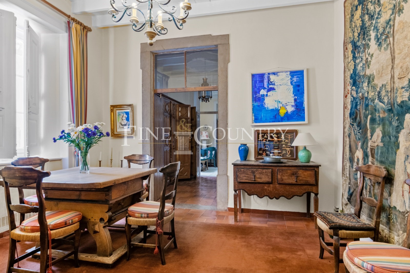 Par un joli passage extérieur, vous accéderez à la maison principale, qui comprend un beau hall d'entrée, une cuisine entièrement équipée, trois salons avec cheminée chacun, des salles à manger, un bureau ainsi qu'une belle bibliothèque. Il y a six chambres qui offrent des salles de bains attenantes avec des designs uniques.
