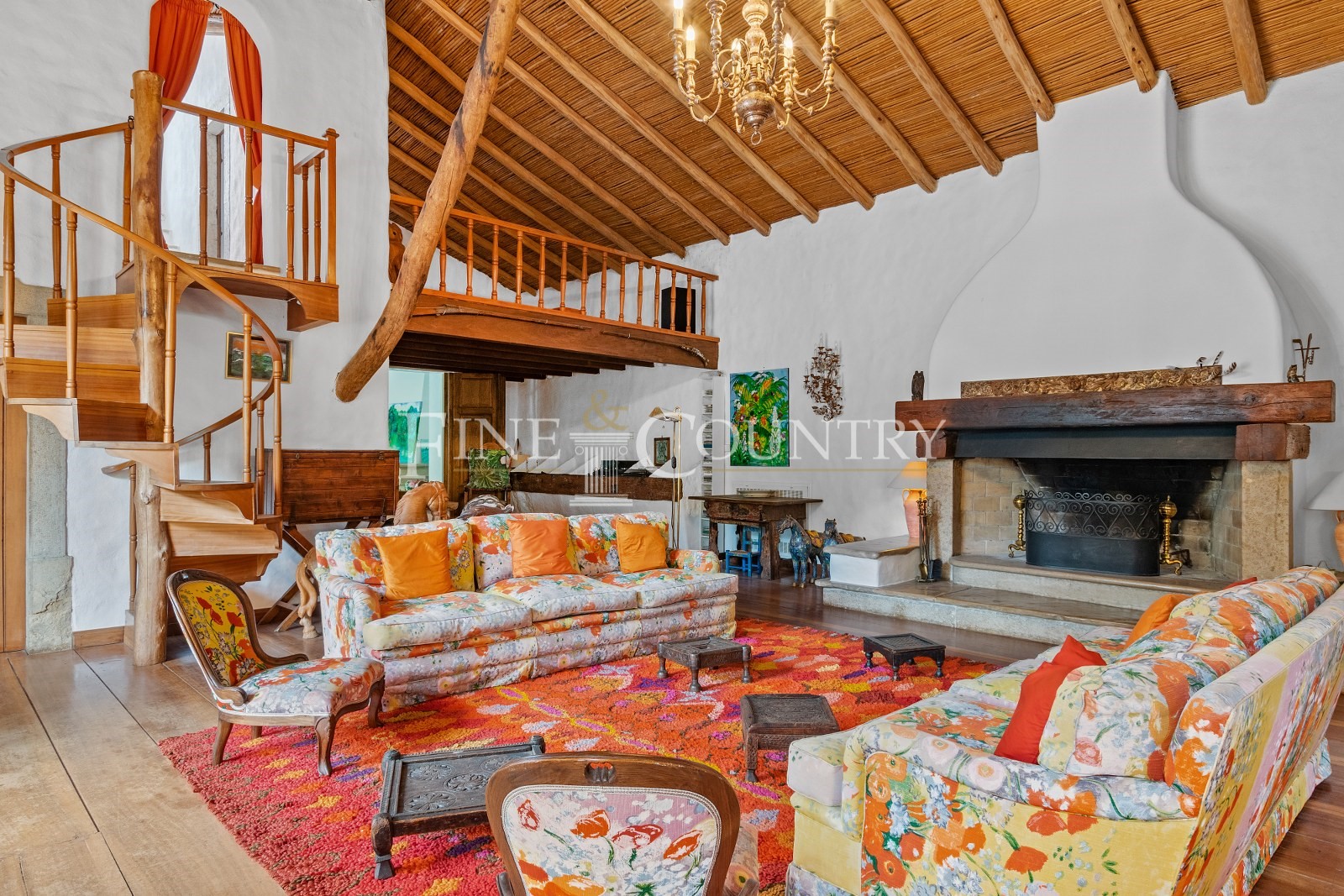 Através de uma bela passagem exterior, chega-se à casa principal, que é composta por um hall de entrada, uma cozinha totalmente equipada, três salas de estar com uma lareira cada, salas de jantar, um escritório e uma espaçosa biblioteca. Existem ainda seis quartos que oferecem casas de banho privativas com designs únicos.
