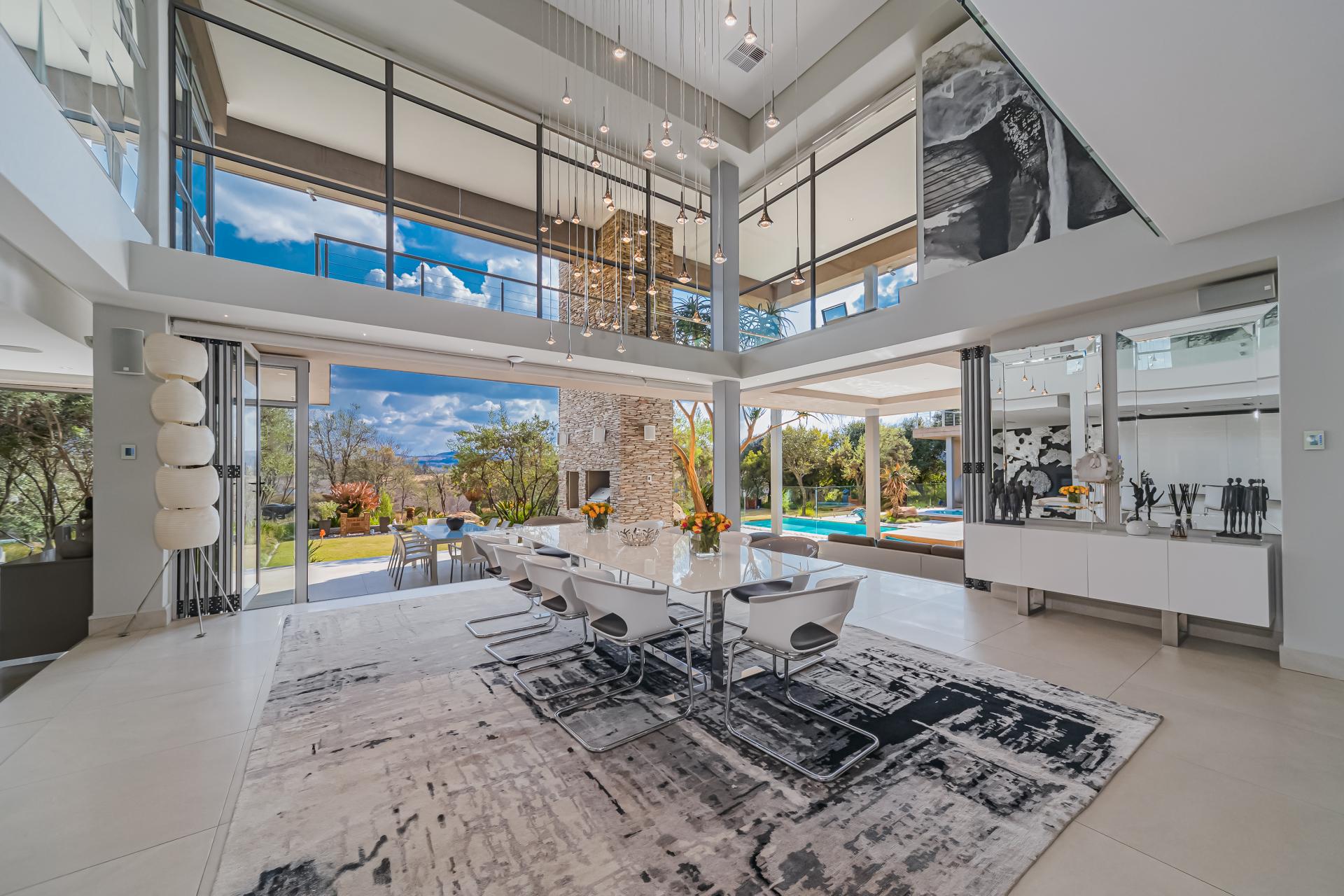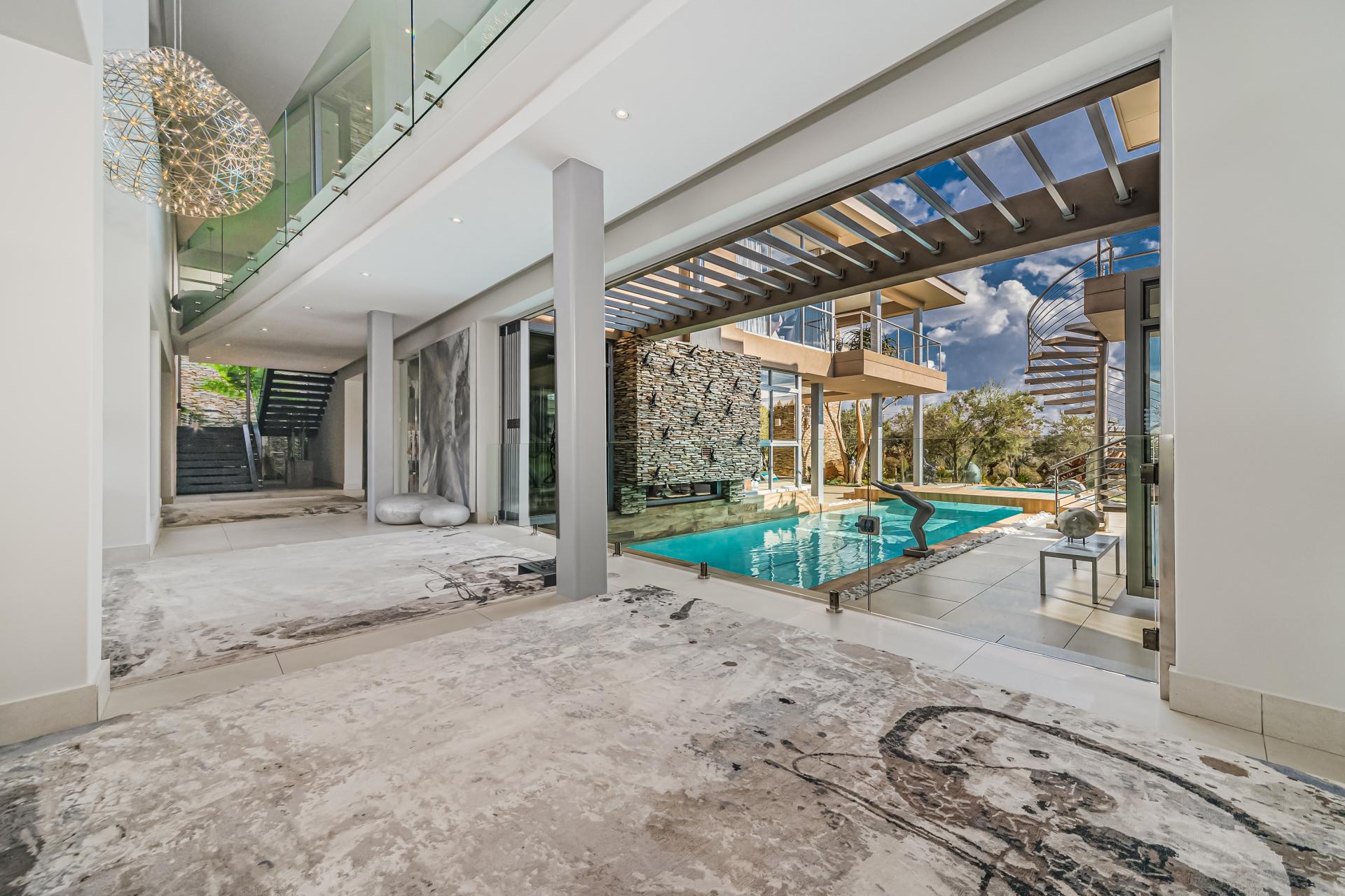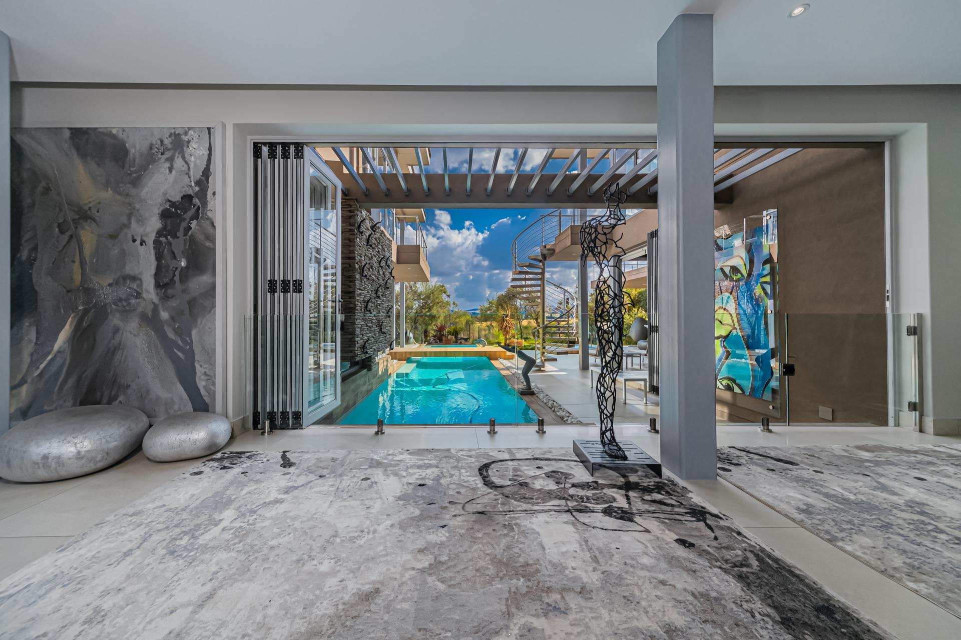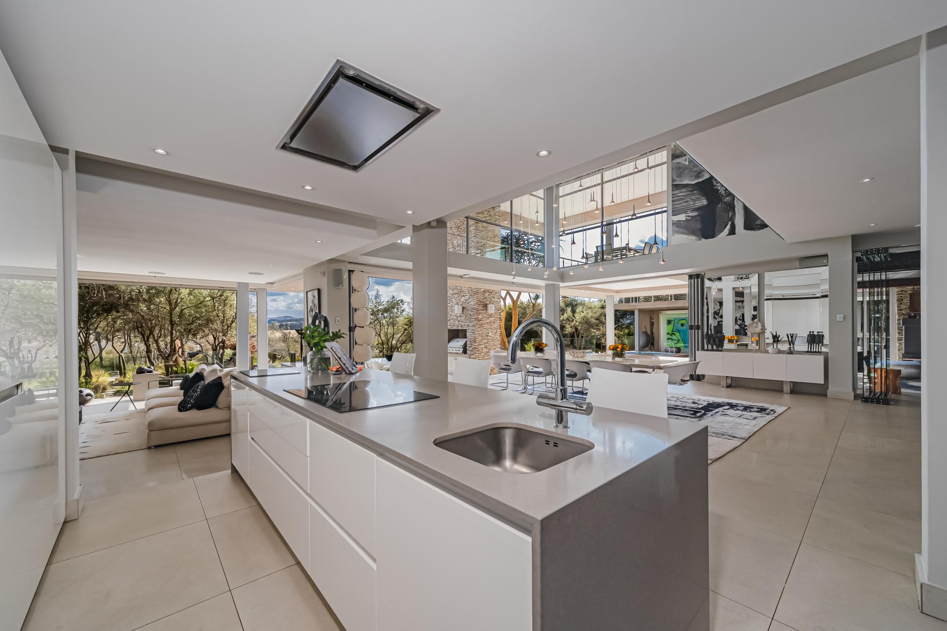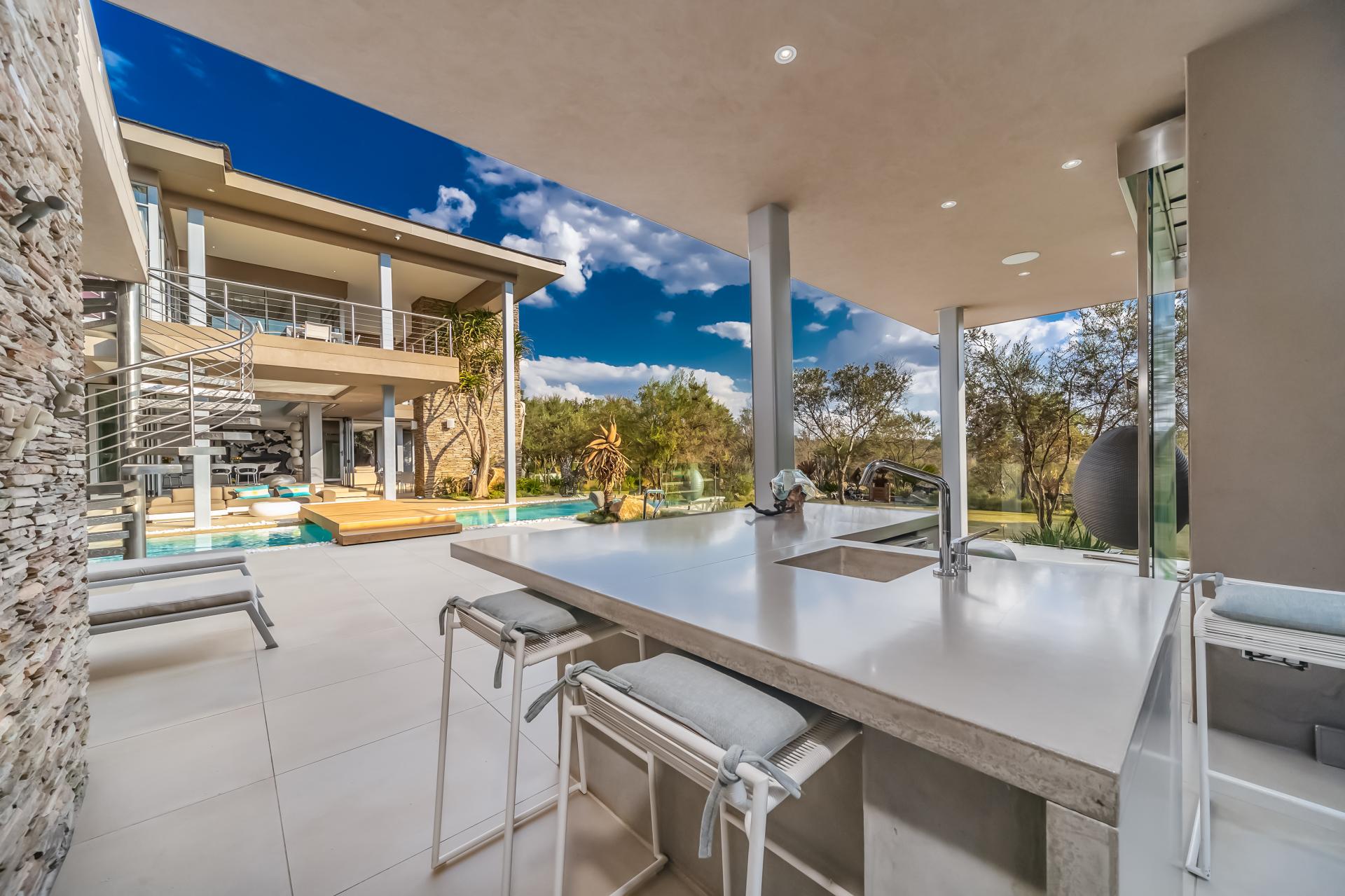 This 1600+sqm home looks onto the championship golf course in Blair Atholl with the Crocodile River across the course and sunsets one goes on holiday to chase. The home is ideal for a big family with 6 bedrooms all en-suite complemented with a massive office space with outdoor meditation area, jacuzzi, pizza oven, multiple entertainment spots, two braai areas, heated swimming pool, designer garden, vegetable garden and two bars – one outside and another stunning feature bar inside. There is also an enclosed Ferrari lounge, a wine room, show kitchen and catering kitchen with Gaggenau appliances, walk in fridge and laundry/scullery. The catering kitchen is a piece of art in itself with the beautiful views, décor and space it offers. At the end of the property is a firepit where views onto the golf course can be enjoyed.
