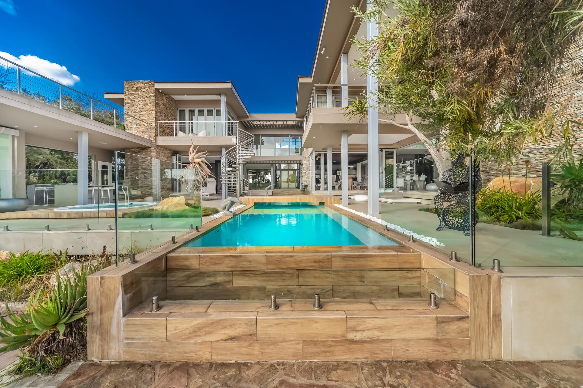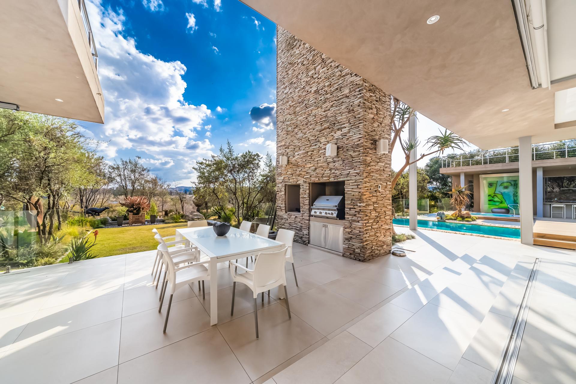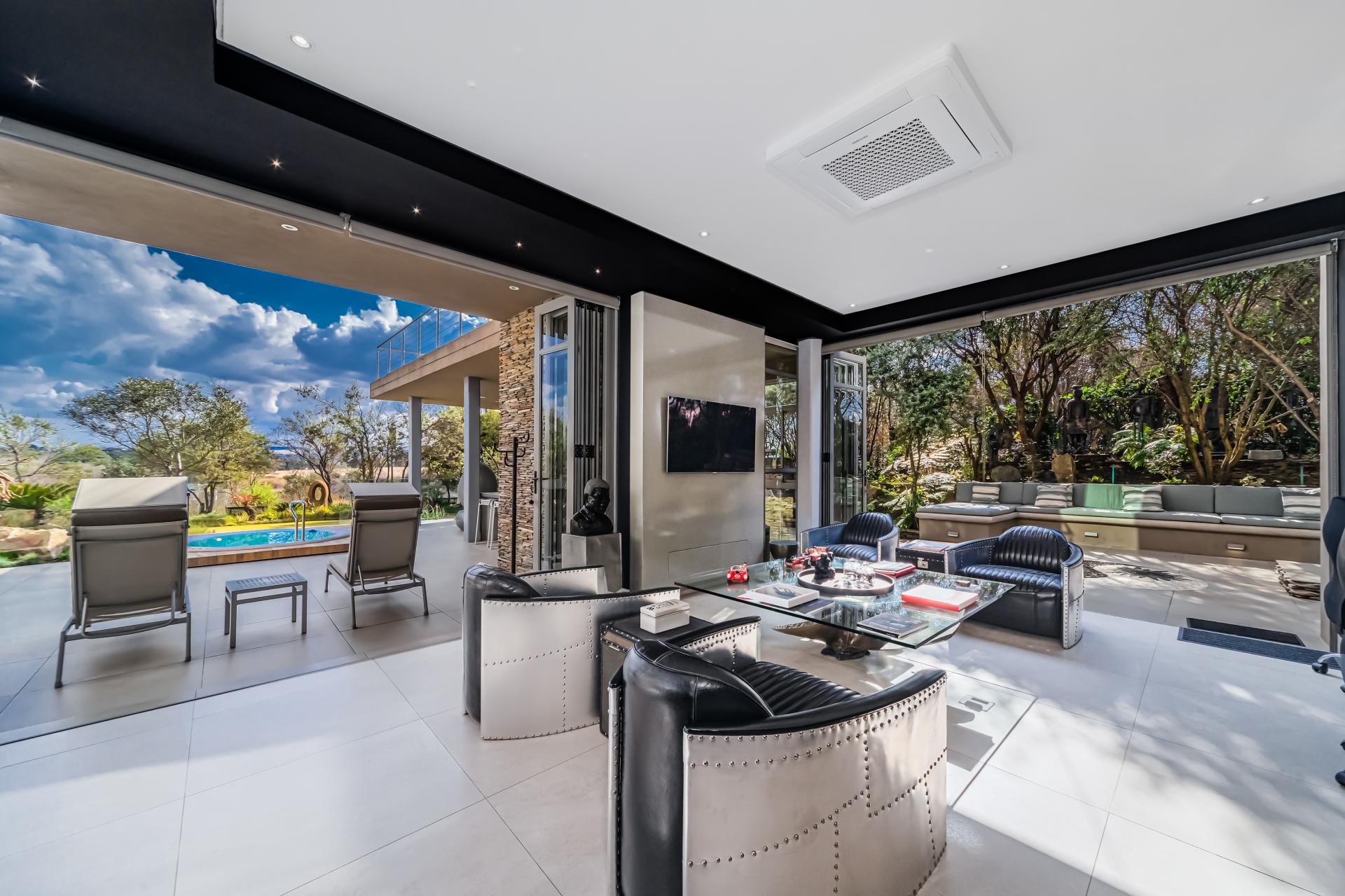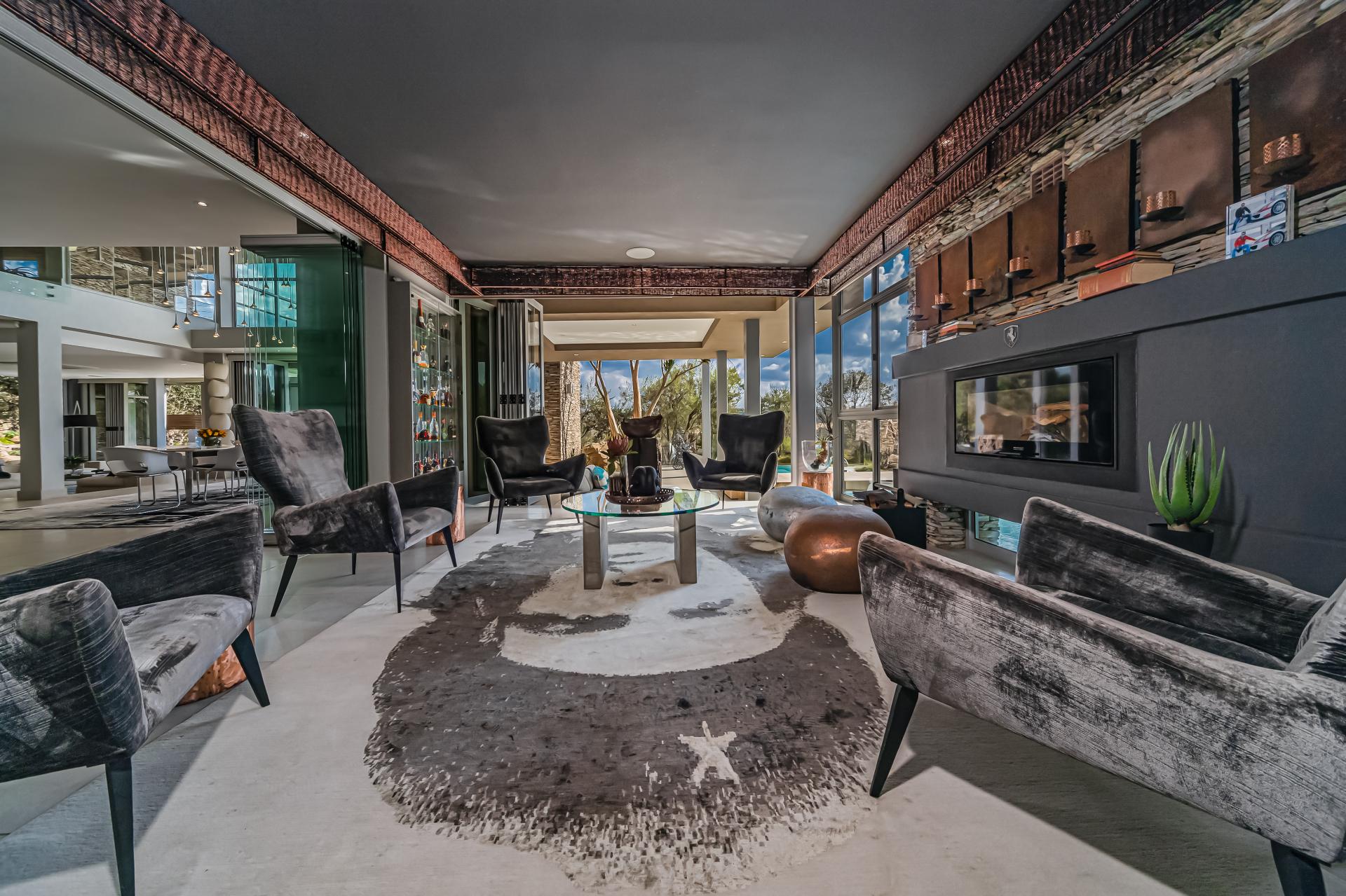 This 1600+sqm home looks onto the championship golf course in Blair Atholl with the Crocodile River across the course and sunsets one goes on holiday to chase. The home is ideal for a big family with 6 bedrooms all en-suite complemented with a massive office space with outdoor meditation area, jacuzzi, pizza oven, multiple entertainment spots, two braai areas, heated swimming pool, designer garden, vegetable garden and two bars – one outside and another stunning feature bar inside. There is also an enclosed Ferrari lounge, a wine room, show kitchen and catering kitchen with Gaggenau appliances, walk in fridge and laundry/scullery. The catering kitchen is a piece of art in itself with the beautiful views, décor and space it offers. At the end of the property is a firepit where views onto the golf course can be enjoyed.