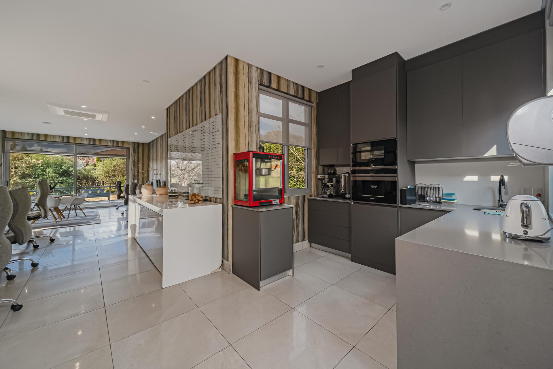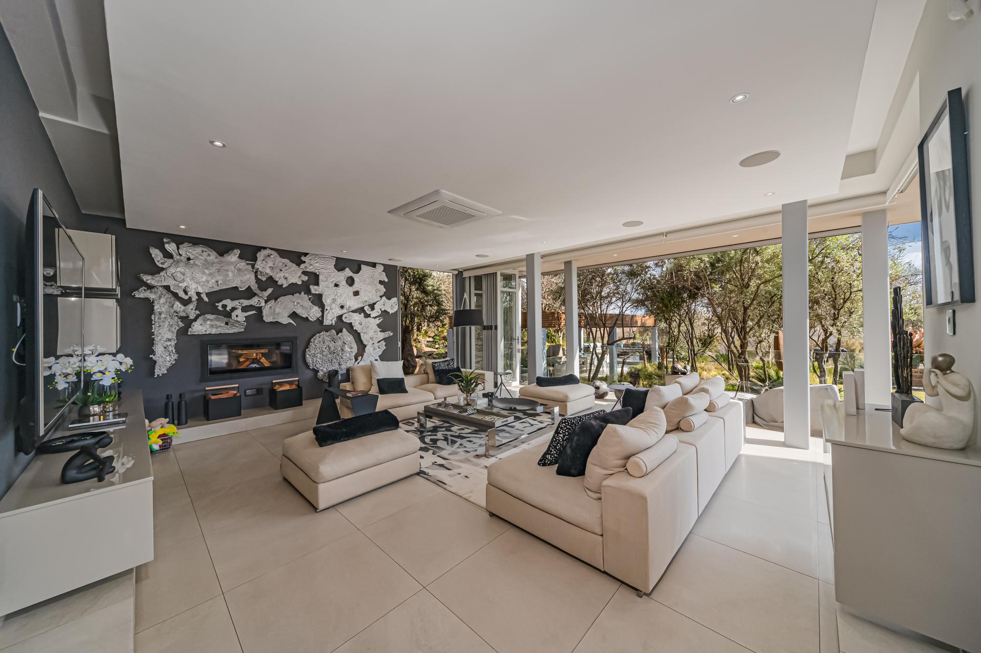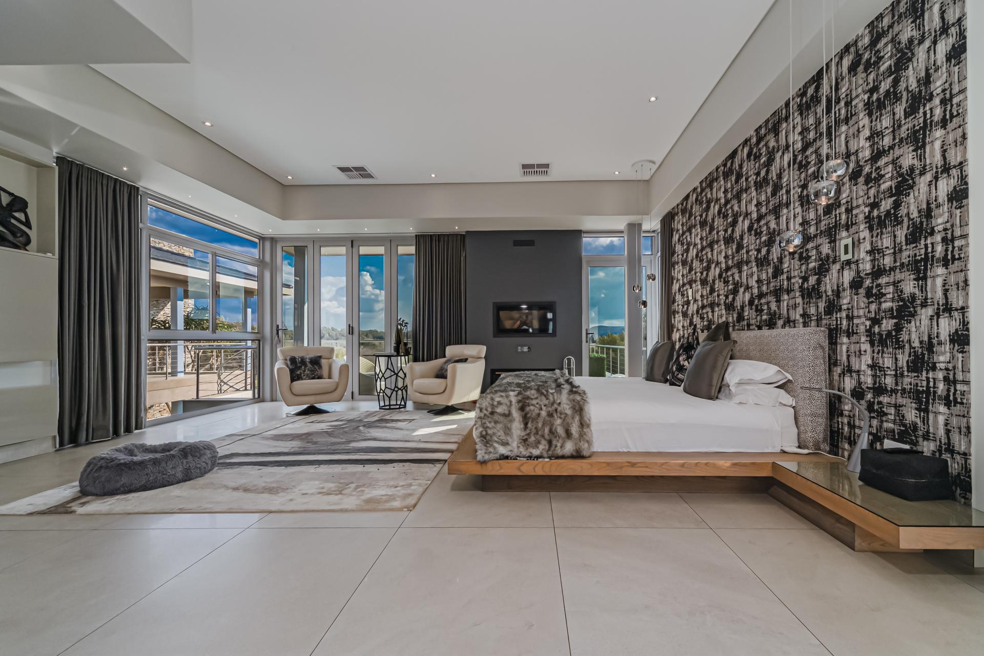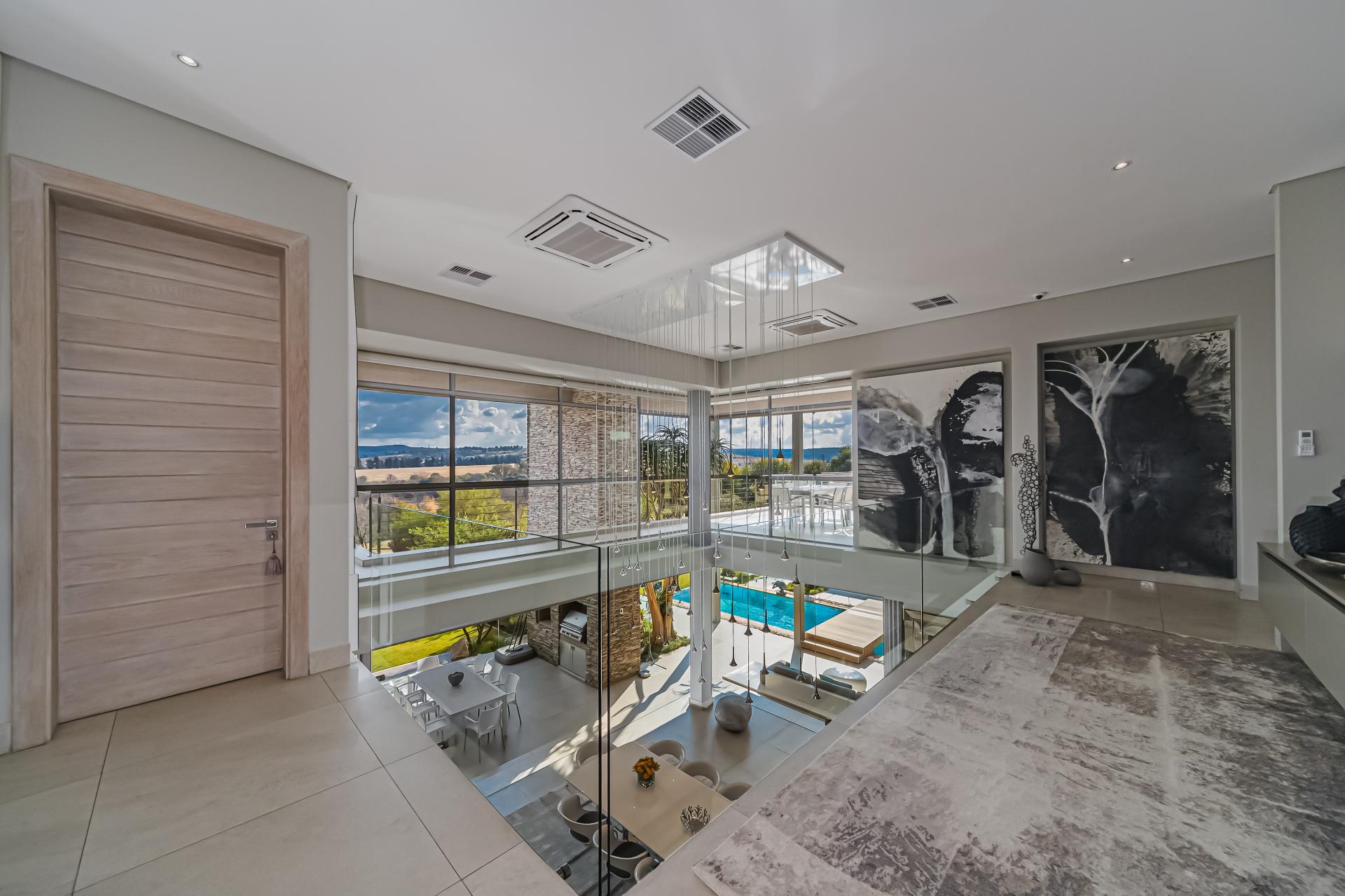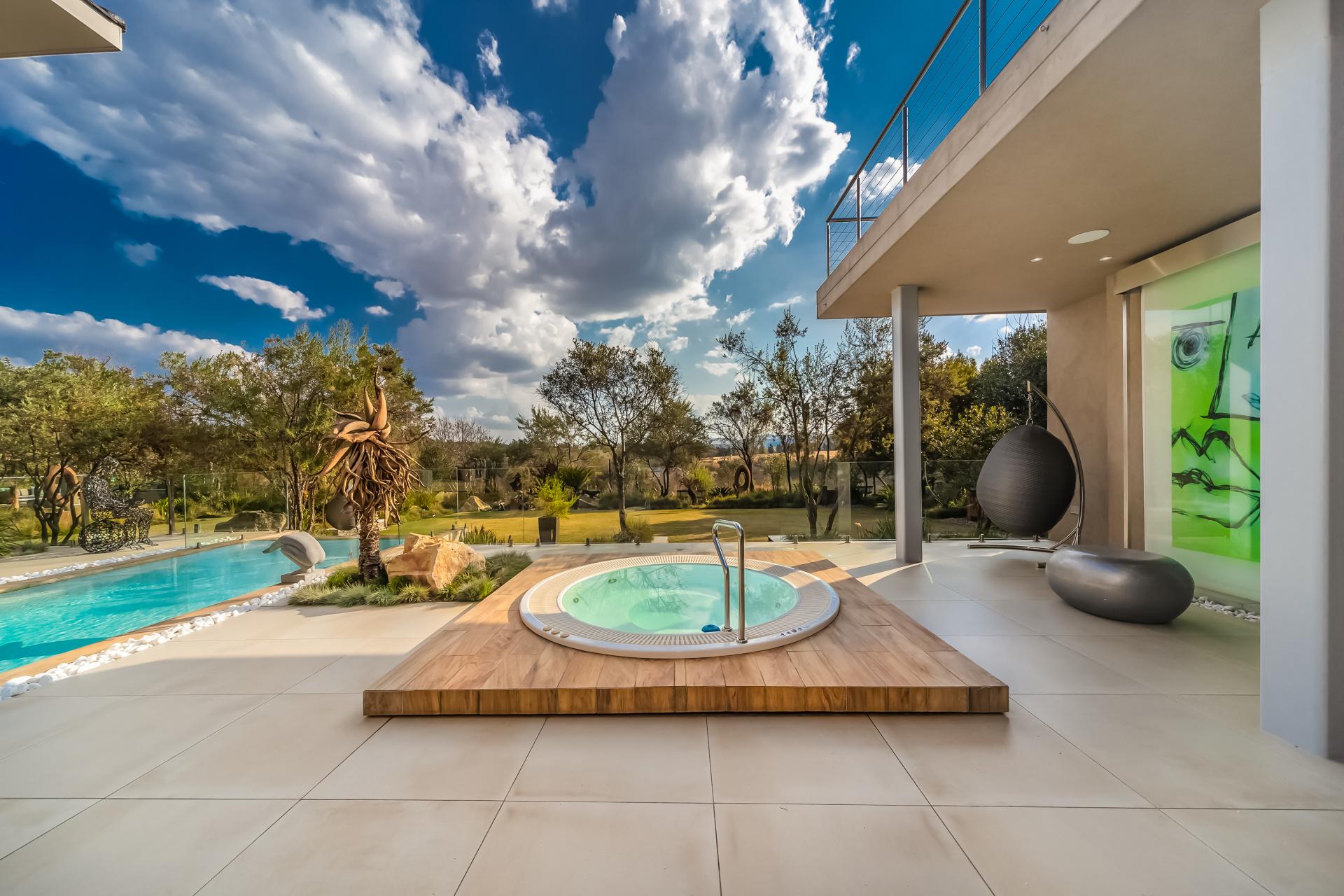 This 1600+sqm home looks onto the championship golf course in Blair Atholl with the Crocodile River across the course and sunsets one goes on holiday to chase. The home is ideal for a big family with 6 bedrooms all en-suite complemented with a massive office space with outdoor meditation area, jacuzzi, pizza oven, multiple entertainment spots, two braai areas, heated swimming pool, designer garden, vegetable garden and two bars – one outside and another stunning feature bar inside. There is also an enclosed Ferrari lounge, a wine room, show kitchen and catering kitchen with Gaggenau appliances, walk in fridge and laundry/scullery. The catering kitchen is a piece of art in itself with the beautiful views, décor and space it offers. At the end of the property is a firepit where views onto the golf course can be enjoyed.