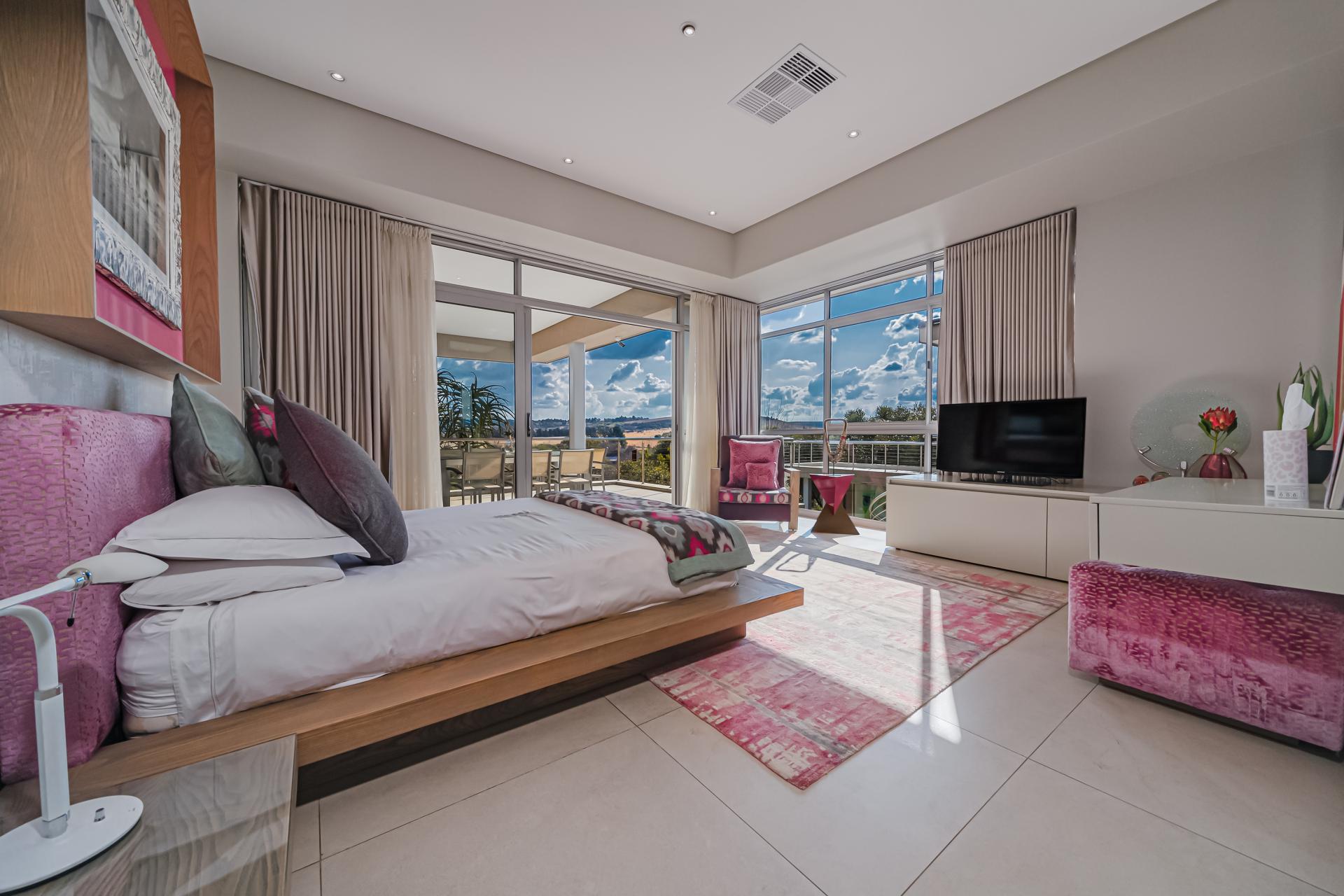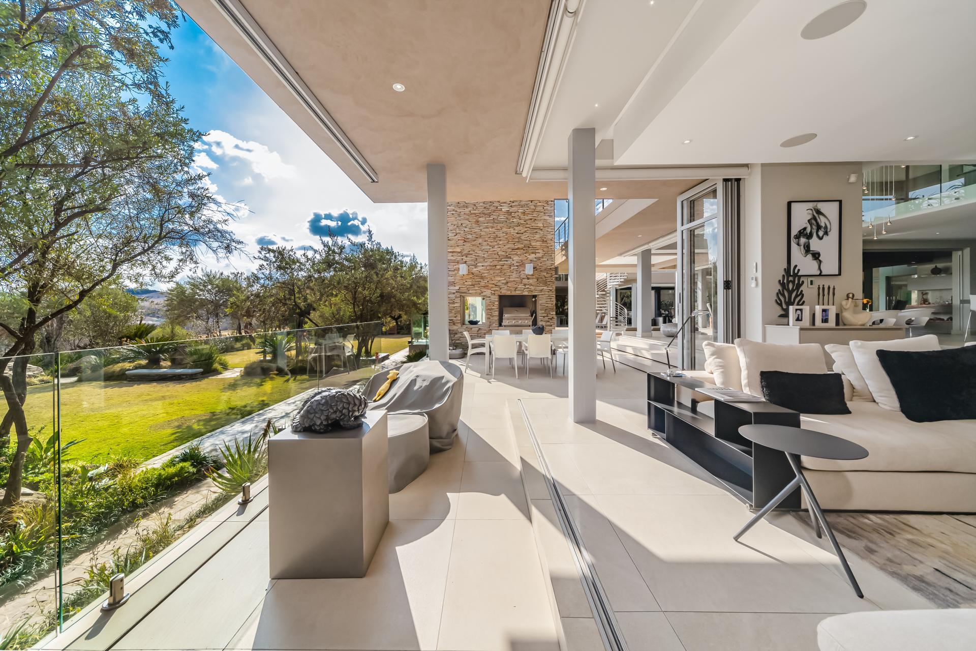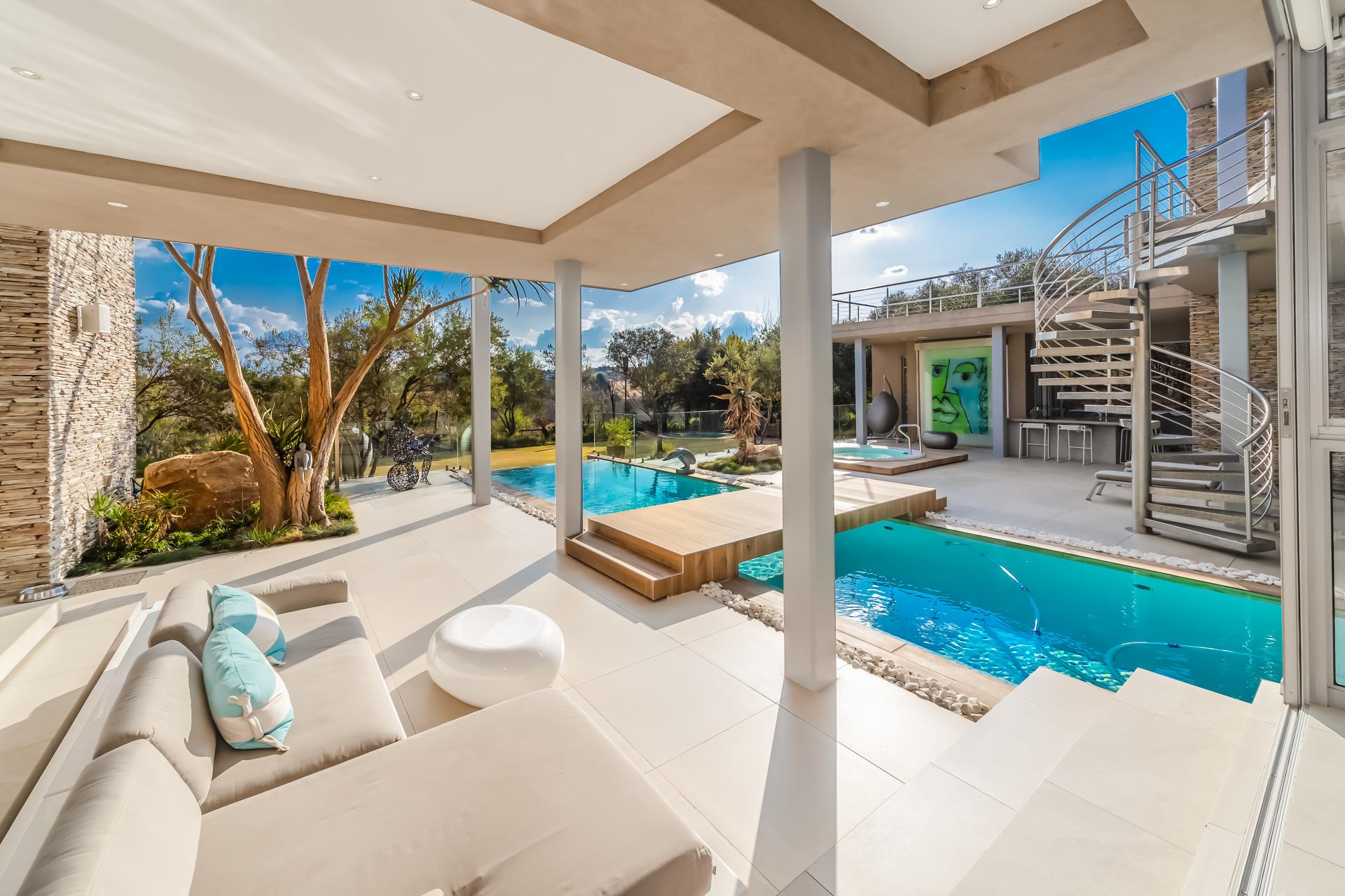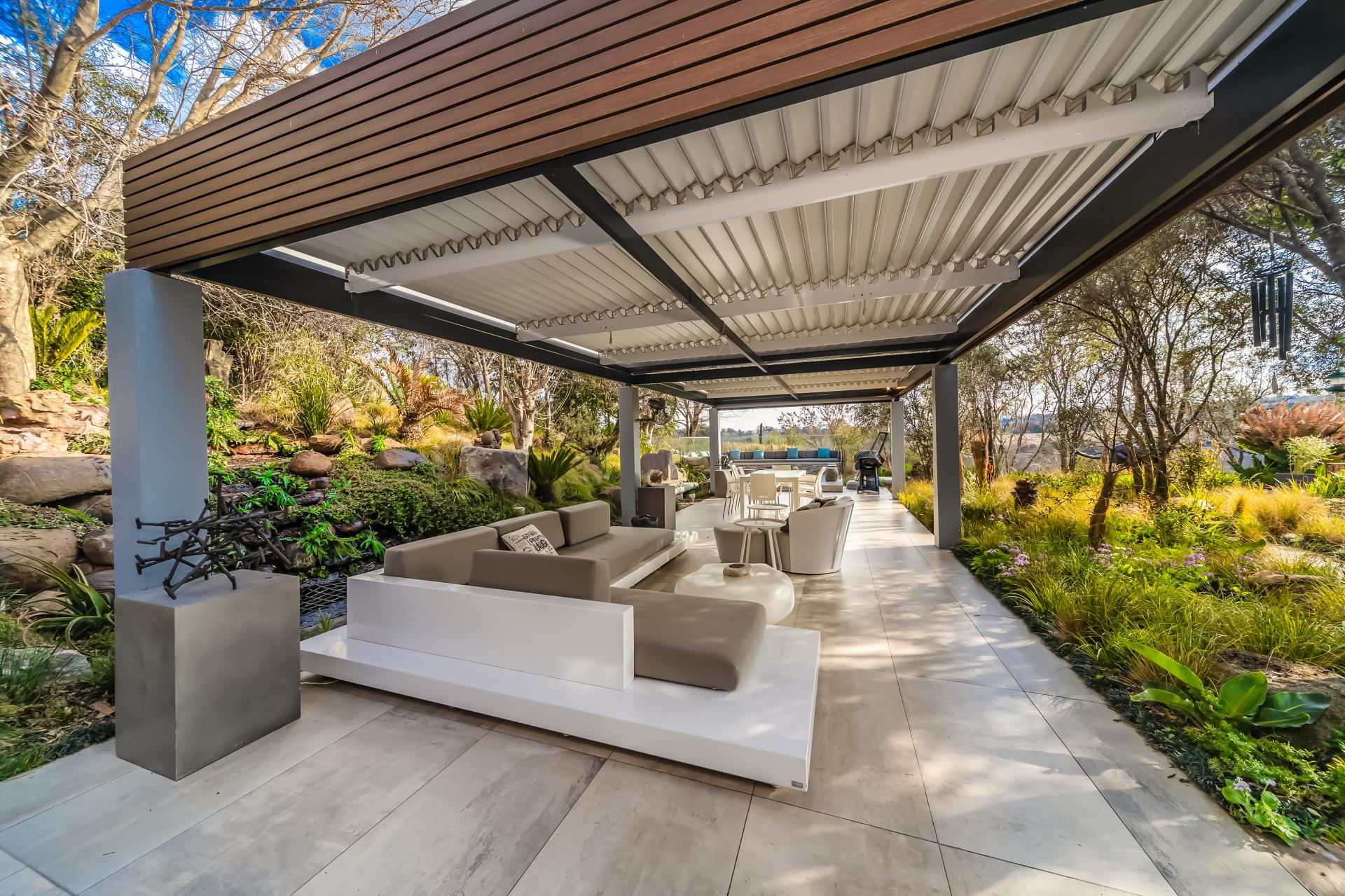 This 1600+sqm home looks onto the championship golf course in Blair Atholl with the Crocodile River across the course and sunsets one goes on holiday to chase. The home is ideal for a big family with 6 bedrooms all en-suite complemented with a massive office space with outdoor meditation area, jacuzzi, pizza oven, multiple entertainment spots, two braai areas, heated swimming pool, designer garden, vegetable garden and two bars – one outside and another stunning feature bar inside. There is also an enclosed Ferrari lounge, a wine room, show kitchen and catering kitchen with Gaggenau appliances, walk in fridge and laundry/scullery. The catering kitchen is a piece of art in itself with the beautiful views, décor and space it offers. At the end of the property is a firepit where views onto the golf course can be enjoyed.