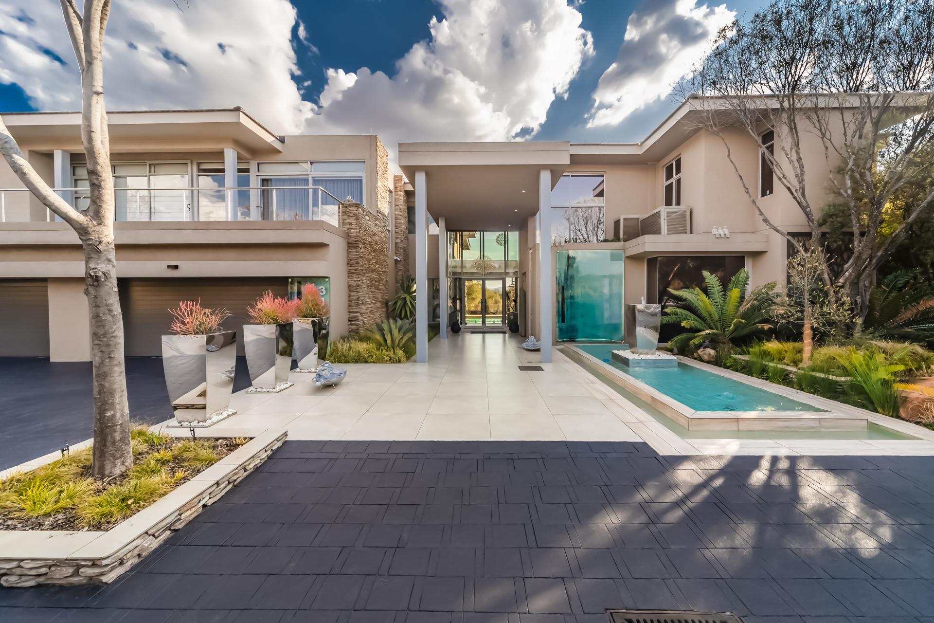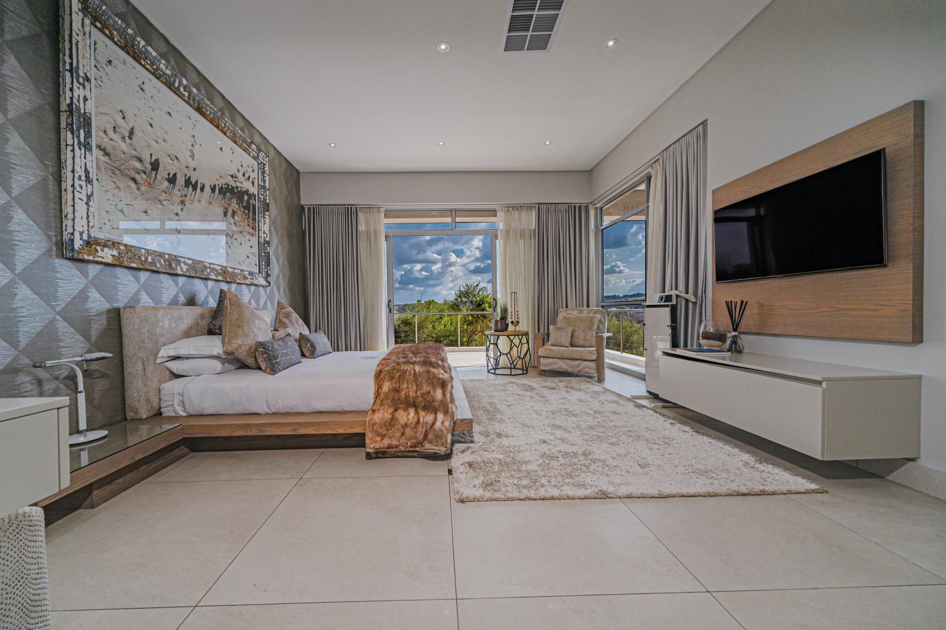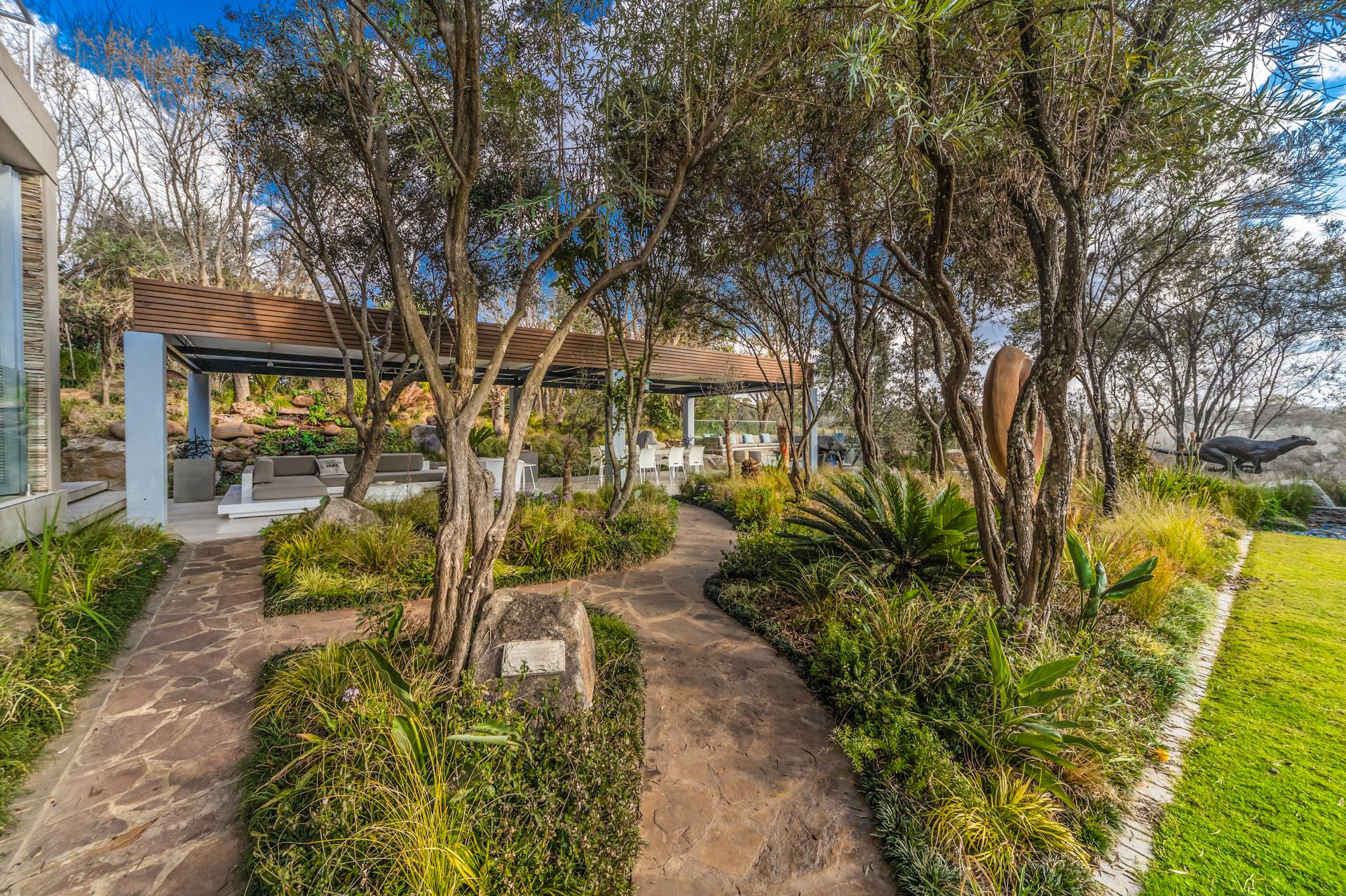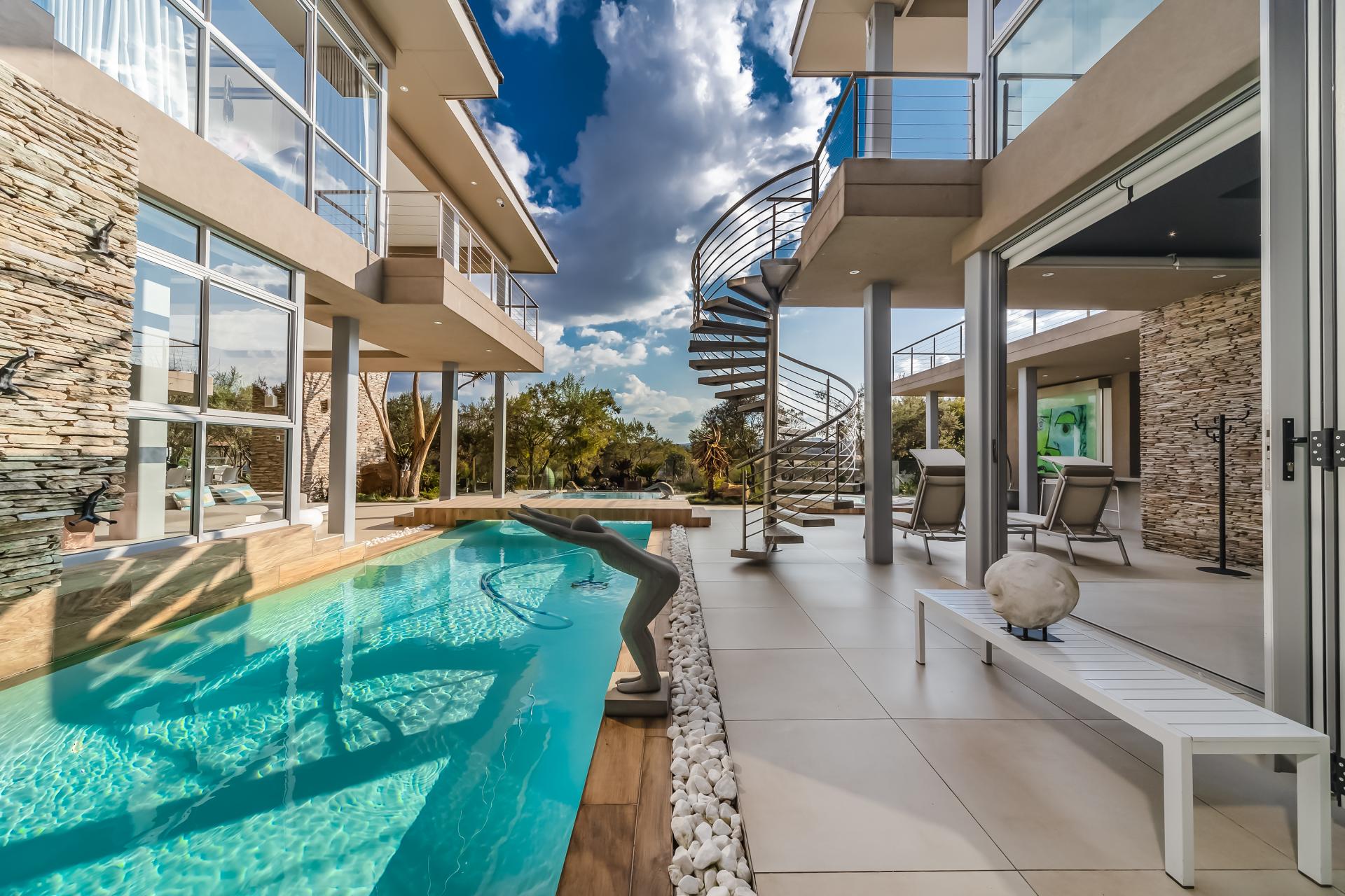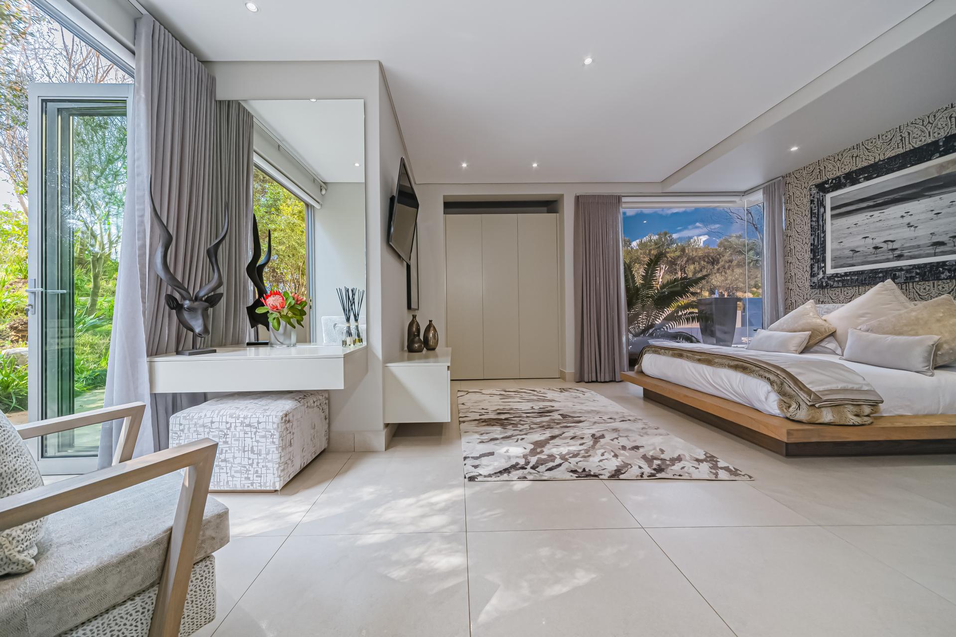 This 1600+sqm home looks onto the championship golf course in Blair Atholl with the Crocodile River across the course and sunsets one goes on holiday to chase. The home is ideal for a big family with 6 bedrooms all en-suite complemented with a massive office space with outdoor meditation area, jacuzzi, pizza oven, multiple entertainment spots, two braai areas, heated swimming pool, designer garden, vegetable garden and two bars – one outside and another stunning feature bar inside. There is also an enclosed Ferrari lounge, a wine room, show kitchen and catering kitchen with Gaggenau appliances, walk in fridge and laundry/scullery. The catering kitchen is a piece of art in itself with the beautiful views, décor and space it offers. At the end of the property is a firepit where views onto the golf course can be enjoyed.