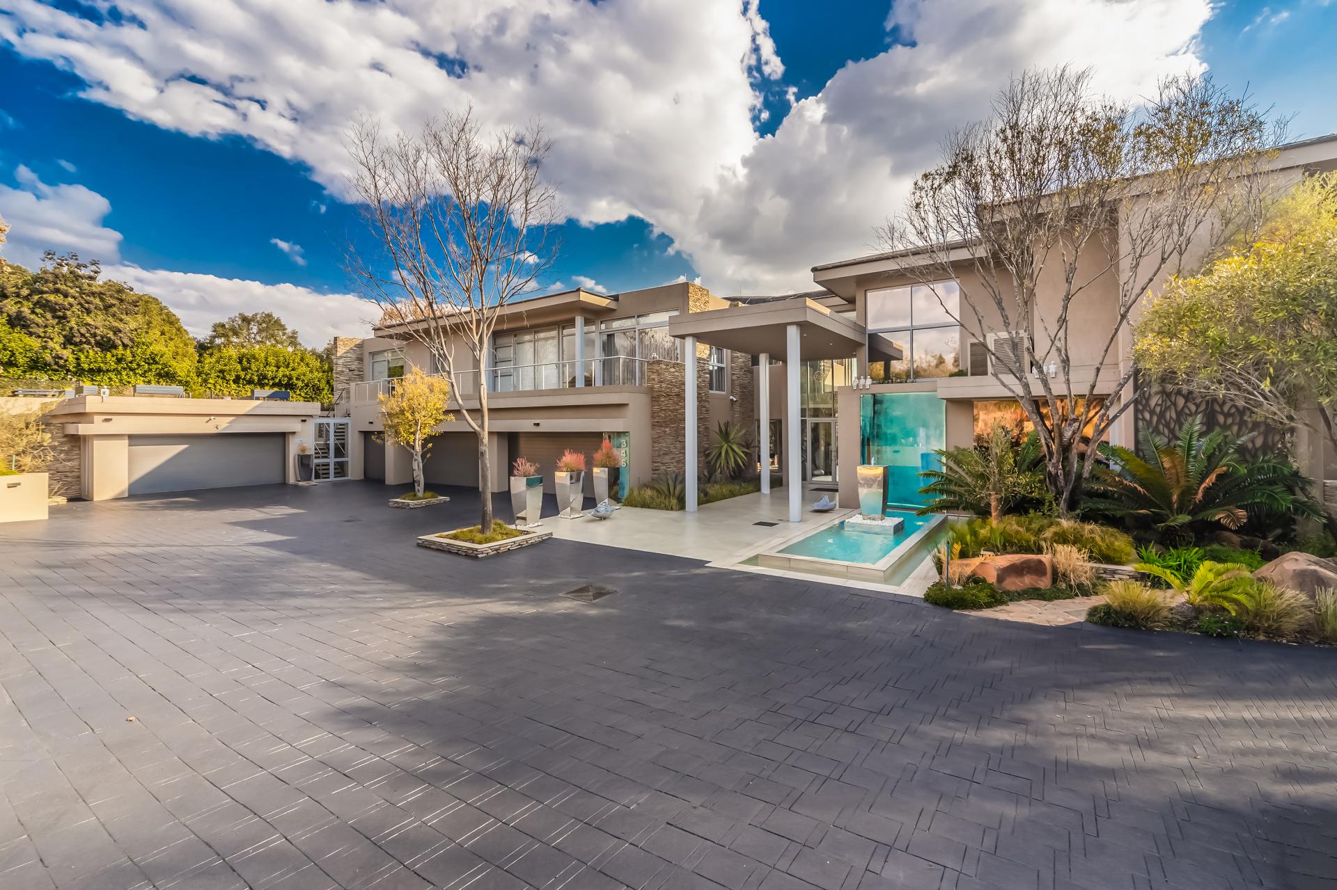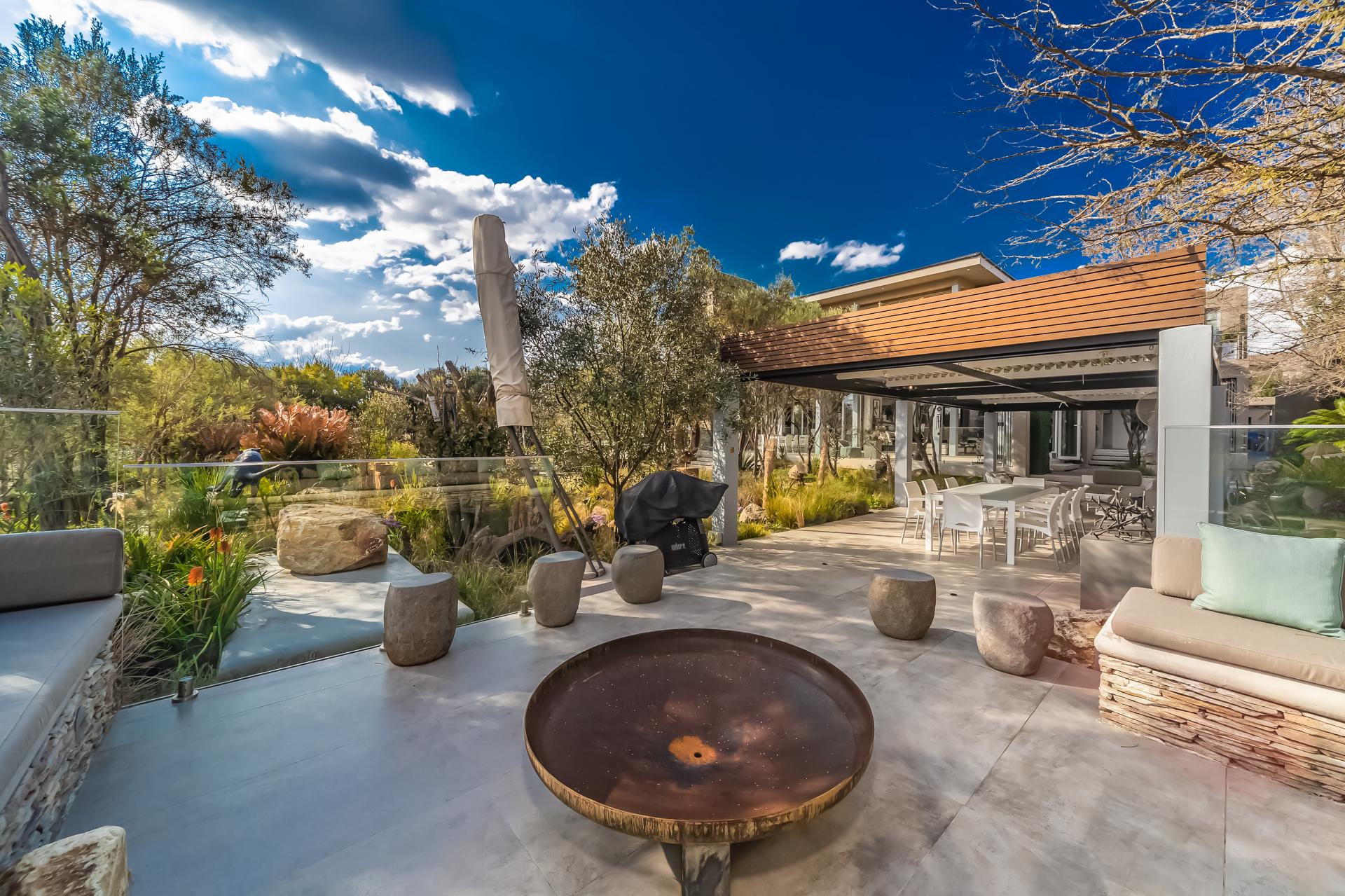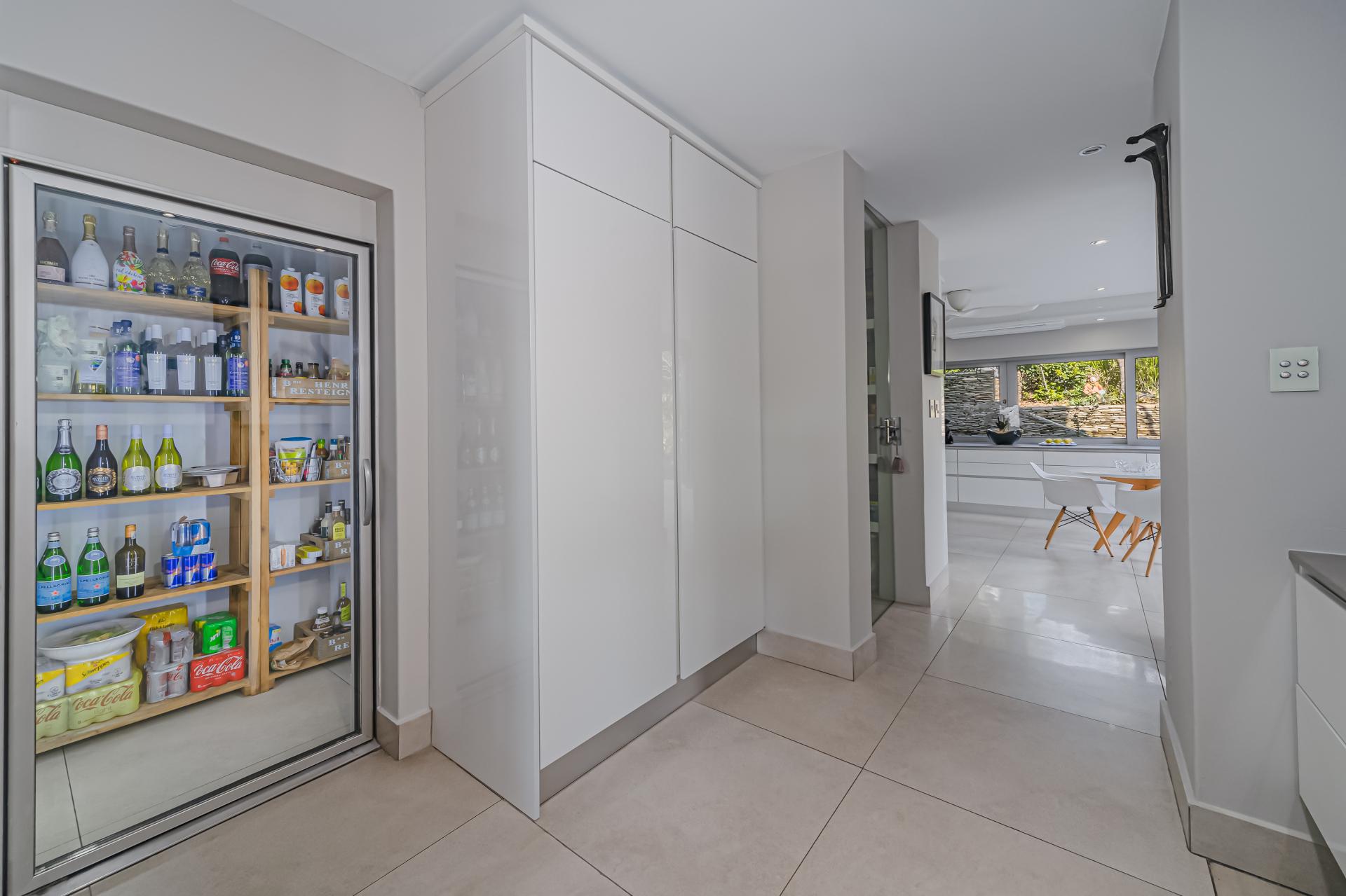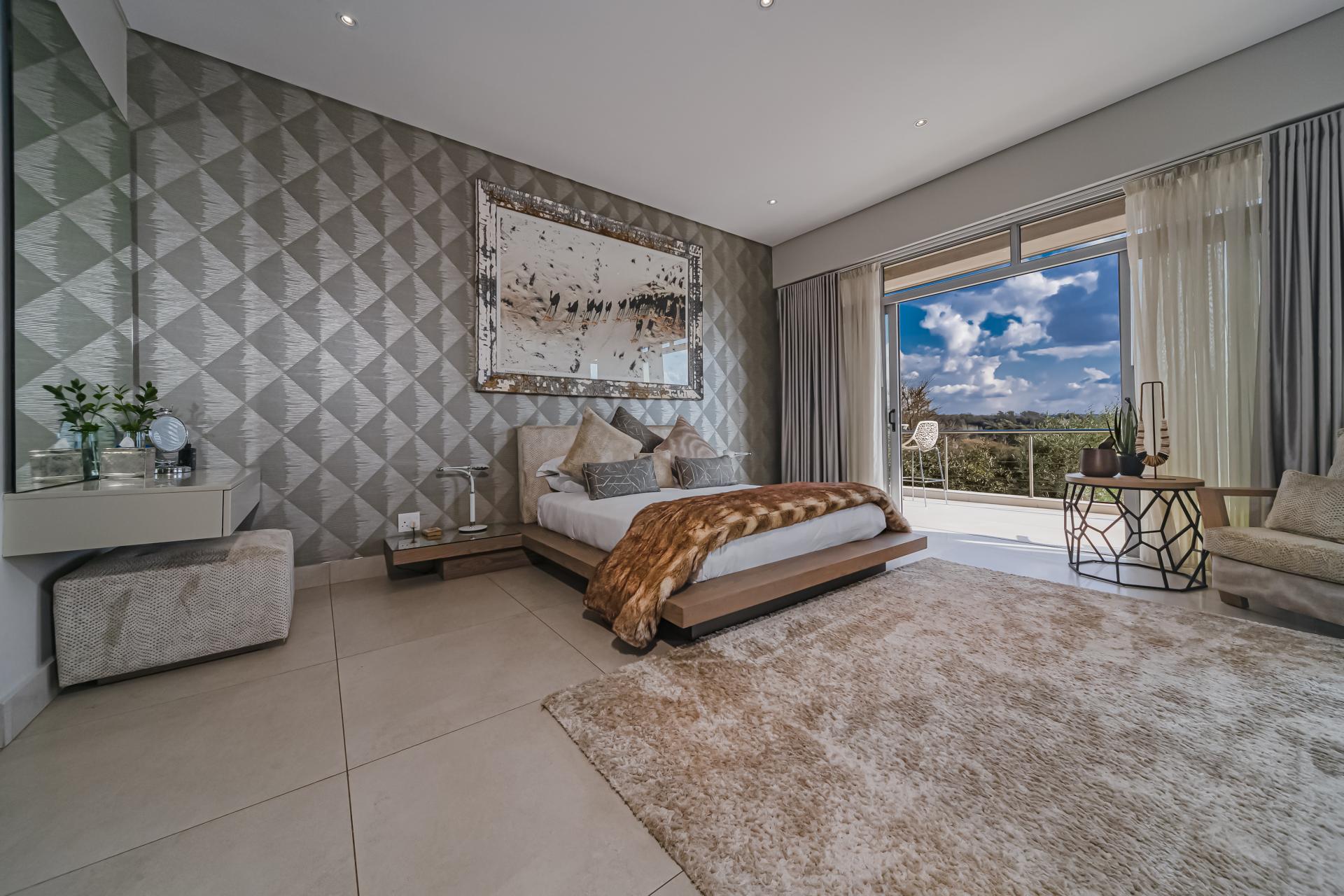 This 1600+sqm home looks onto the championship golf course in Blair Atholl with the Crocodile River across the course and sunsets one goes on holiday to chase. The home is ideal for a big family with 6 bedrooms all en-suite complemented with a massive office space with outdoor meditation area, jacuzzi, pizza oven, multiple entertainment spots, two braai areas, heated swimming pool, designer garden, vegetable garden and two bars – one outside and another stunning feature bar inside. There is also an enclosed Ferrari lounge, a wine room, show kitchen and catering kitchen with Gaggenau appliances, walk in fridge and laundry/scullery. The catering kitchen is a piece of art in itself with the beautiful views, décor and space it offers. At the end of the property is a firepit where views onto the golf course can be enjoyed.