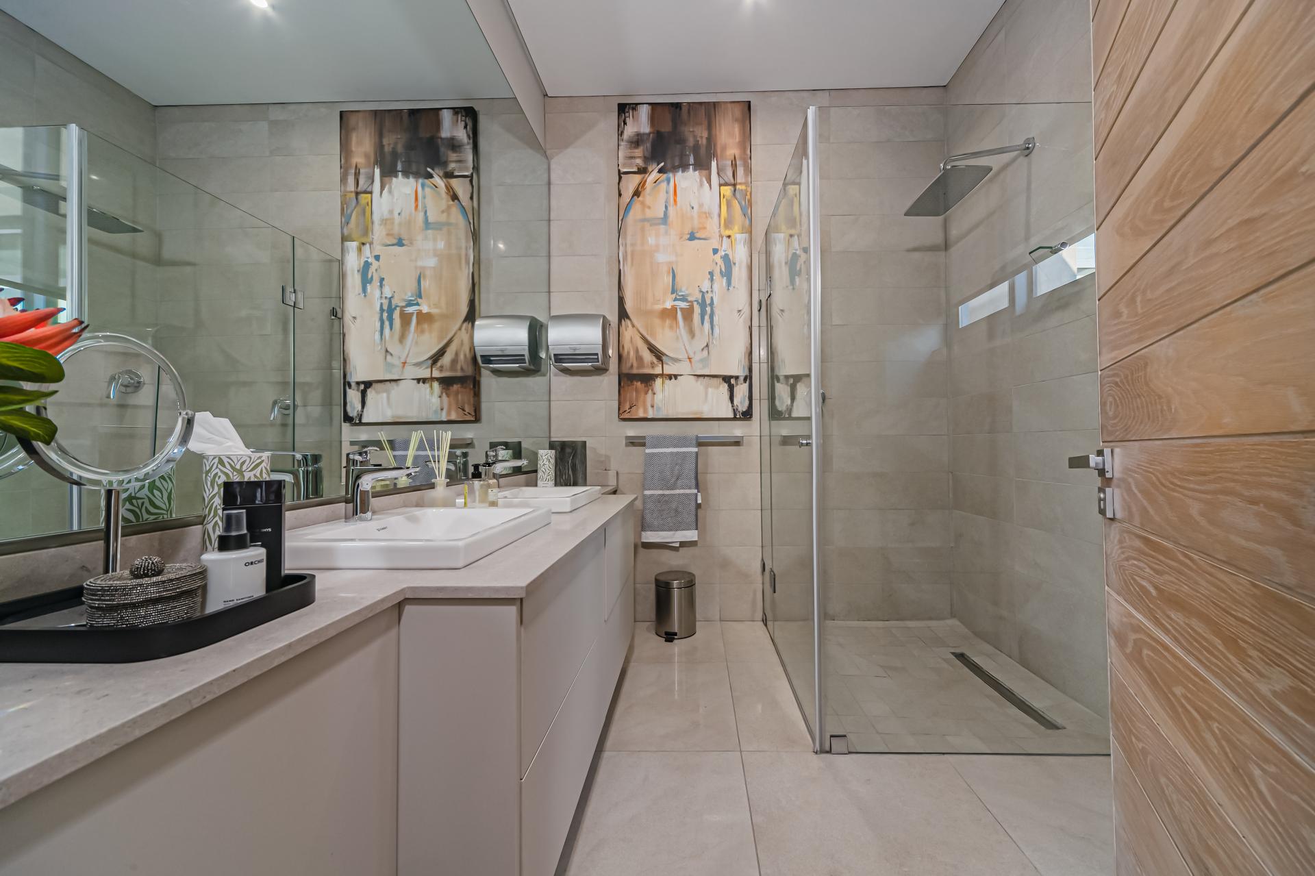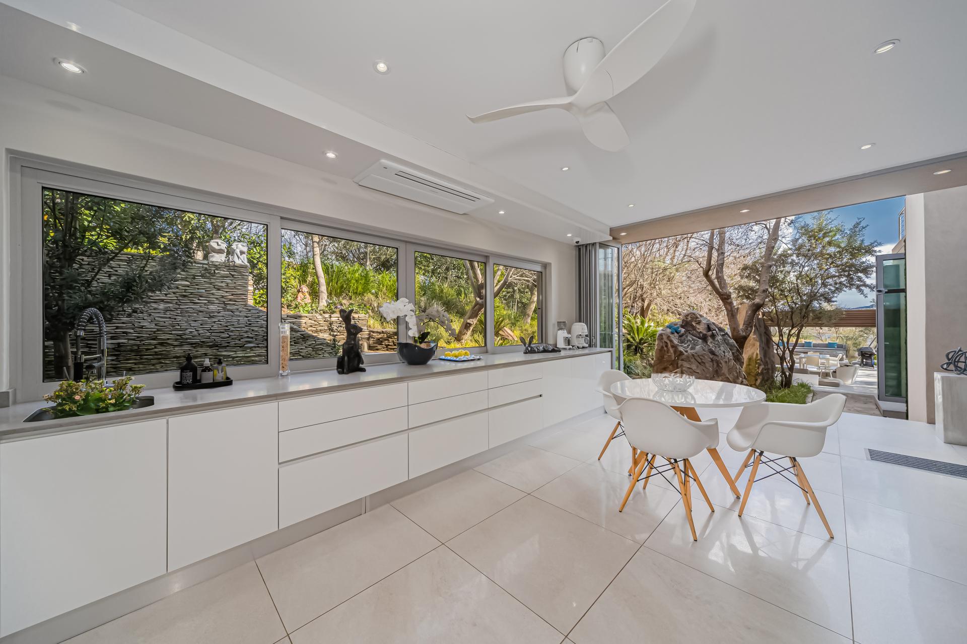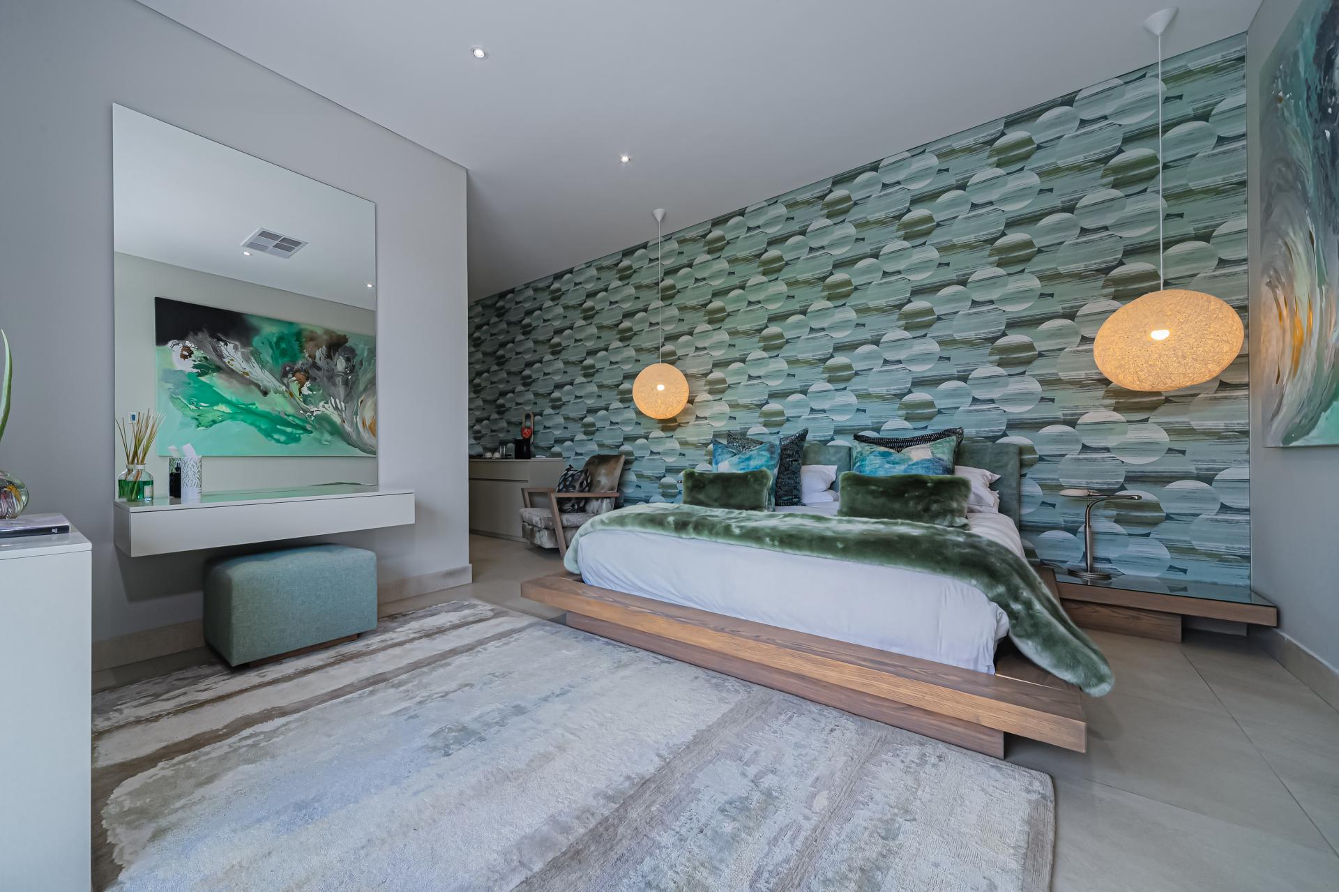 Every bedroom in the home is designed to invoke peace and tranquillity with individual colour themes. There is a guest bedroom with full en-suite bathroom downstairs and five bedrooms upstairs – all beautiful sizes with prime views and large patios. The master en-suite has his and hers dressing rooms and a tranquil bathroom space and large patio to soak up the sun. Light fittings are imported and the furniture is exquisite with artwork to brighten up every single corner with something beautiful to see on every wall. There is also an upstairs boardroom in the house and the 6th bedroom has its own entrance to be converted to a separate cottage or office space. The property is offered fully furnished.