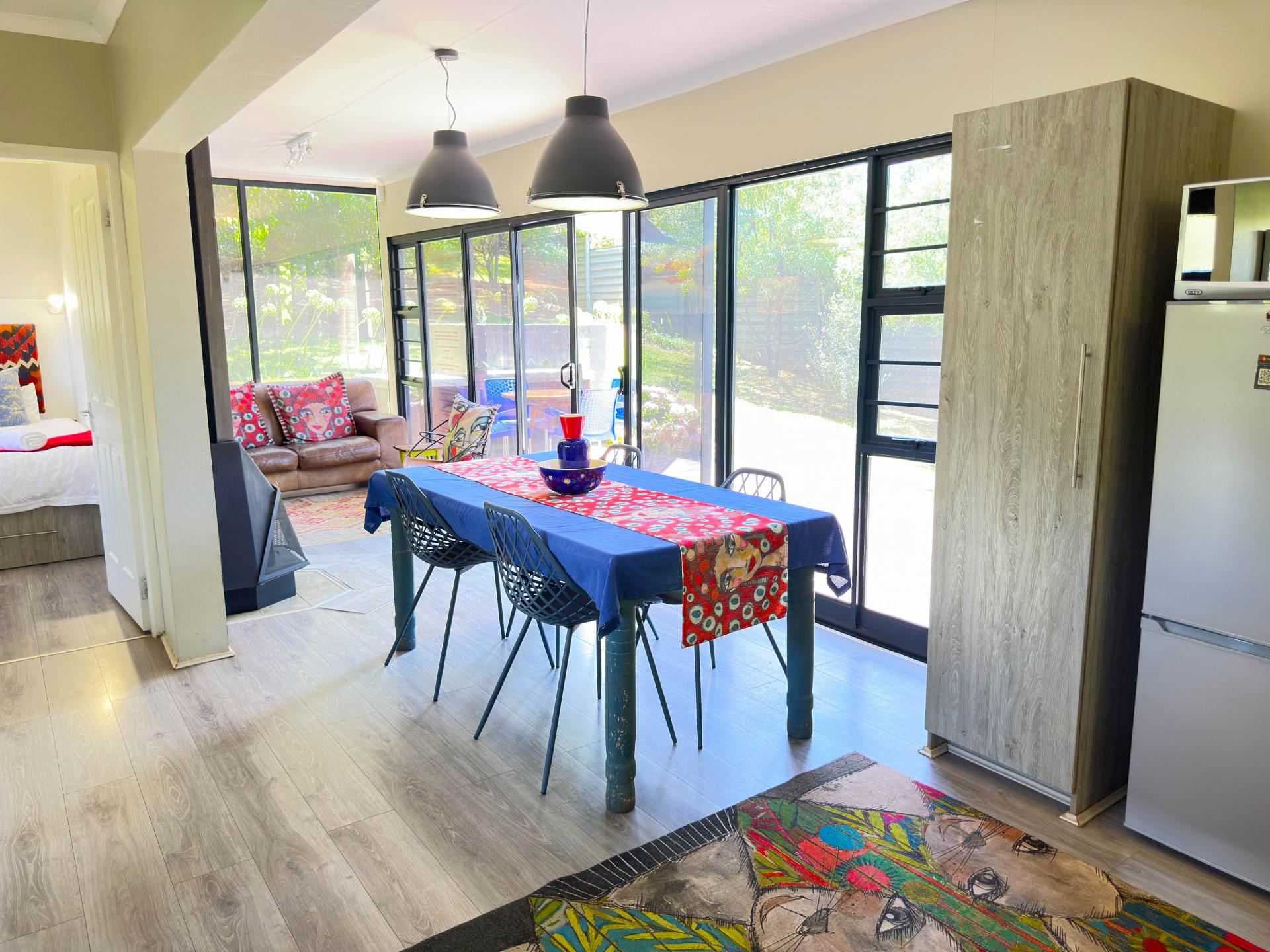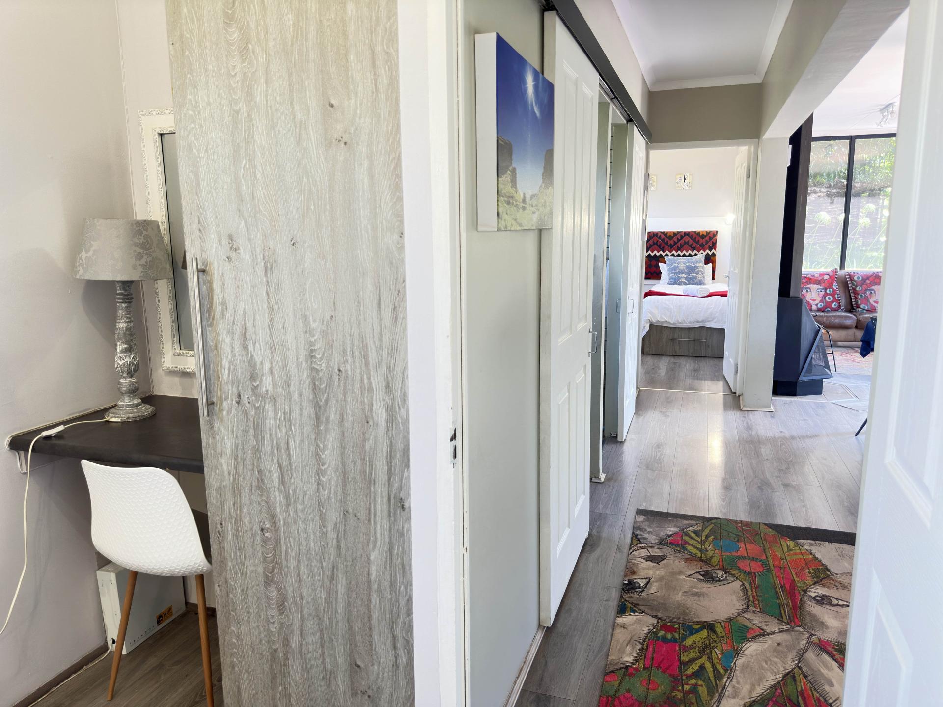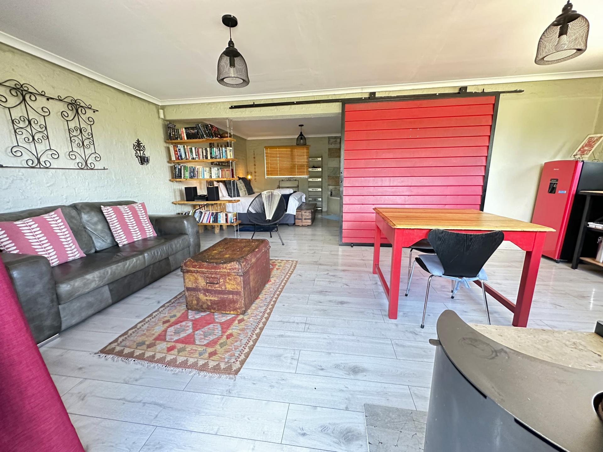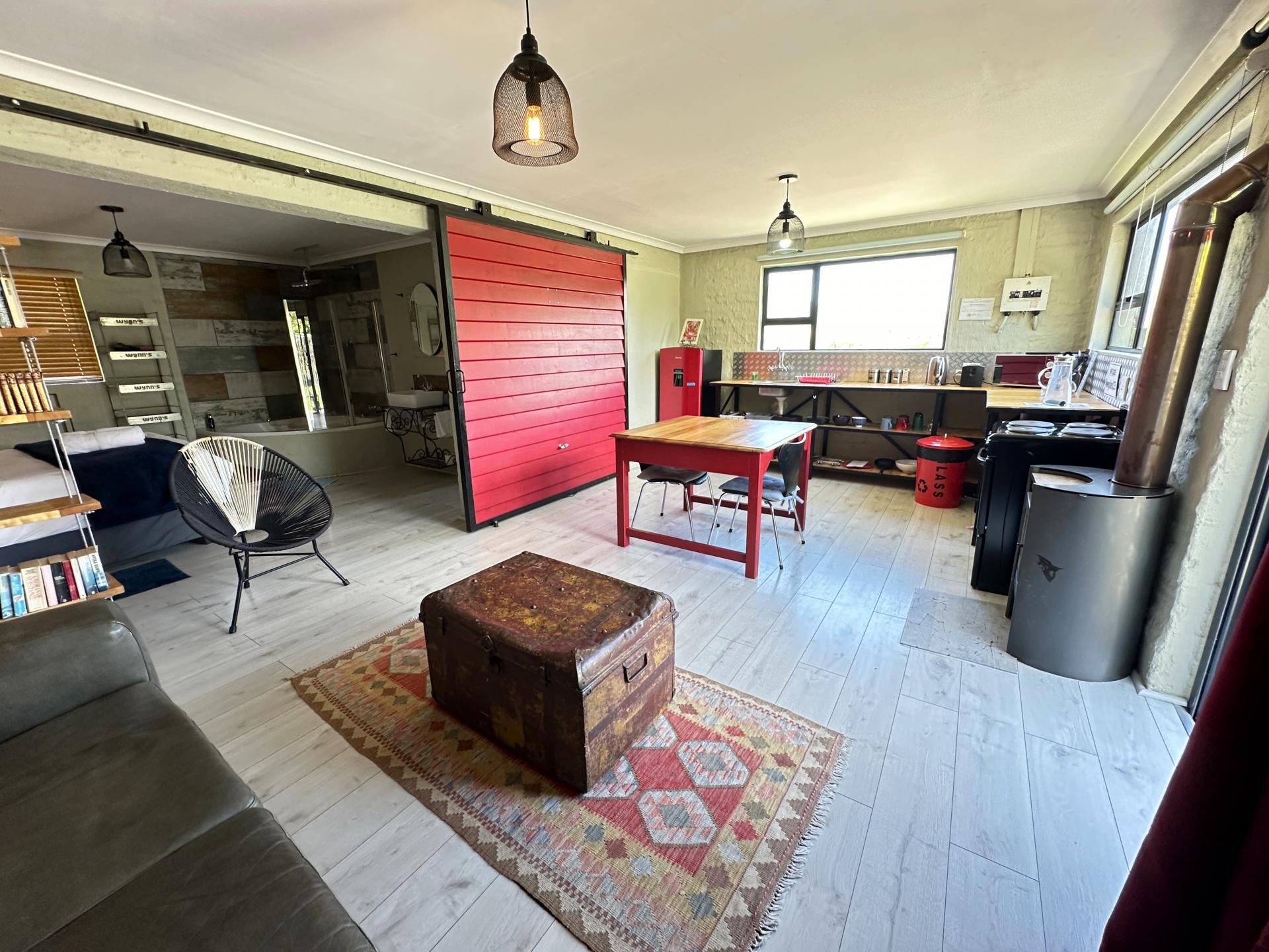 A charming and intimate studio apartment designed for two—an ideal hideaway for couples seeking romance and relaxation. Behind its signature red sliding door lies an elegant space with a queen-sized bed, a luxurious corner bathtub, a wood-burning fireplace, and a fully equipped kitchen. Sliding doors open to a private patio with seating and Weber braai, all framed by sweeping mountain scenery.